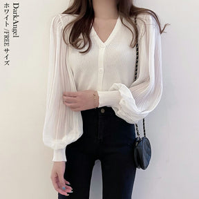 【 シフォンバルーンスリーブニットトップス 】 プリーツの入ったバルーンスリーブがかわいいニットトップス。 透け感のあるシフォン素材のぽわん袖で着映えを叶えてくれます。 身頃はシンプルなリブニットで甘すぎず、バランスの取れた一着。 デニムを合わせてカジュアルダウンも◎ 普段使いはもちろん、お呼ばれなどの 華やかなシーンにも活躍するアイテムです。 |