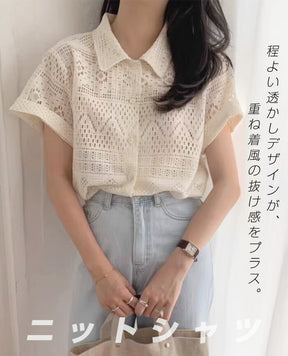 透かし編み半袖ニットシャツ
