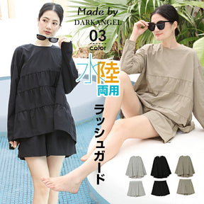 | 【 水陸両用ティアードラッシュガード上下セット 】 ティアードデザインが今年らしいラッシュガード。 ふわっとシルエットが女性らしさをUP&さりげなく体型カバー◎ 長袖にフィンガーホール付き!日焼け対策も手の甲までしっかり! ショートパンツは太もも周りを広めにすることで美脚効果抜群! ポケット付きなのもうれしいポイント! 水陸両用で使えるから、お家からプールまで 着替えずにそのままGOできる優秀なセットです! |