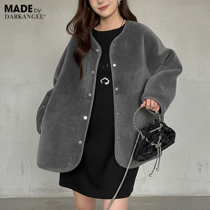 昨年大人気だったリバーシブルアウターが、お客様の声にお応えしポケットを追加して再登場! さらにサイズ展開もM/Lの2サイズ展開にバージョンアップしました。 ボア(エコファー)面とスエード調(フェイクムートン)面の2WAYリバーシブルで着用できる、 着回し力抜群のノーカラージャケットです。 表側:ポリエステル100%、裏側:ポリエステル100%のフェイクムートン素材を使用し、 見た目に反して軽くて暖かいのが最大の魅力。 さっと羽織れるショート丈で、スカートにもパンツにも合わせやすい絶妙な丈感です。 カーディガン感覚で気軽に羽織れるゆったりとしたシルエット(オーバーサイズ)で、 厚手のニットの上からも着用可能。真冬の防寒対策にもおすすめの本格アウターです。 カラーは、定番のブラック、トレンドのブラウン、シックなダークブラウン、上品なグレーの4色展開。 家庭洗濯不可のため、お手入れの際はクリーニングをご利用ください。 【素材感・着心地】 表側:ポリエステル100%、裏側:ポリエステル100%のフェイクムートン素材。 ボア面は毛足が短く柔らかい肌触りで、カジュアルで暖かみのある印象。 スエード調面は滑らかでマットな質感で、上品で大人っぽい印象。 見た目のボリュームに反して非常に軽量で、肩が凝りにくい快適な着心地。 裏地のボアが内側になるため、保温性が高く真冬の寒さもしっかりカバーします。 【シルエット・サイズ感】 ヒップにかかるミドル丈設計。 身幅や袖周りにゆとりを持たせたオーバーサイズ/ゆったりシルエット。 中に厚手のインナーやセーターも着込めます。 ノーカラー(襟なし)のデザインが首元をすっきりと見せ、タートルネックやマフラーとの相性も抜群。 MサイズとLサイズの2サイズ展開になり、ご自身の体型や着こなしに合わせて選べるようになりました。 【着回し&コーデ提案】 ボア面着用時: カジュアルな印象なので、デニムやスキニーパンツと合わせたデイリーな着こなしに。 ミニワンピースやロングブーツと合わせると可愛らしいフェミニンカジュアルが完成します。 スエード面着用時: きれいめな印象なので、プリーツスカートやストレートパンツと合わせて通勤やオフィスカジュアルにも使えます。 ハイネックニットをインナーにすると、大人っぽいシックなスタイルに。 ノーカラーなので、パーカーやフード付きのアイテムともレイヤードしやすく、 様々なテイストのコーディネートを楽しめます。 |