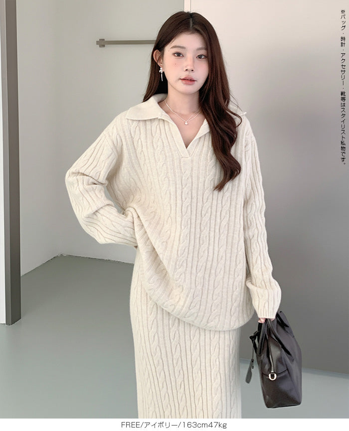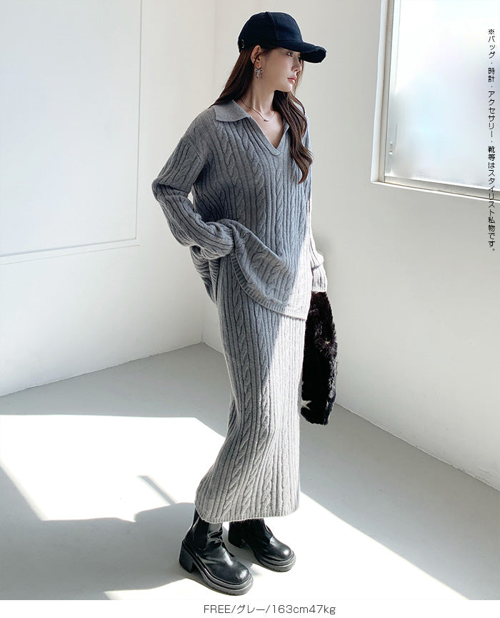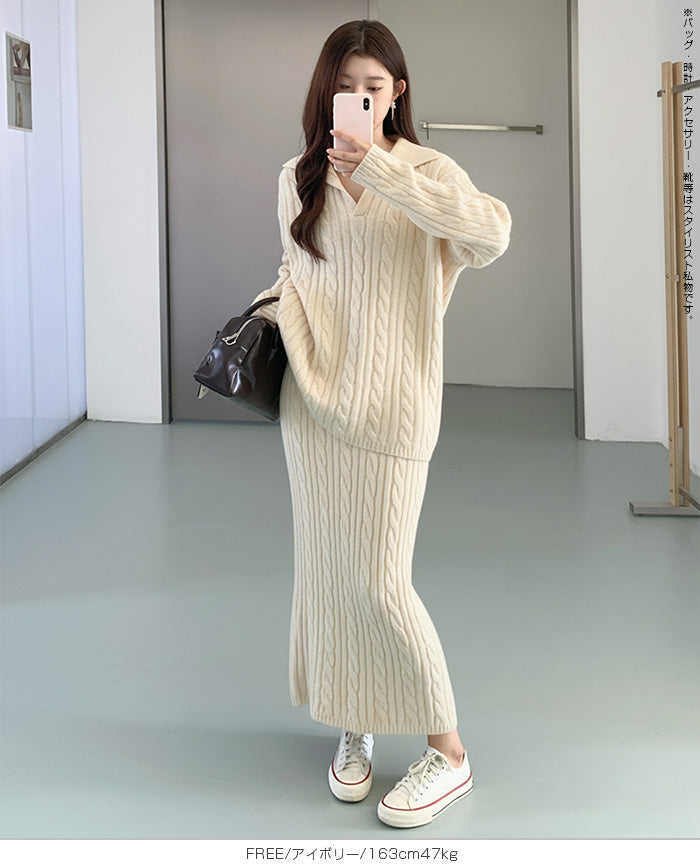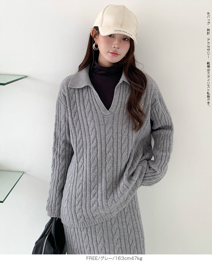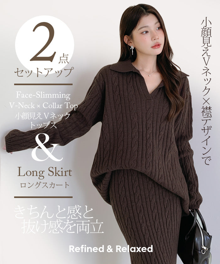トップスはVネック×襟付きデザインで小顔効果もあり、