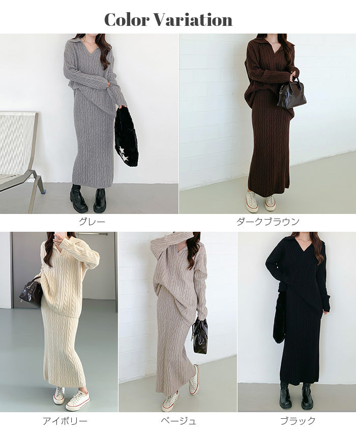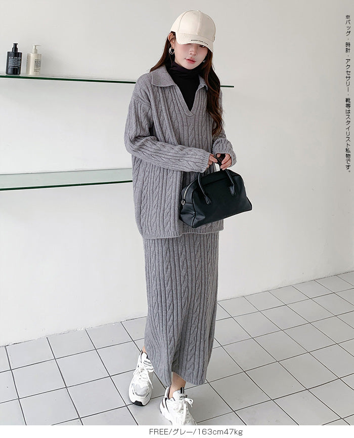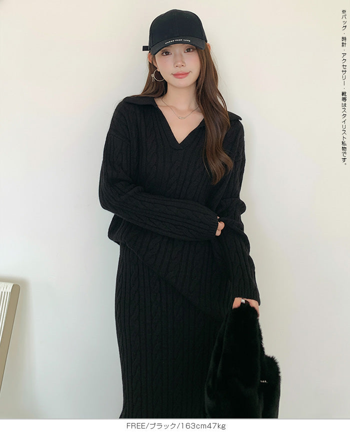 トップスは顔周りがすっきり見える襟付きVネックデザインで、