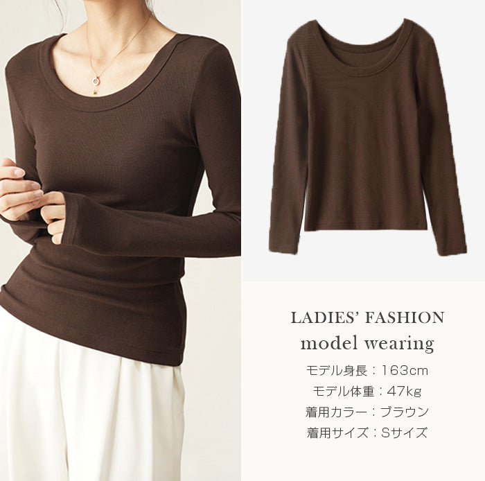【 Uネック裏起毛リブカットソー 】 見た目はすっきり、着心地はふんわり。 リブ編みの程よいフィット感と、裏起毛のあたたかさを両立したUネックカットソー。 1枚でもインナーとしても使える万能アイテムです。 上品なリブ素材がボディラインを美しく見せ、 ふんわり裏起毛が冬の寒さからやさしく包み込みます。 重ね着してももたつかず、着ぶくれ知らずのスマートなシルエット。 デイリーにもオフィスにも、秋冬のワードローブに欠かせない一枚です。 《商品ポイント》 ・なめらかで柔らかな裏起毛仕様 ・肌触りの良いレーヨン混リブ生地 ・ボディラインを拾いにくい程よいフィット感 ・開きすぎないUネックで上品な印象 ・インナーにも1枚着にも使える着回し力 《デザイン・シルエット》 ・女性らしい丸みを引き立てるUネックライン ・リブの縦ラインでスタイルアップ効果 ・身体に沿いながらも締め付け感のない伸縮素材 ・すっきり細見えのキレイシルエット設計 ・長め袖丈で手元までぬくもり感をプラス 《コーディネート提案》 ・テーラードジャケットやカーディガンのインナーに ・ワイドパンツやタイトスカートと合わせてきれいめカジュアルに ・デニムやジョガーパンツでデイリーなリラックスコーデに ・ジャンスカやサロペットのインナーとしてもおすすめ ・首元のUラインに華奢なネックレスを添えて、フェミニンな印象に 《サイズ・カラーバリエーション》 サイズ:S / M / L / XL / 2XL カラー:ブラック / ホワイト / ブラウン / モカ / ダークグレー 《素材・機能性》 ・素材:レーヨン92%、ポリウレタン8% ・透け感:なし ・伸縮性:若干あり ・厚み:普通 |
