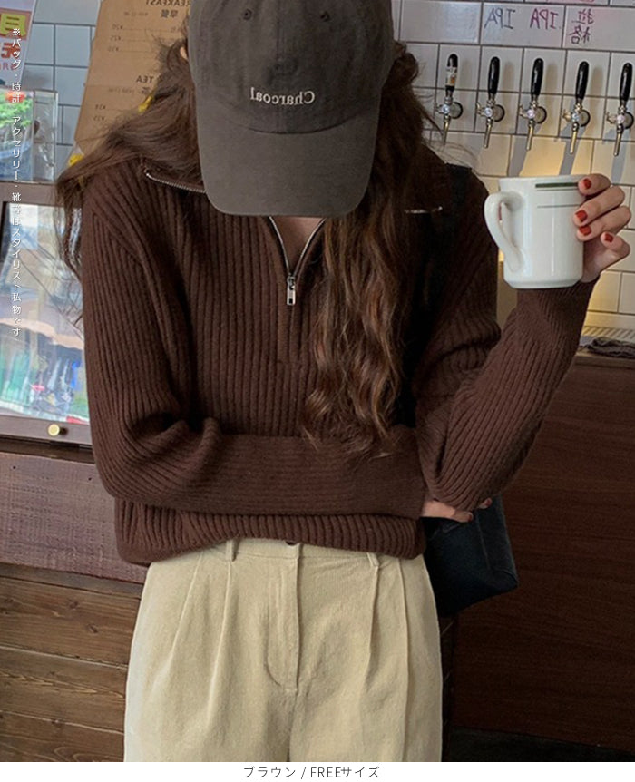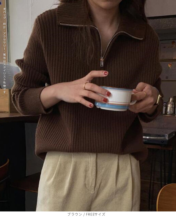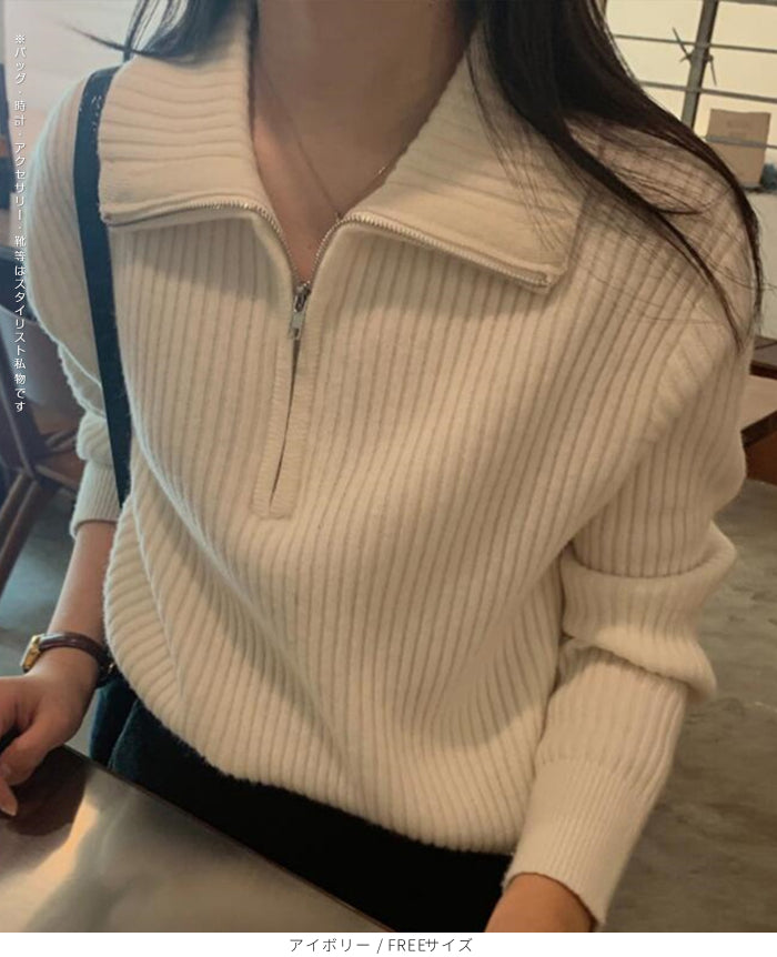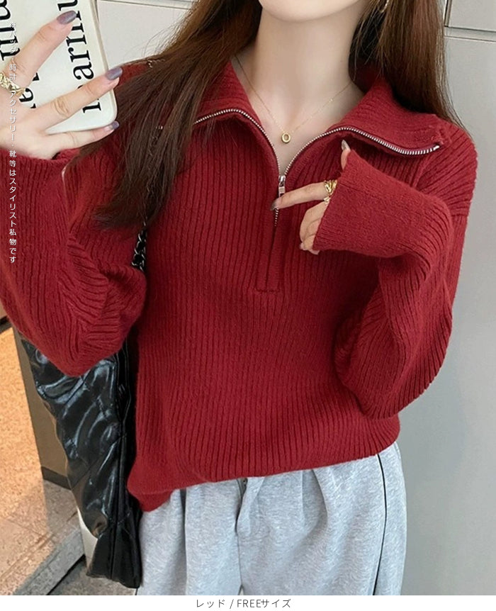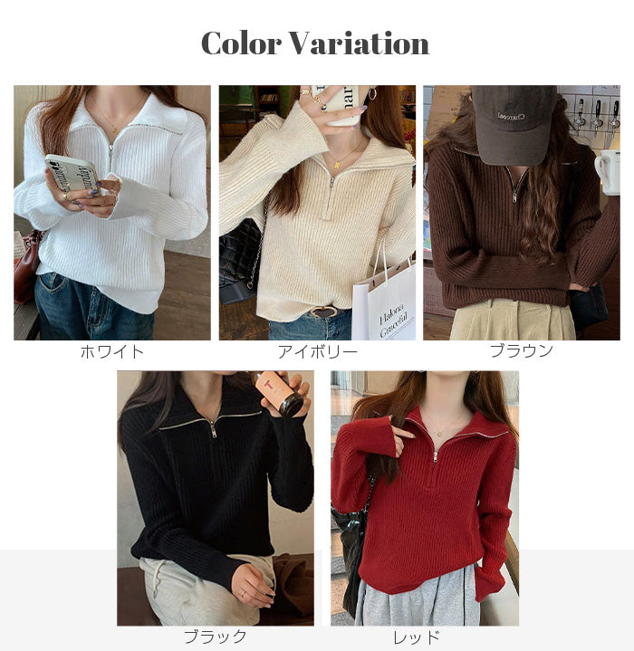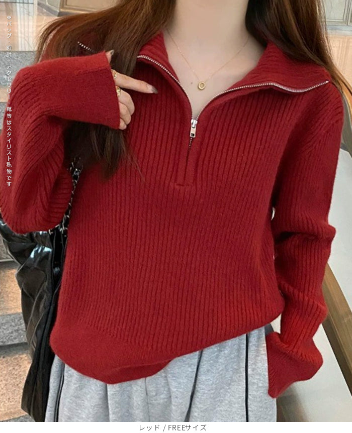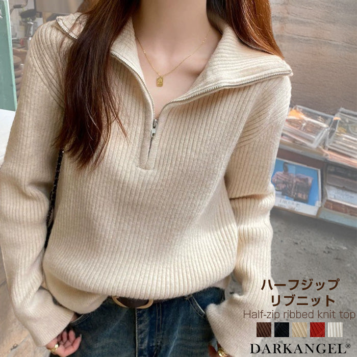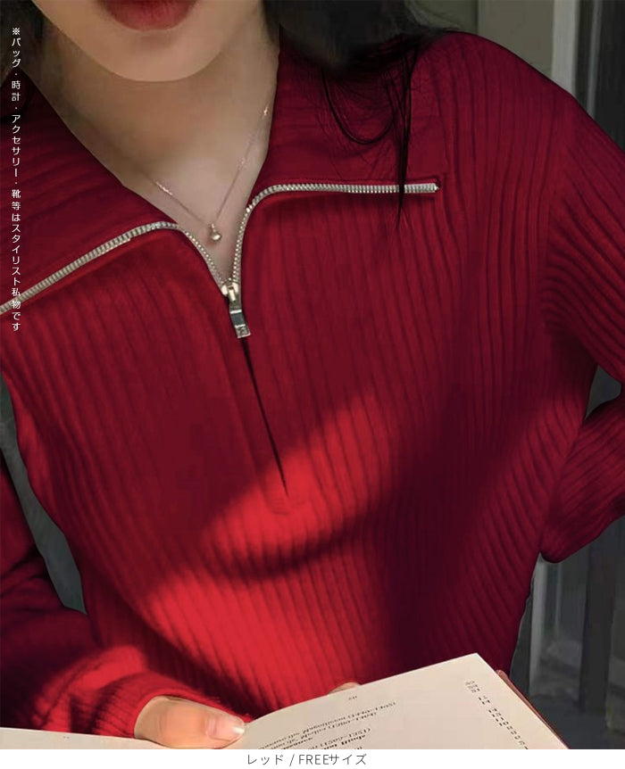 リブニット ハーフジップ ファスナー 襟付き 長袖 レディース セーター トップス プルオーバー ポロニット ハイネック タートルネック 白 黒 赤 ブラウン アイボリー【ハーフジップリブニット】