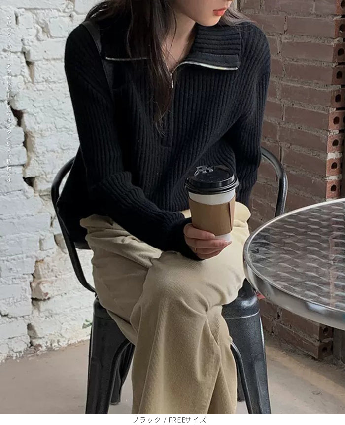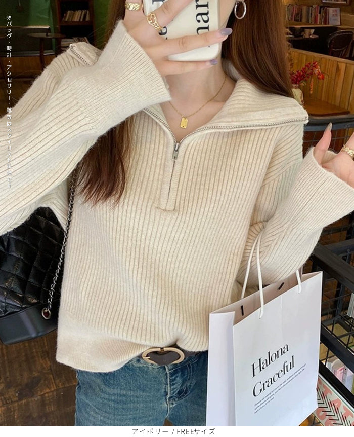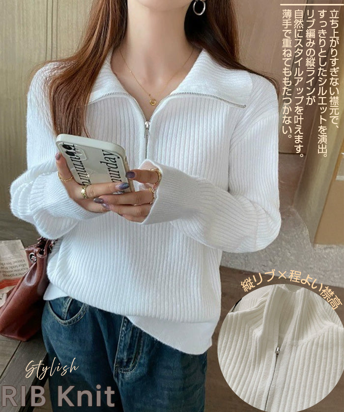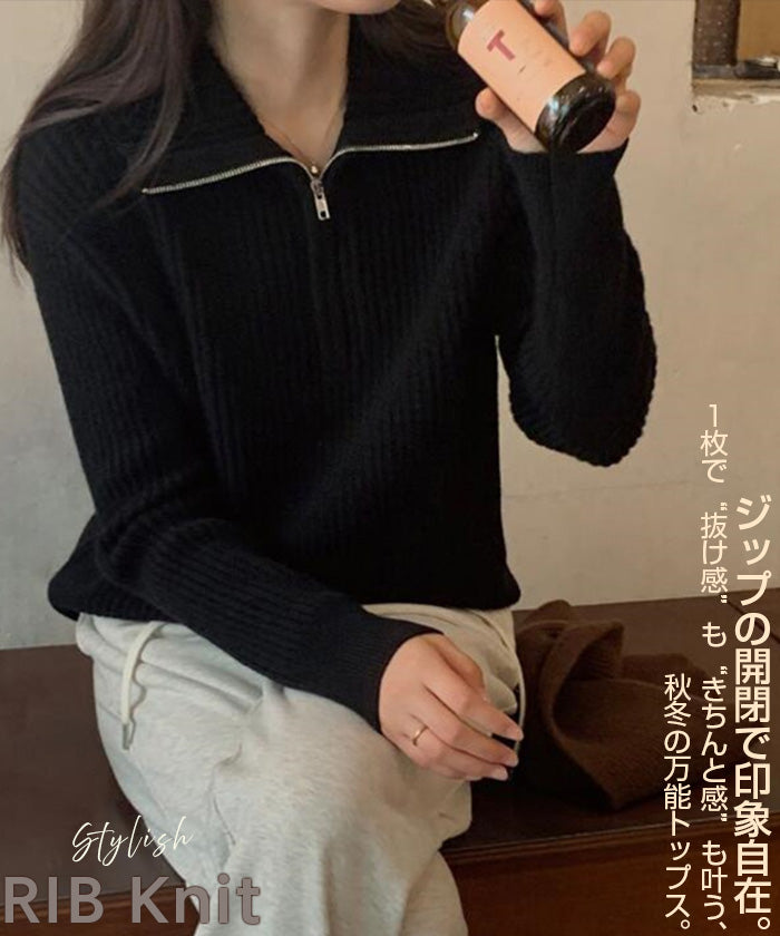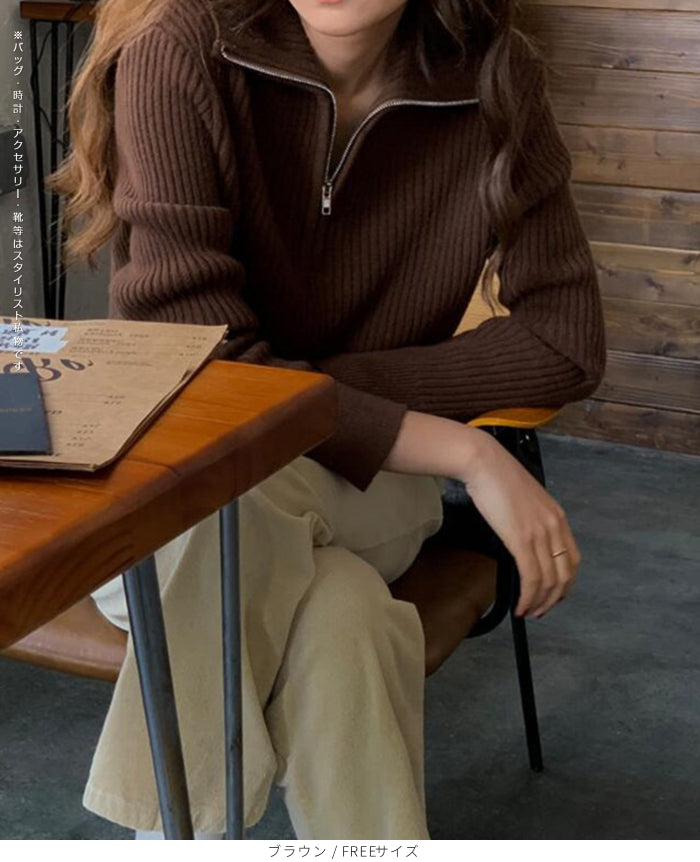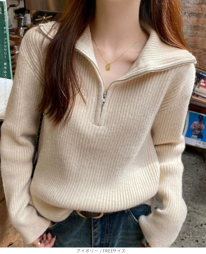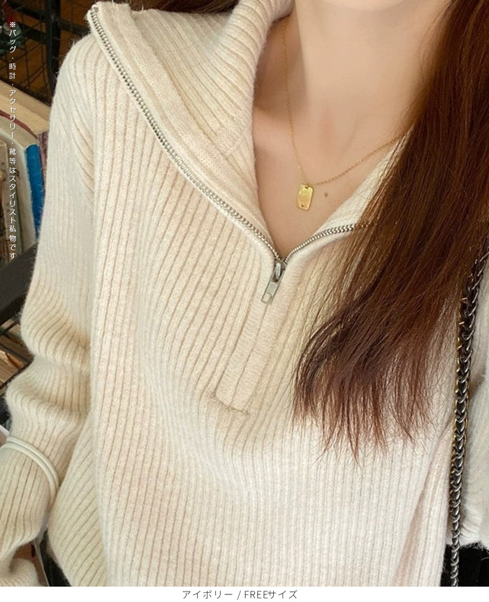 リブニット ハーフジップ ファスナー 襟付き 長袖 レディース セーター トップス プルオーバー ポロニット ハイネック タートルネック 白 黒 赤 ブラウン アイボリー【ハーフジップリブニット】