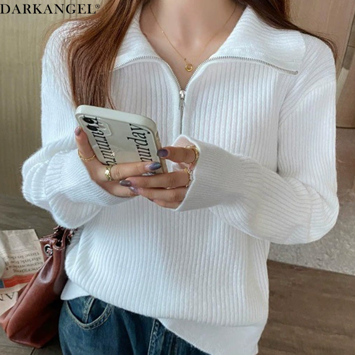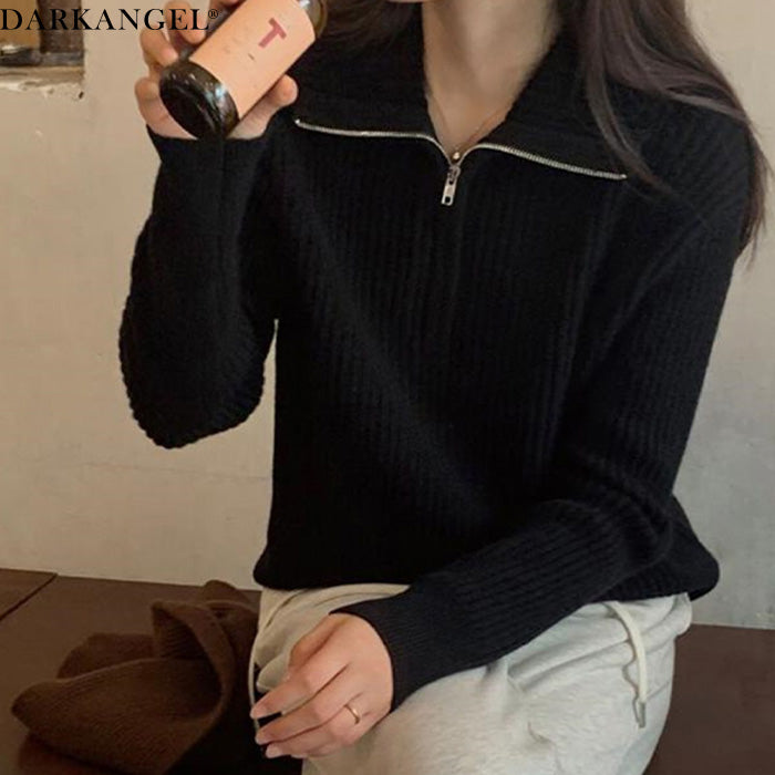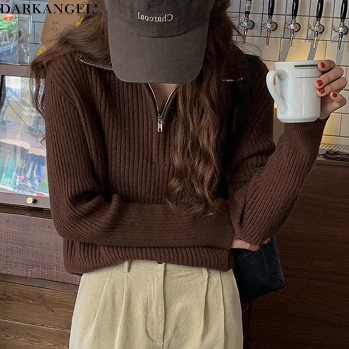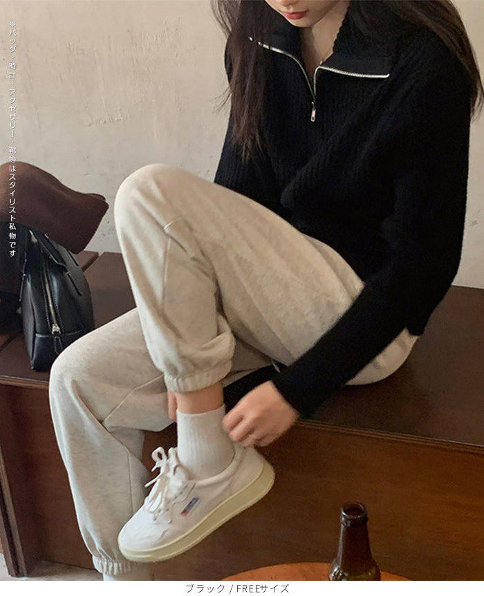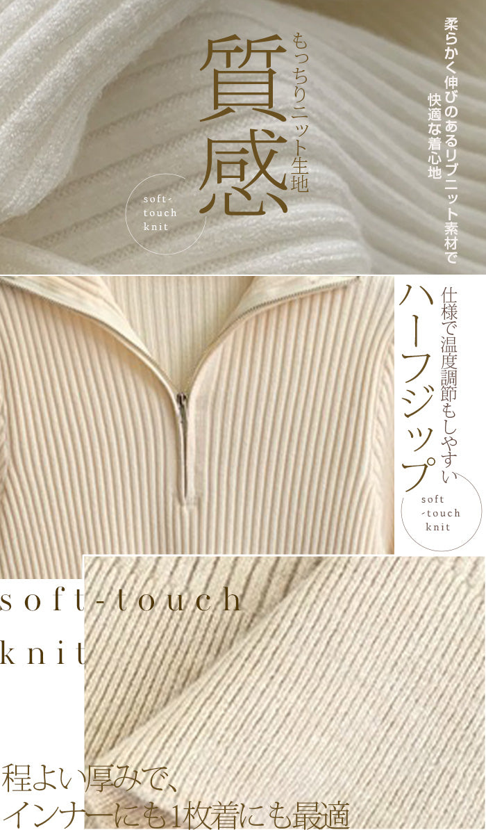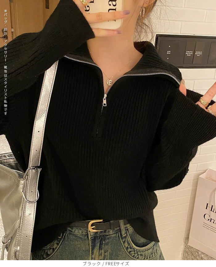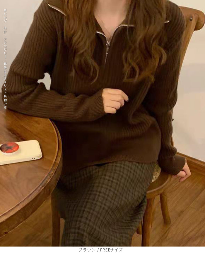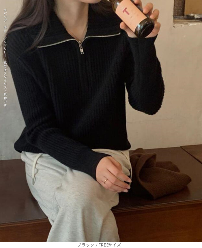 リブニット ハーフジップ ファスナー 襟付き 長袖 レディース セーター トップス プルオーバー ポロニット ハイネック タートルネック 白 黒 赤 ブラウン アイボリー【ハーフジップリブニット】