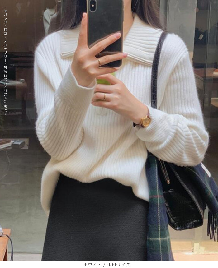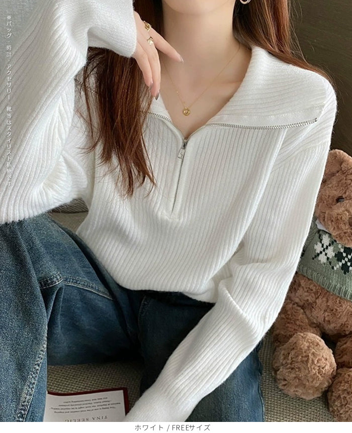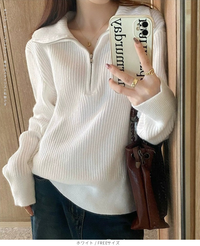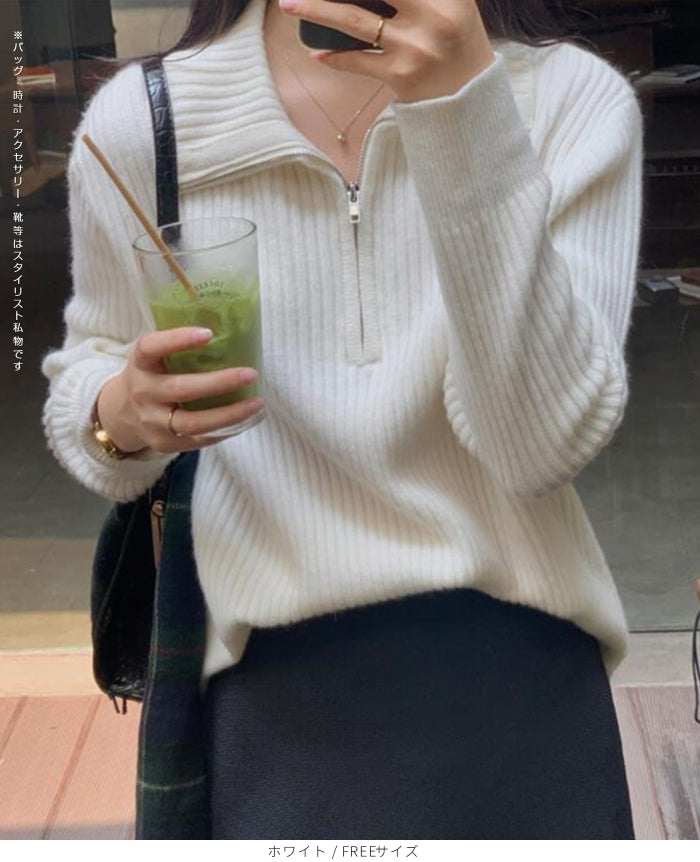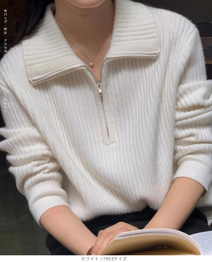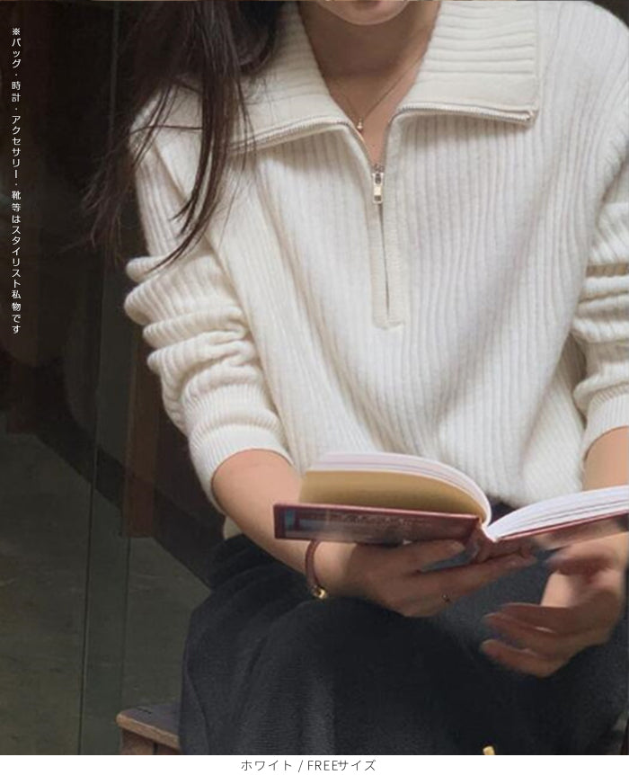 リブニット ハーフジップ ファスナー 襟付き 長袖 レディース セーター トップス プルオーバー ポロニット ハイネック タートルネック 白 黒 赤 ブラウン アイボリー【ハーフジップリブニット】 - FREE / ホワイト ...は取り寄せ中で入荷次第発送します。