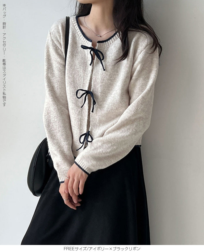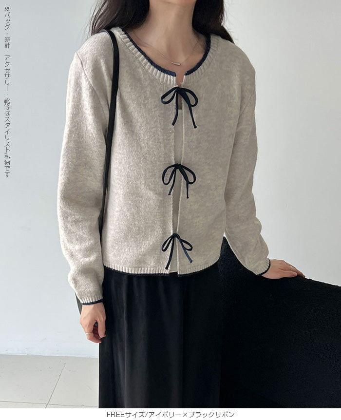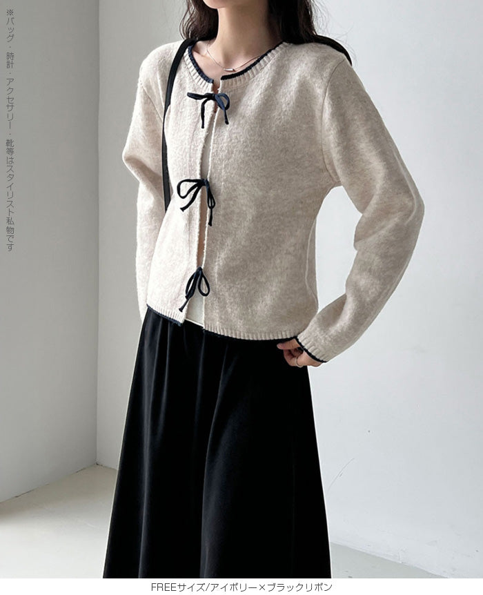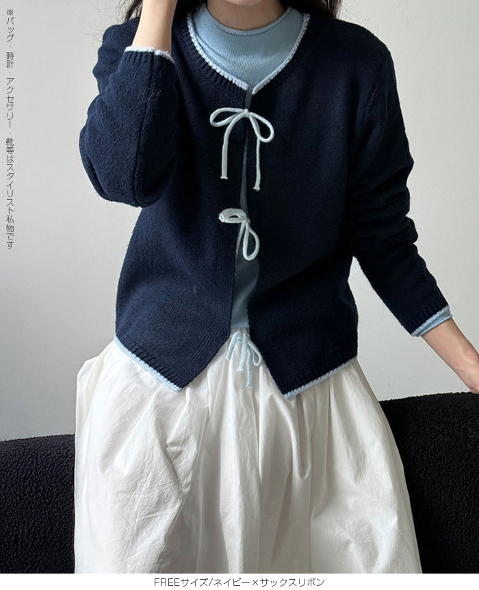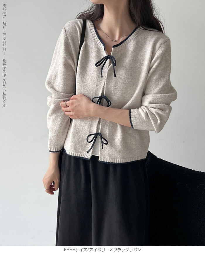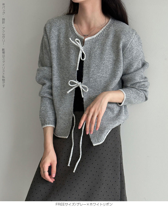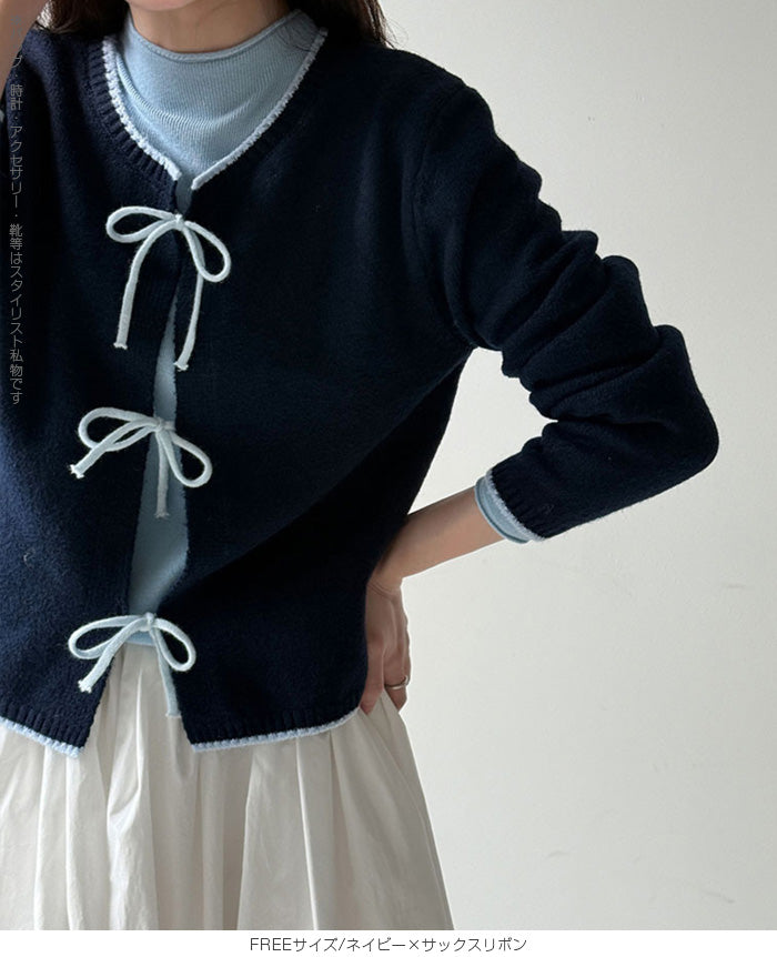愛らしいフロントリボンが印象的な配色ニットカーディガン。