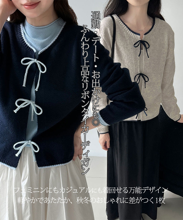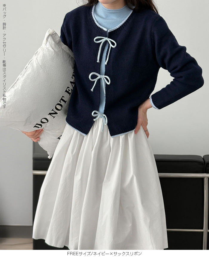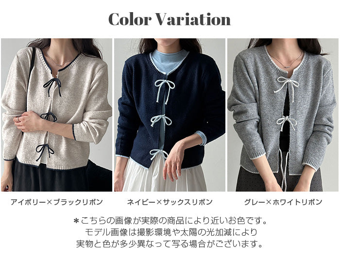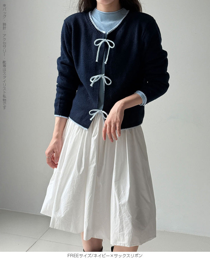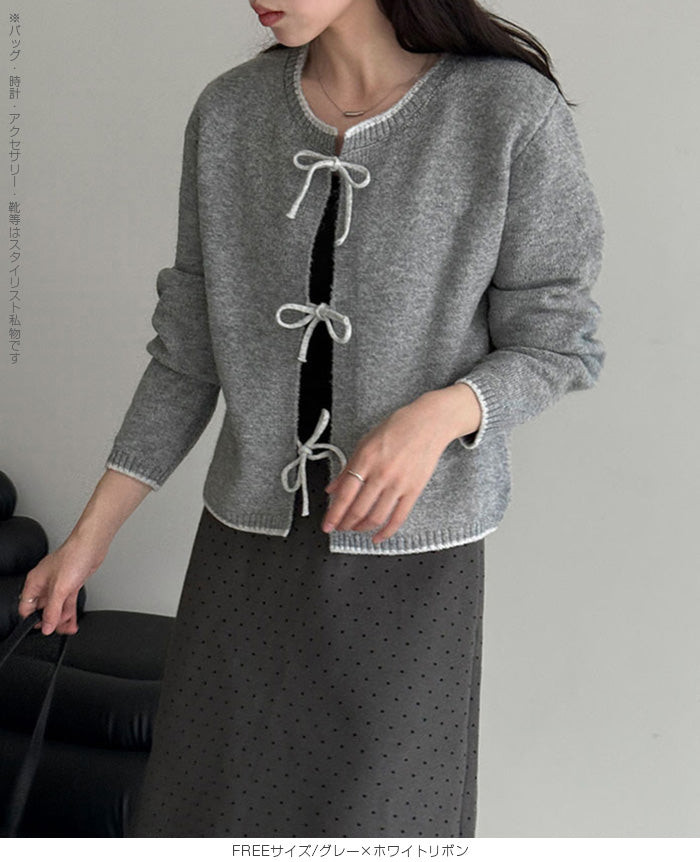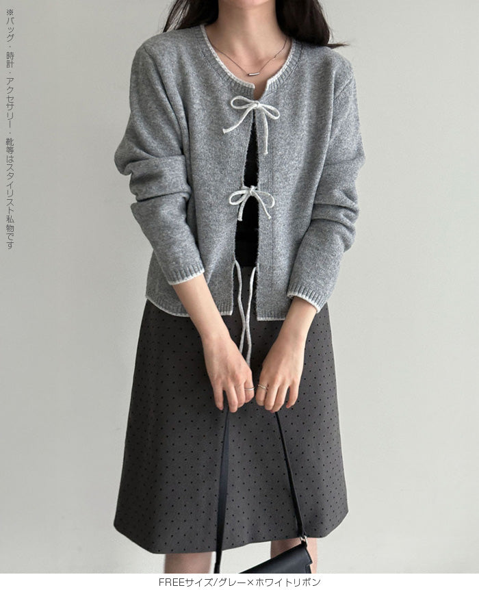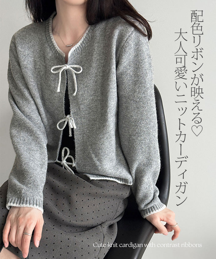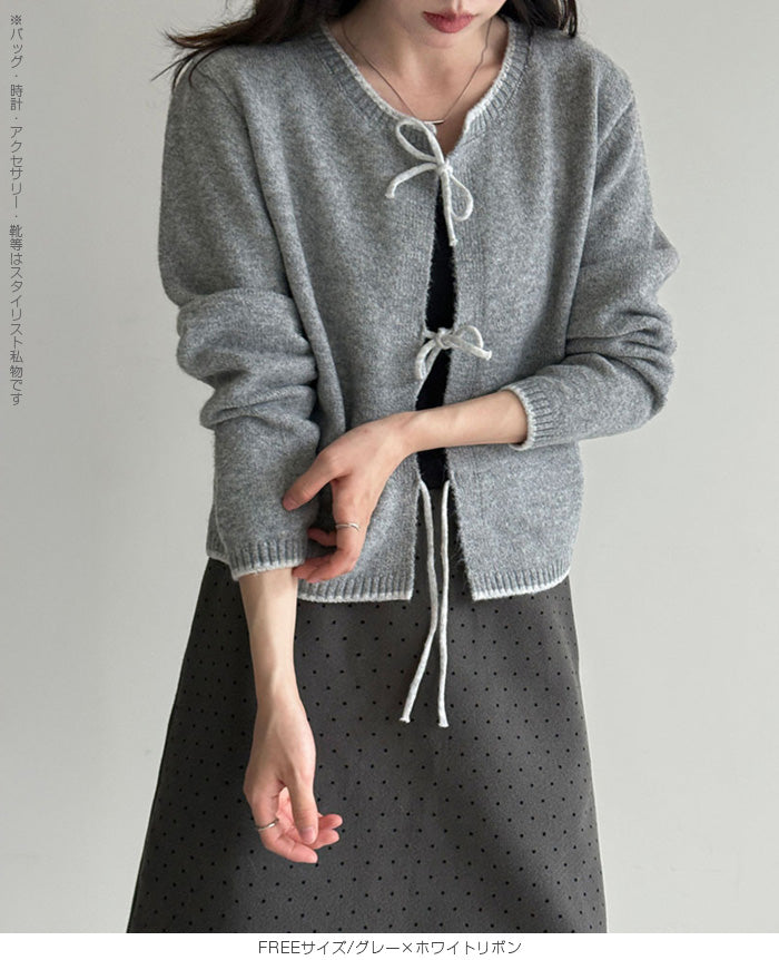 愛らしいフロントリボンが印象的な配色ニットカーディガン。