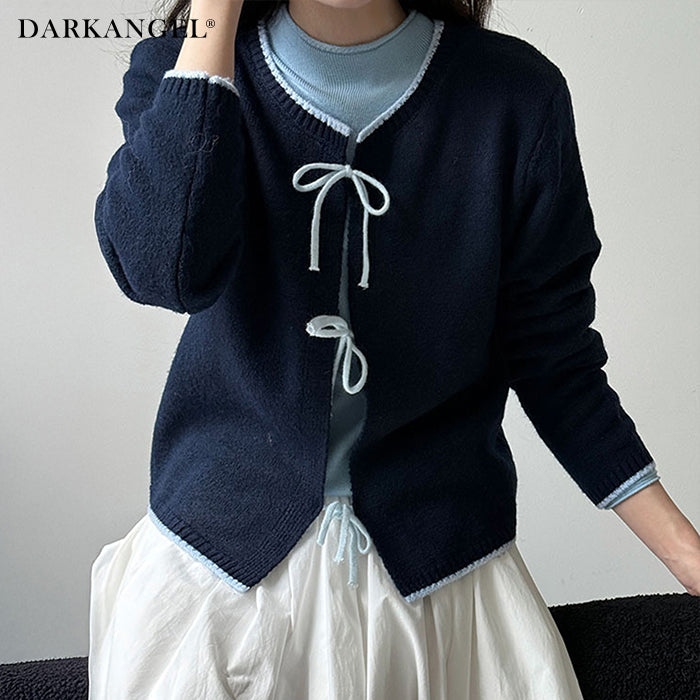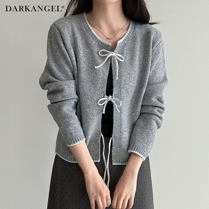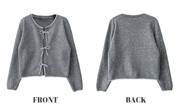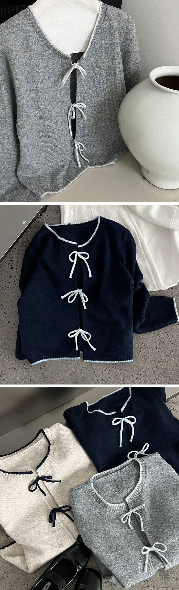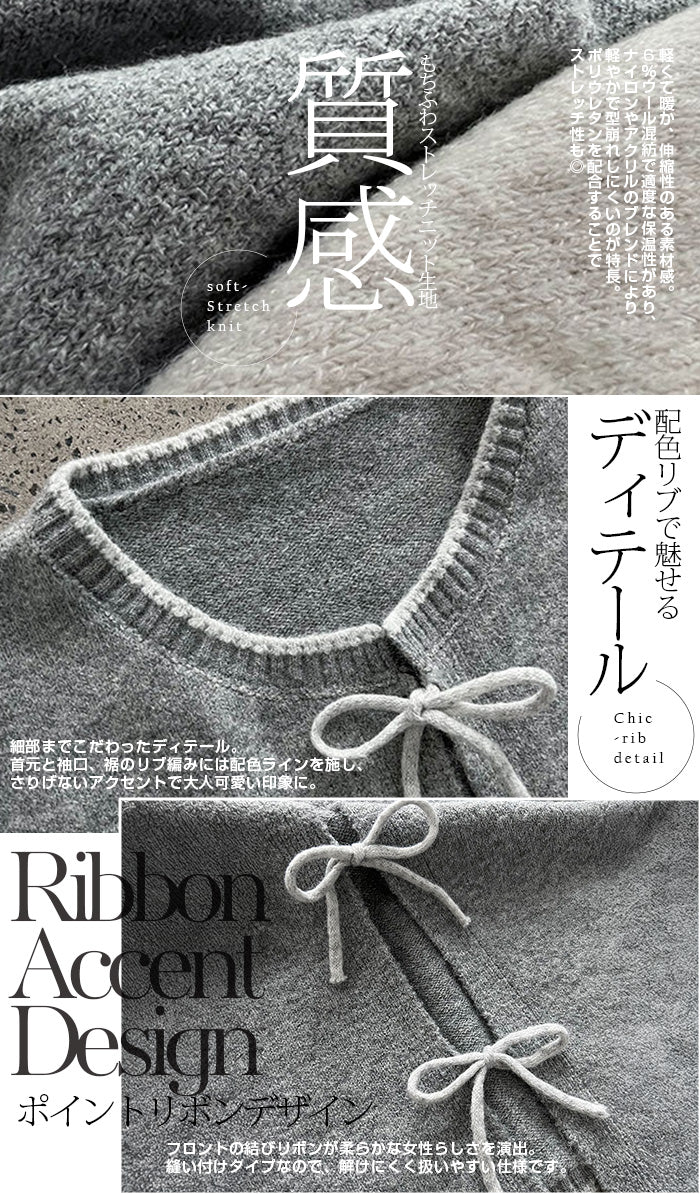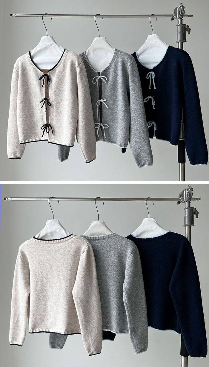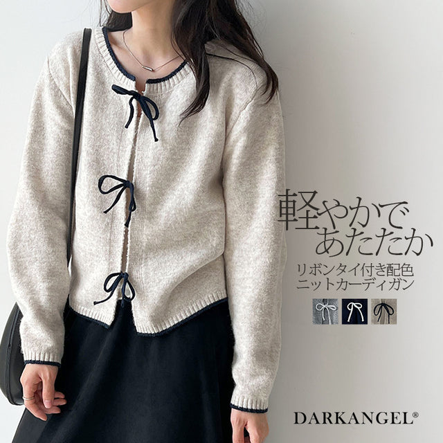 愛らしいフロントリボンが印象的な配色ニットカーディガン。