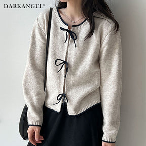 リボンタイ付き配色ニットカーディガン