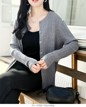 定番シンプルなケーブル編みカーディガンは オフィスや普段使い、一枚あると重宝するアイテムです。