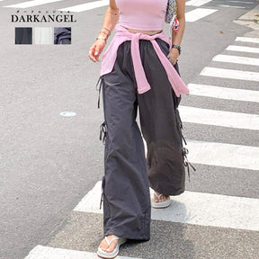 サイドの紐をリボン結びにして、スポーティーなワイドパンツに