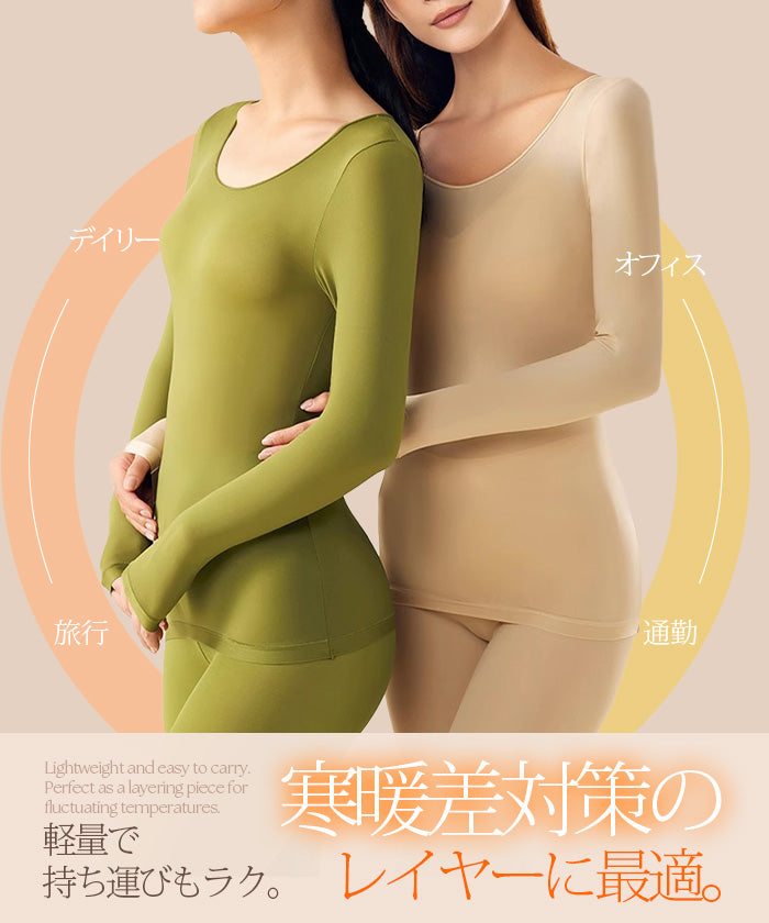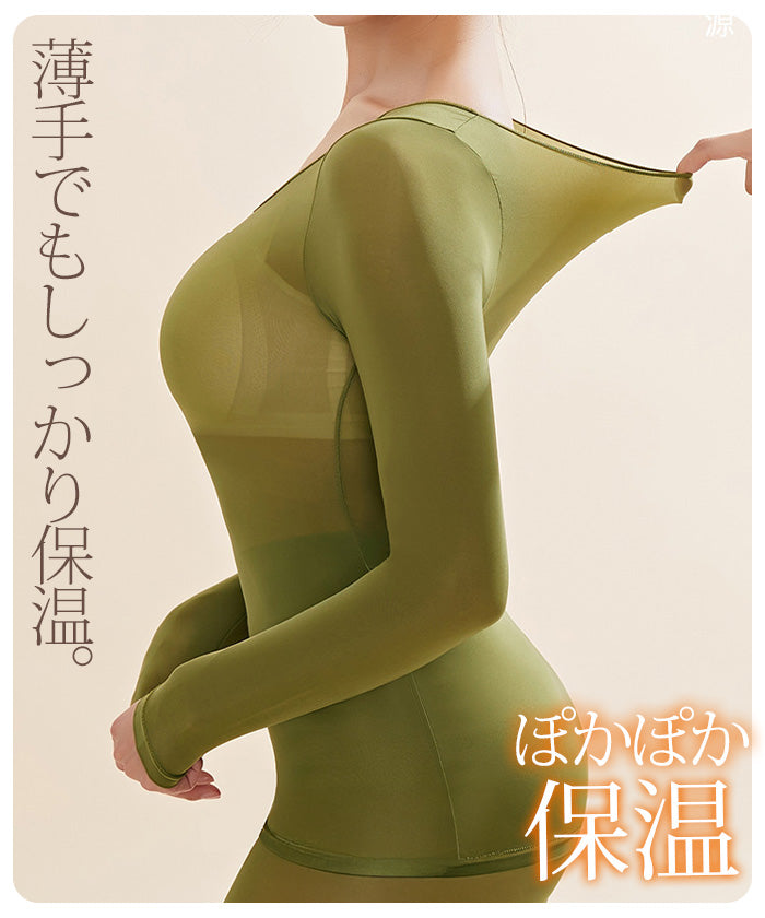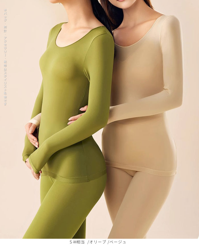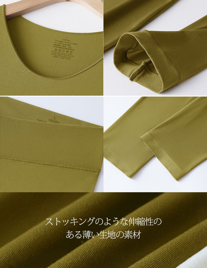 重ね着してもラインが響きにくい“着られるストッキング”インナー。 こちらは長袖トップス+レギンスの上下セット 高密度編みのなめらか素材が身体に沿い、 保温性と通気性のバランスに優れた快適設計。 ニットやシャツ、ワンピース、スーツのインに 合わせても着ぶくれしづらく、 きれいなシルエットをキープします。 デイリーから通勤・旅行まで秋冬の防寒レイヤーに最適。 《商品ポイント》 上下セット:長袖トップス+レギンスで全身をやさしく包み、コーデの土台を整える 薄手×あたたか:軽量でも心地よいぬくもり、着ぶくれを抑える 伸縮ストレッチ:縦横に伸びて動きやすい、締め付け感を軽減 速乾&なめらか:さらっとドライで肌離れ、洗っても乾きやすい 《デザイン・シルエット》 丸首長袖トップス:首元の開きが程よく、重ね着しやすいベーシックデザイン フィットレギンス:脚に沿う美ライン、ウエストは快適フィットでズレにくい 細見えレイヤー:体に沿う設計でアウターのシルエットを邪魔しない 《コーディネート提案》 通勤ニットの防寒に:ハイゲージニットやシャツのインに重ねても段差が出にくい。 ワンピースのインナーに:ベージュで透け対策、ブラックで引き締め。 アクティブシーンに:軽くて動きやすいので旅行・アウトドア・家事にも快適。 セットアップ合わせ:同系色のタイトスカートやスラックスと統一すると上品見え。 《サイズ・カラーバリエーション》 サイズ:L/XL カラー:ブラック/モカ/ベージュ/オリーブ/ピンクベージュ 《素材・機能性》 ・素材:ナイロン100% ・透け感:あり ・伸縮性:あり ・厚み:薄手 |