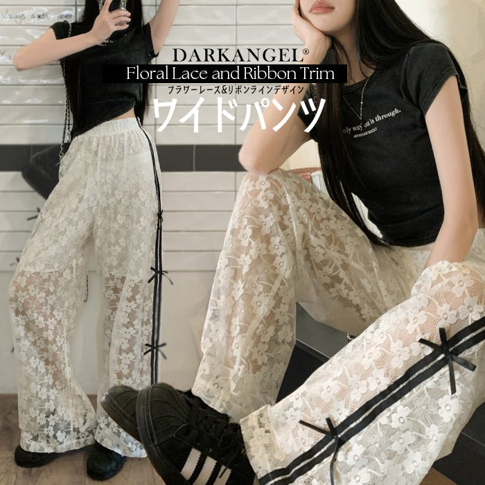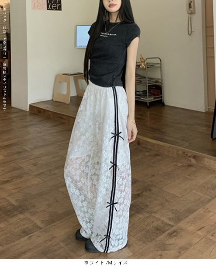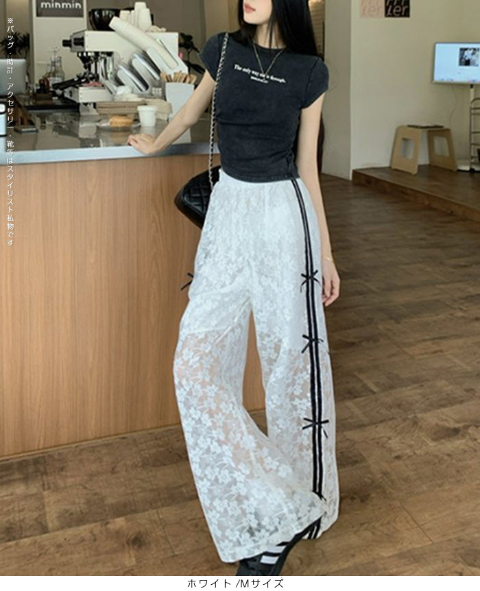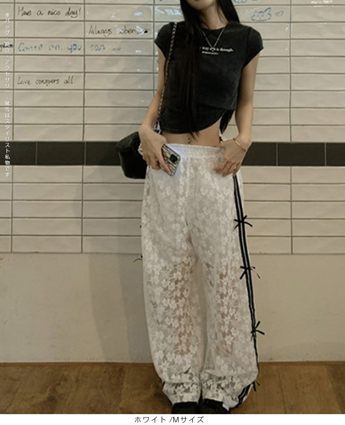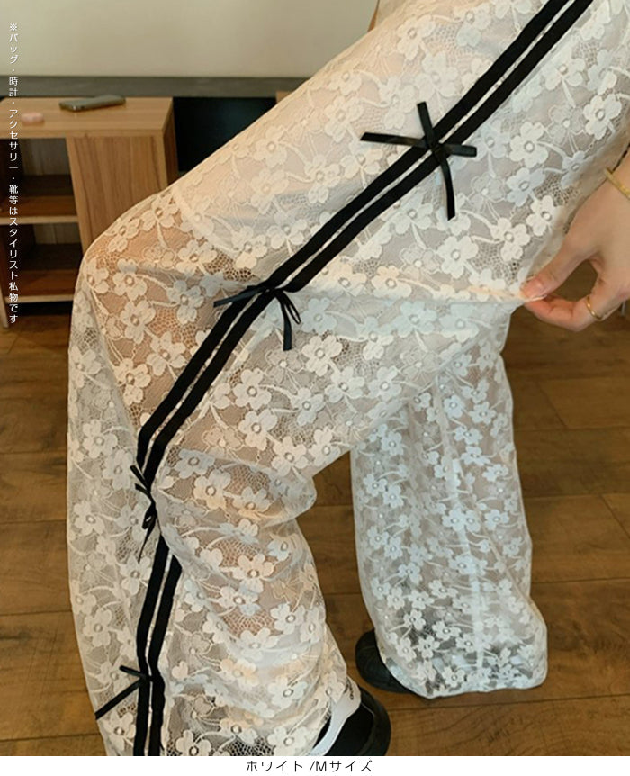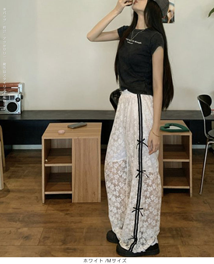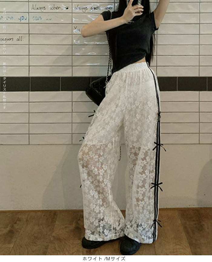 【フラワーレース×リボンラインデザインワイドパンツ】