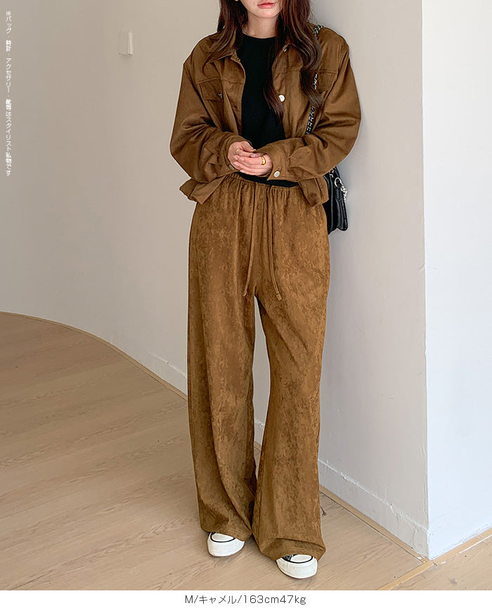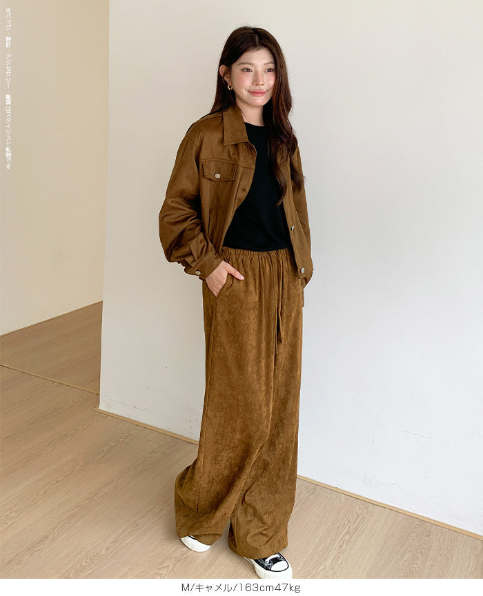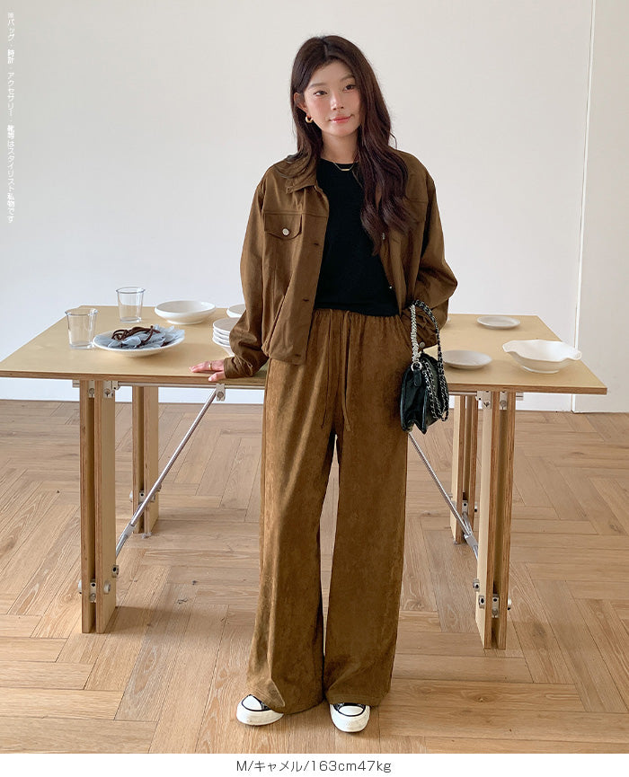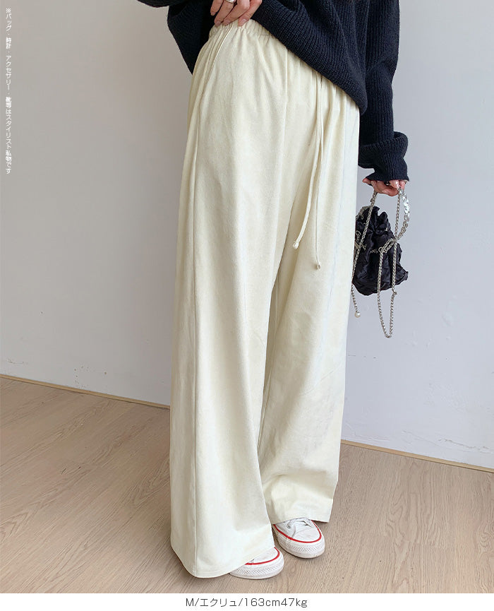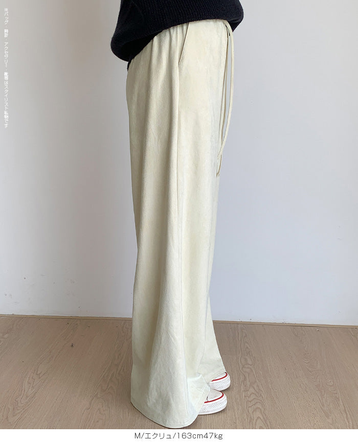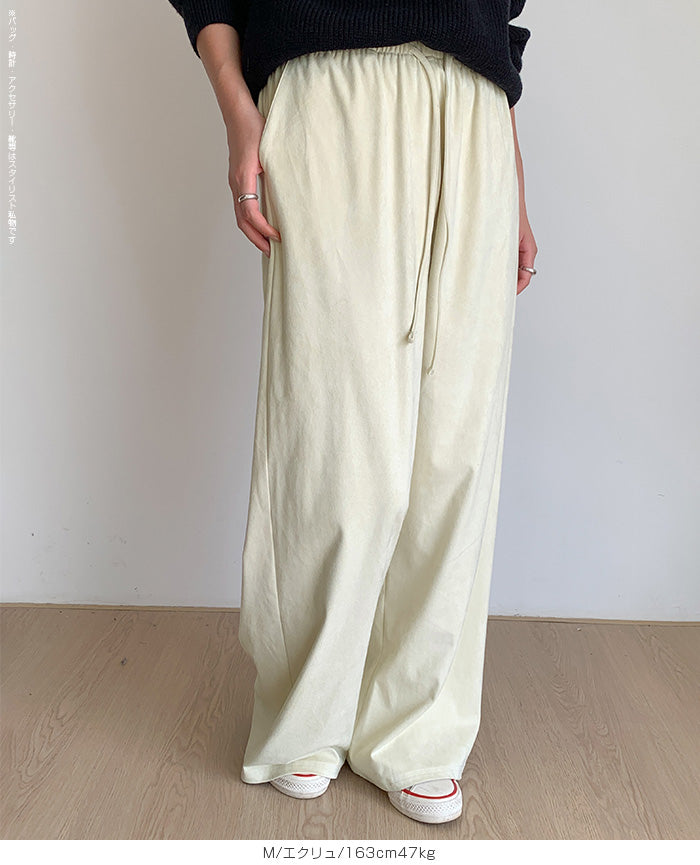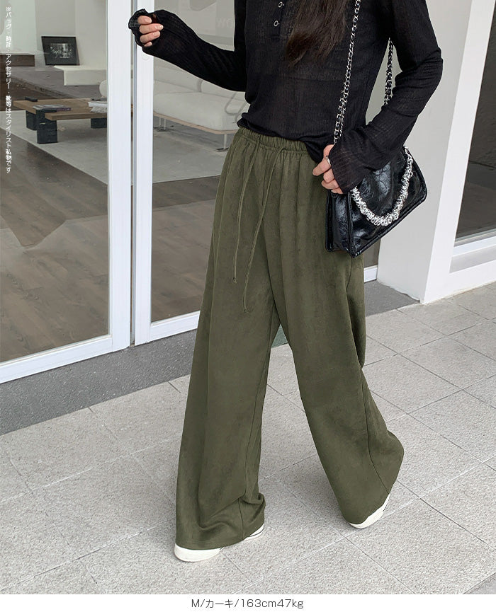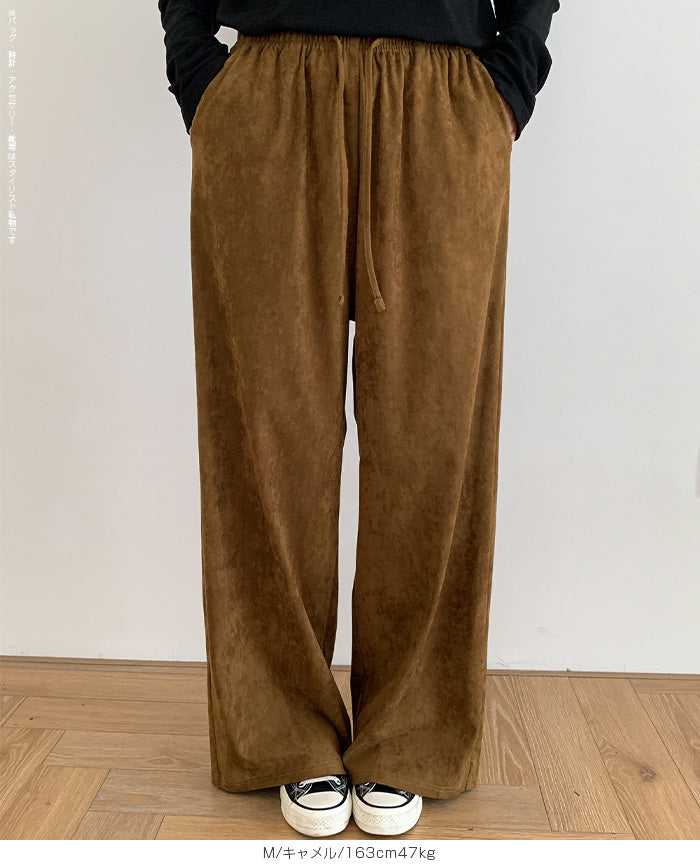 【秋冬のスタイリングに上品な抜け感をプラスする 、フェイクスエードワイドパンツ。 柔らかくしっとりとしたスエード調素材は、 高級感がありながらも軽やかで穿き心地ラクちん。 ウエストは総ゴム仕様でリラックス感があり、 便利なサイドポケット付き。 ワイドシルエットが体型をさりげなくカバーし、 美脚効果も期待できます。 カジュアルにもきれいめにも合わせやすく、 オンオフ問わずデイリーに活躍。 大人カジュアルを楽しみたい女性におすすめの一本です。 【素材感・着心地】 ポリエステル90%・ポリウレタン10%のフェイクスエード生地を使用。 リアルレザーのような高級感があり、 しっとりとなめらかな質感で大人っぽい落ち着いた風合いが魅力です 秋冬の装いに品良くマッチし、高見え効果も◎。 【シルエット・サイズ感】 ワイドなストレートシルエットで脚のラインを拾わず、 気になる体型もさりげなくカバーできます 旬のゆったり感がこなれた印象を与え 美脚&脚長効果でスタイルアップも叶う一本です 機能性: ウエストは総ゴム仕様で、 長時間の着用や屈んだ動作もストレスフリーな楽ちん履き心地 両サイドには便利なポケット付きで実用性も兼ね備え、デイリーに活躍します。 【着回し&コーデ提案】 高見えする素材感のおかげで、 合わせるアイテム次第でカジュアルからきれいめまで幅広い着回しが可能です。 カジュアルな着こなし:オーバーサイズのボリュームニットやパーカーなど、 ラフなトップスと合わせ、足元はスニーカーでカジュアルダウン。 きれいめな着こなし:短めの丈のトップスや、 フィット感のあるリブニットなどをタックインすると、 脚長効果が引き立ちます。 足元にヒールやショートブーツを合わせれば、 オフィスにも対応できる大人きれいめスタイルが完成します。 |