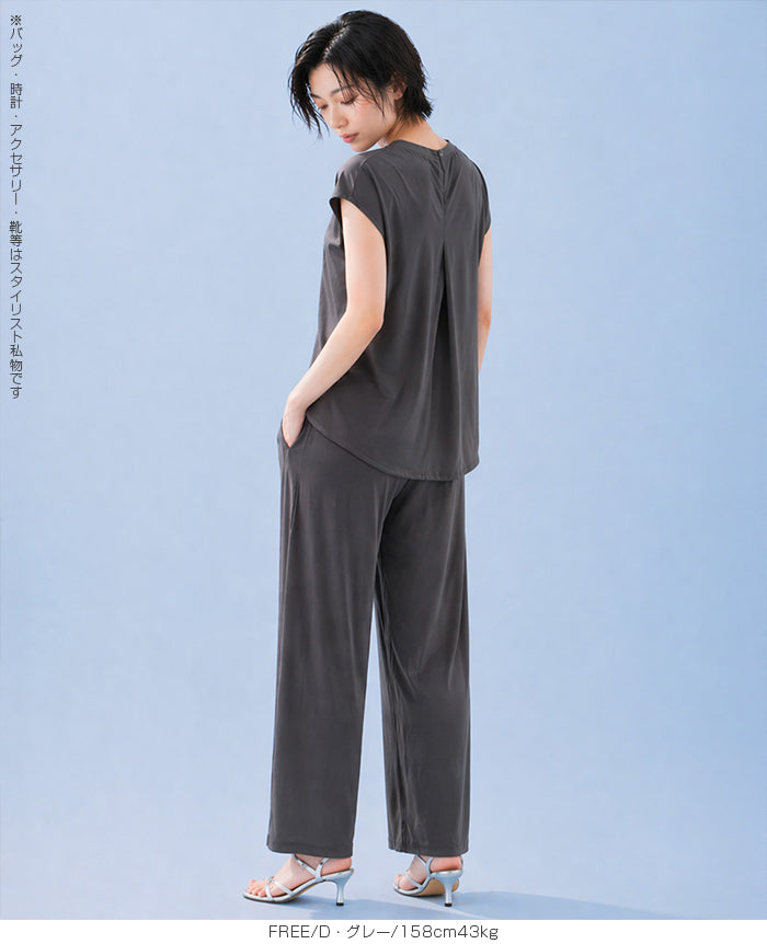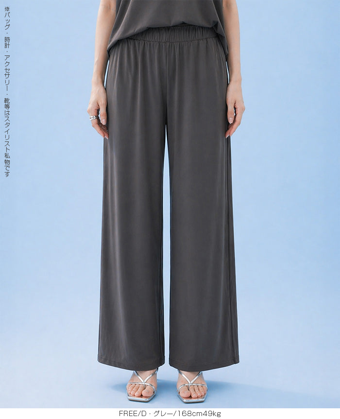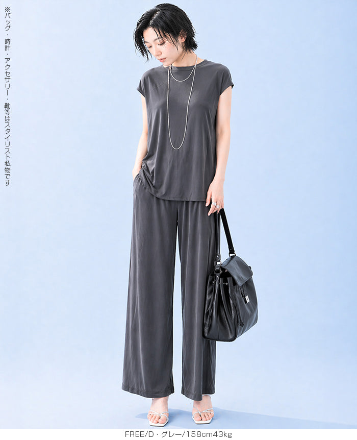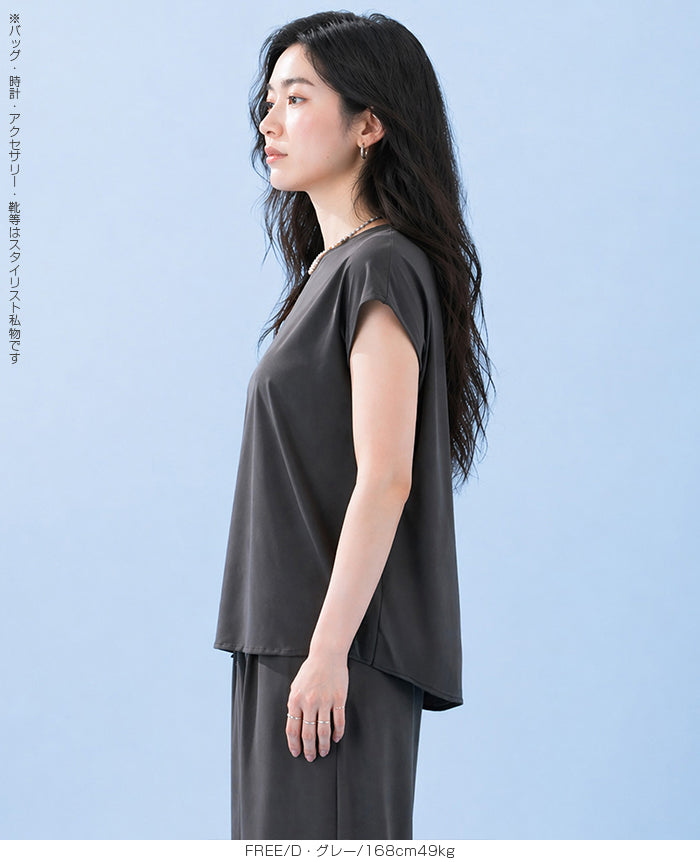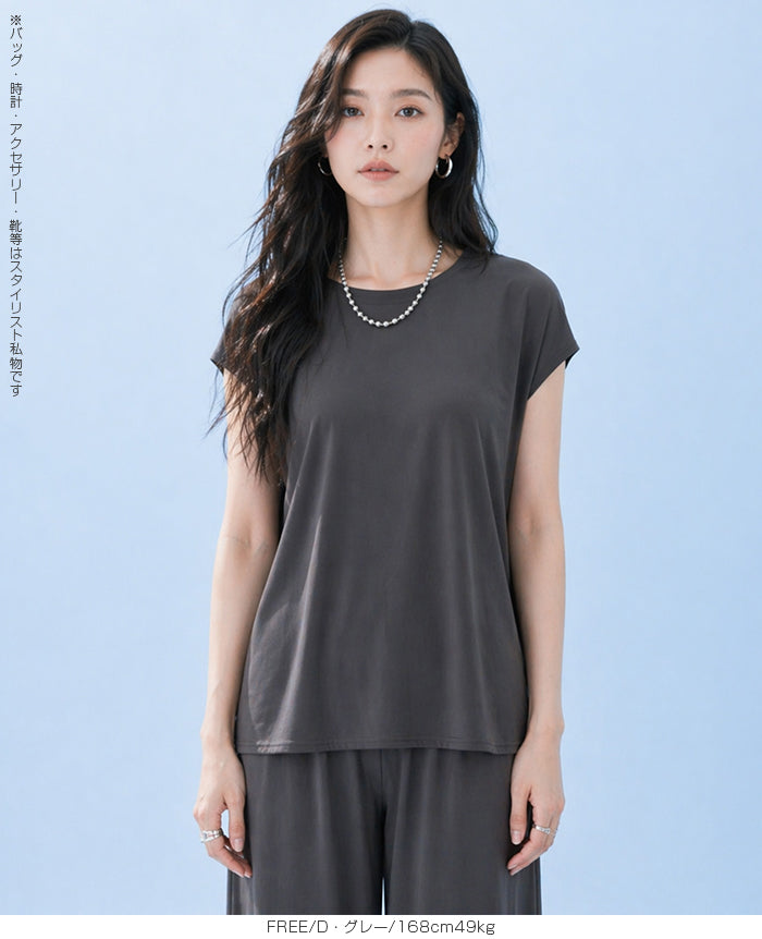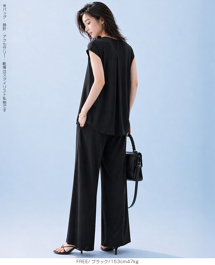 【 COOLIFYノーブルドレープワイドセットアップ 】 炎天下の現場やスポーツシーンでも使用される高機能素材「COOLIC」を採用した、オフィス対応の上品セットアップ。 接触冷感(Q-MAX値0.5以上)によるひんやりとした着心地に加え、速乾性・ストレッチ性を兼ね備え、暑い季節でも快適に過ごせます。 さらに紫外線カット率99.1%で、日中の外出や通勤時も安心。 ナイロンをベースにヒスイパウダーを練り込んだ独自素材により、なめらかな肌触りと均一で美しい表面感を実現。 軽やかで上品な落ち感があり、機能性ときちんと感を両立します。 日常からオフィスまでシームレスに活躍する「COOLIFY」シリーズの高機能セットアップです。 《商品ポイント》 ・接触冷感(Q-MAX値0.5以上)でひんやり快適 ・紫外線カット率99.1%でしっかりUV対策 ・汗をかいてもすぐ乾く速乾性 ・ストレッチ性があり動きやすくストレスフリー ・軽量で長時間着ても疲れにくい ・ヒスイパウダー配合でなめらかな肌触り ・素材の均一性が高く、上品な見た目をキープ ・シワになりにくくお手入れ簡単 ・オフィスでも使えるきれいめデザイン ・セットでも単品でも使える高い着回し力 《デザイン・シルエット》 トップスは肩まわりをすっきり見せるフレンチスリーブ仕様。 前後差のある裾デザインで、ヒップラインを自然にカバーしながら軽やかな印象に仕上げています。 パンツは落ち感のあるワイドシルエットで脚のラインを拾わず、美しいドレープを演出。 ストレッチ性のある素材により、動きやすさとリラックス感を兼ね備えています。 全体としてシンプルながらも上質さが際立つ、大人のためのミニマルデザインです。 《コーディネート提案》 ・ヒールやパンプスを合わせてきちんと感のある通勤スタイルに ・フラットサンダルで抜け感のある大人カジュアルに ・ジャケットを羽織れば商談やオフィスシーンにも対応 ・アクセサリーをプラスして洗練された印象に トップスはデニムやスカートと、パンツはシャツやブラウスと合わせることで、単品でも幅広いコーディネートが楽しめます。 《サイズ・カラーバリエーション》 サイズ:FREE カラー:ブラック / D・グレー 《素材・機能性》 ・素材:ナイロン80%、ポリウレタン15%、ヒスイパウダー5% ・透け感:ほとんど透けない ・伸縮性:あり ・厚み:薄手 |
