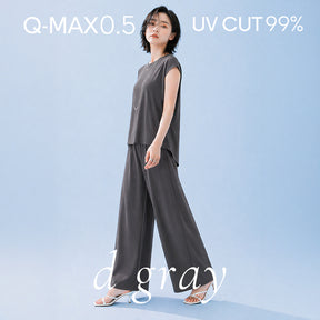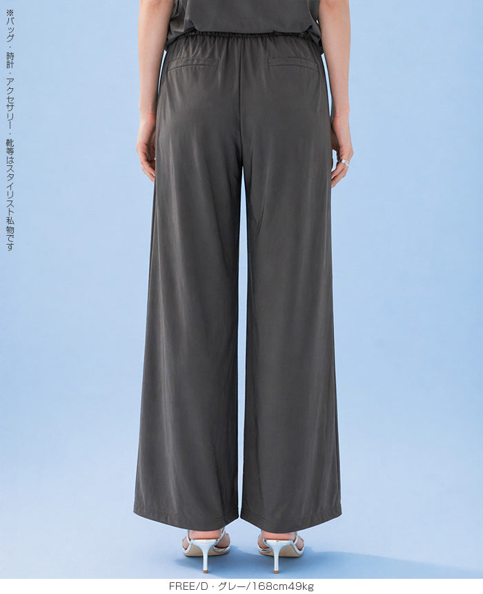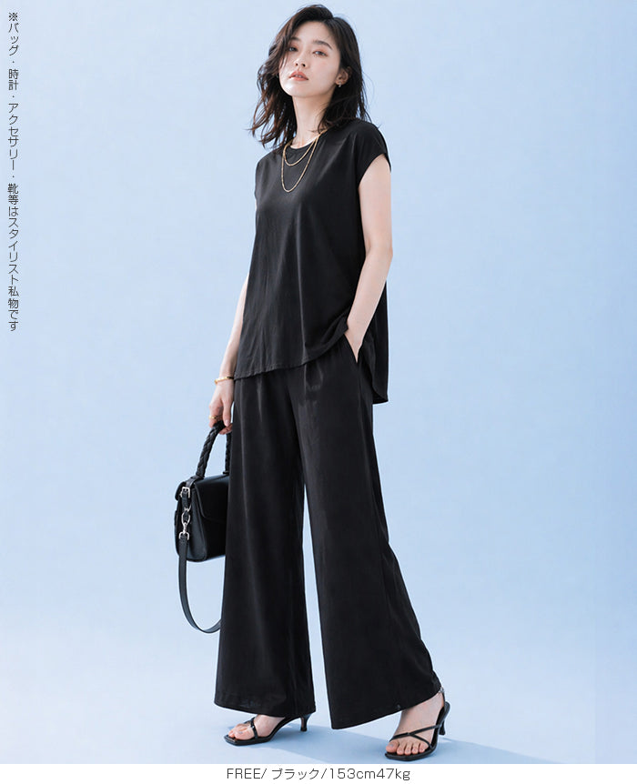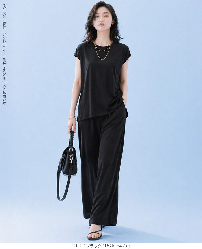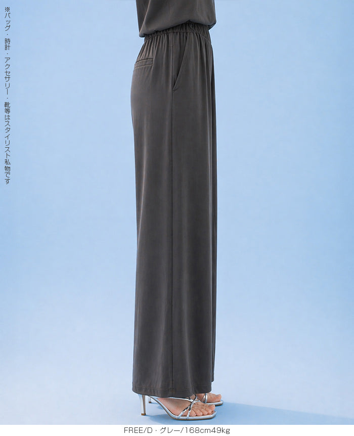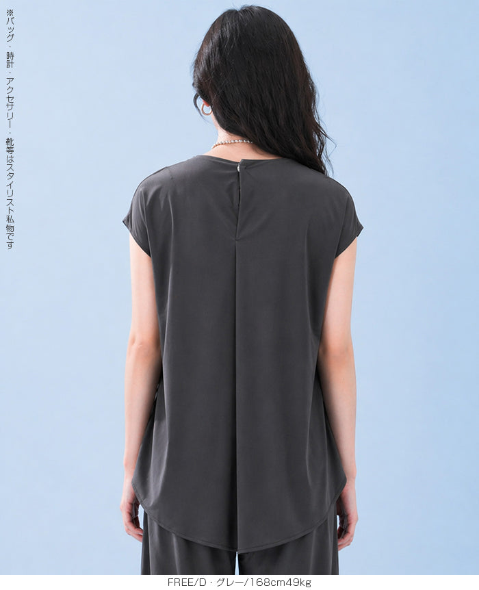【 COOLIFYノーブルドレープワイドセットアップ 】 炎天下の現場やスポーツシーンでも使用される高機能素材「COOLIC」を採用した、オフィス対応の上品セットアップ。 接触冷感(Q-MAX値0.5以上)によるひんやりとした着心地に加え、速乾性・ストレッチ性を兼ね備え、暑い季節でも快適に過ごせます。 さらに紫外線カット率99.1%で、日中の外出や通勤時も安心。 ナイロンをベースにヒスイパウダーを練り込んだ独自素材により、なめらかな肌触りと均一で美しい表面感を実現。 軽やかで上品な落ち感があり、機能性ときちんと感を両立します。 日常からオフィスまでシームレスに活躍する「COOLIFY」シリーズの高機能セットアップです。 《商品ポイント》 ・接触冷感(Q-MAX値0.5以上)でひんやり快適 ・紫外線カット率99.1%でしっかりUV対策 ・汗をかいてもすぐ乾く速乾性 ・ストレッチ性があり動きやすくストレスフリー ・軽量で長時間着ても疲れにくい ・ヒスイパウダー配合でなめらかな肌触り ・素材の均一性が高く、上品な見た目をキープ ・シワになりにくくお手入れ簡単 ・オフィスでも使えるきれいめデザイン ・セットでも単品でも使える高い着回し力 《デザイン・シルエット》 トップスは肩まわりをすっきり見せるフレンチスリーブ仕様。 前後差のある裾デザインで、ヒップラインを自然にカバーしながら軽やかな印象に仕上げています。 パンツは落ち感のあるワイドシルエットで脚のラインを拾わず、美しいドレープを演出。 ストレッチ性のある素材により、動きやすさとリラックス感を兼ね備えています。 全体としてシンプルながらも上質さが際立つ、大人のためのミニマルデザインです。 《コーディネート提案》 ・ヒールやパンプスを合わせてきちんと感のある通勤スタイルに ・フラットサンダルで抜け感のある大人カジュアルに ・ジャケットを羽織れば商談やオフィスシーンにも対応 ・アクセサリーをプラスして洗練された印象に トップスはデニムやスカートと、パンツはシャツやブラウスと合わせることで、単品でも幅広いコーディネートが楽しめます。 《サイズ・カラーバリエーション》 サイズ:FREE カラー:ブラック / D・グレー 《素材・機能性》 ・素材:ナイロン80%、ポリウレタン15%、ヒスイパウダー5% ・透け感:ほとんど透けない ・伸縮性:あり ・厚み:薄手 |