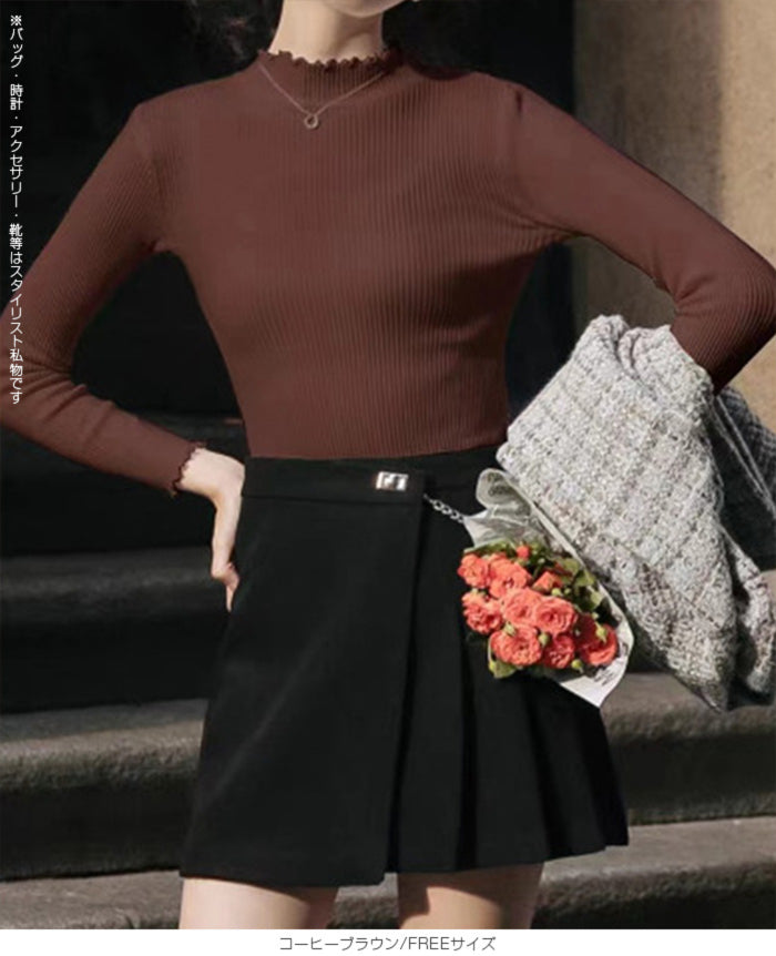 【メロウフリルリブニット】 繊細なメロウフリルが女性らしさを引き立てる、リブニットトップス。 首元・袖口・裾にあしらったさりげないフリルが、シンプルながらも華やかな印象を演出します。 縦ラインを強調するリブ編みで、すっきり細見え効果も◎。 柔らかく伸縮性のあるニット素材は身体に程よくフィットし、長時間の着用も快適です。 1枚での着用はもちろん、ジャケットやカーディガンのインナーとしても活躍。 カジュアルからフェミニンまで幅広いスタイリングに対応する、着回し力抜群の一枚です。 《商品ポイント》 ・衿/袖/裾にメロウフリル ・ハイネック ・縦ラインを強調するリブ編み ・1枚でもインナーでも使える高い着回し力 ・程よいフィット感 ・ロングシーズン着用可能 《デザイン・シルエット》 ・首元・袖口・裾に施した繊細なメロウフリルデザイン ・身体に優しく沿うスリムフィットシルエット ・リブ編み仕様ですっきりとした印象 ・甘くなりすぎず大人フェミニンに仕上がるデザイン 《コーディネート提案》 ・デニムやスラックスと合わせてシンプルコーデに ・スカートと合わせてフェミニンスタイルにも◎ ・ジャケットやカーディガンのインナーとして通勤にも活躍 ・ジャンスカやキャミワンピのインナーにもおすすめ 《サイズ・カラーバリエーション》 ・サイズ:フリーサイズ ・カラー:アイボリー/ホワイト/ブラック/グレー/ベージュ/ピンク/ブルー/イエロー/ワインレッド/コーヒーブラウン 《素材・機能性》 ・素材:ポリエステルニット素材 ・透け感:淡色のみややあり ・伸縮性:あり ・厚み:普通 |