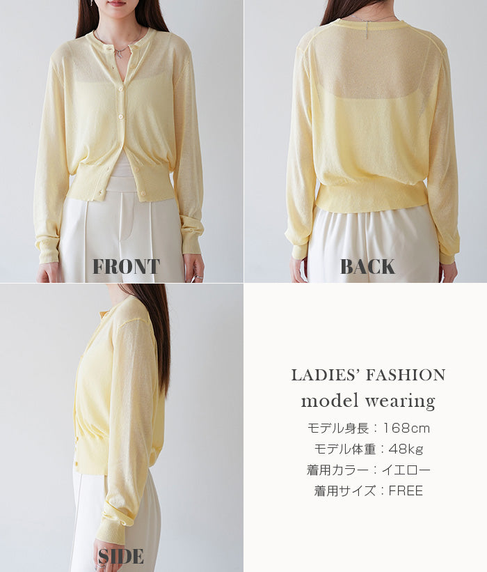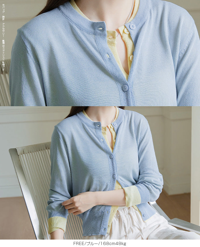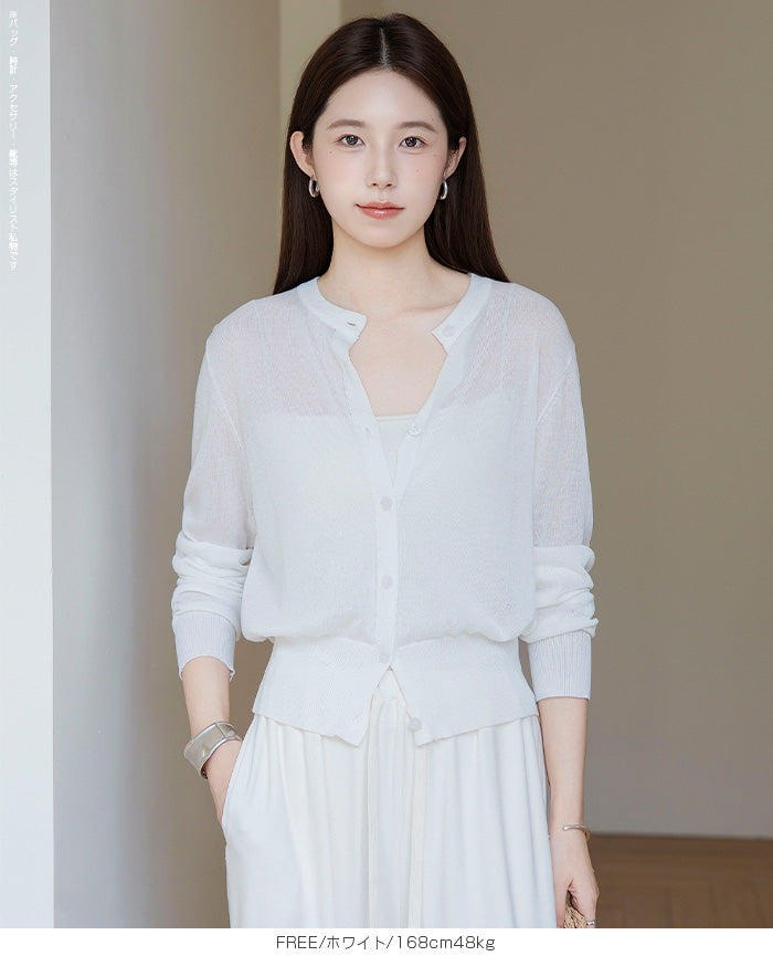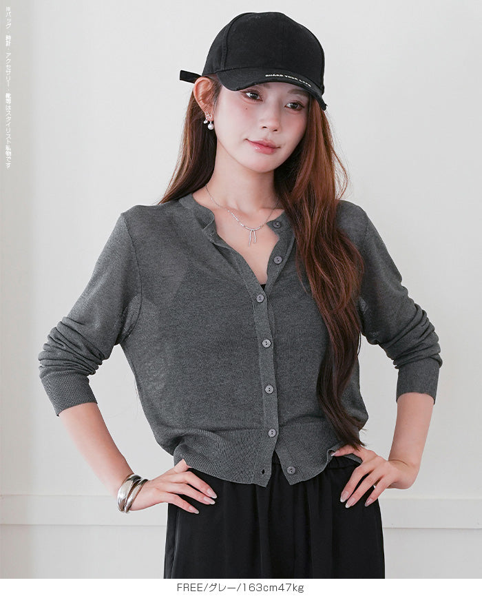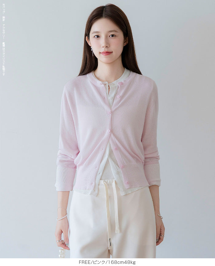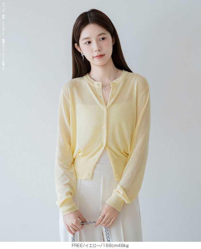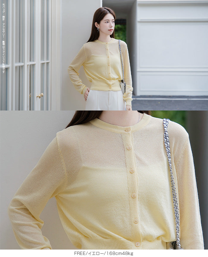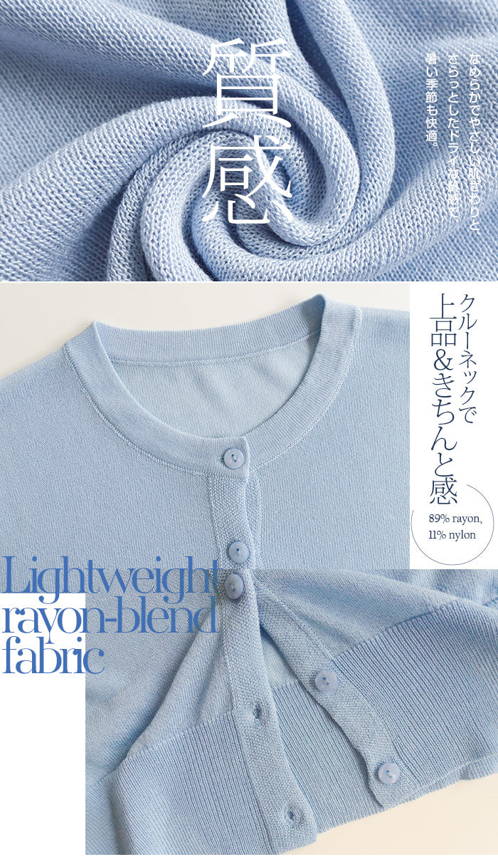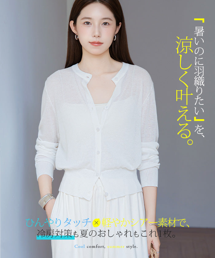 「冷房が寒いけど、重ねると暑い…」 そんな季節の悩みを、1枚でスマートに解決。 ほんのり透けるシアー素材が、 見た目にも涼しげで抜け感を演出。 着た瞬間に感じるさらっとした肌ざわりと軽やかさで、 暑い日でも快適に着用できます。 ショート丈設計だから、ワンピースやハイウエストボトムとも相性抜群。 羽織るだけでスタイルバランスが整い、自然と脚長見えも叶います。 さらに洗濯機で洗えるウォッシャブル仕様で、 デイリーに気兼ねなく使えるのも嬉しいポイント。 きれいめにもカジュアルにも馴染む、 “ちょうどいい上品さ”を持った大人のためのサマーカーディガンです。 【素材感・着心地】 レーヨン89%・ナイロン11%のブレンド素材を使用。 なめらかでやさしい肌ざわりのレーヨンに、 ナイロンの軽さと強度をプラスすることで、 さらっとしたドライタッチと軽やかな着心地を実現。 肌離れがよく、汗ばむ季節でもベタつきにくく快適。 ほんのりひんやりとした清涼感があり、夏の羽織りとして最適です。 透け感のあるシアー素材で、インナーとのレイヤードも楽しめます。 洗濯機使用可(ネット使用推奨)、タンブル乾燥不可 【シルエット・サイズ感】 体に程よくフィットするベーシックなサイズ感。 コンパクトなショート丈でウエスト位置を高く見せ、 スタイルアップ効果も期待できます。 ボタンを閉じてトップス風に、 開けて軽く羽織るスタイルにも対応。 すっきり見えながらも窮屈感のない、 大人女性にちょうどいいシルエットです。 【着回し&コーデ提案】 ・ワンピースに羽織って上品フェミニンスタイル ・タンクトップ+デニムで抜け感カジュアル ・オフィスではブラウスの上に羽織ってきちんと感をプラス ・冷房対策としてバッグに入れて持ち運びも◎ ホワイト・ブラック・グレー・ブルー・ピンク・イエローなど 豊富なカラーバリエーションで、色違いで揃えるのもおすすめ。 春から夏、初秋まで長く活躍する万能アイテムです。 |