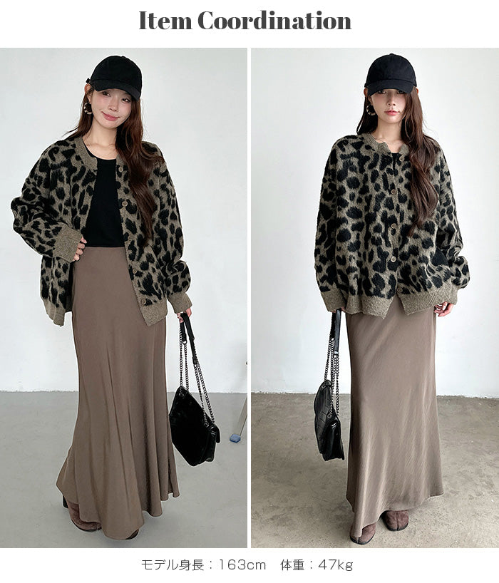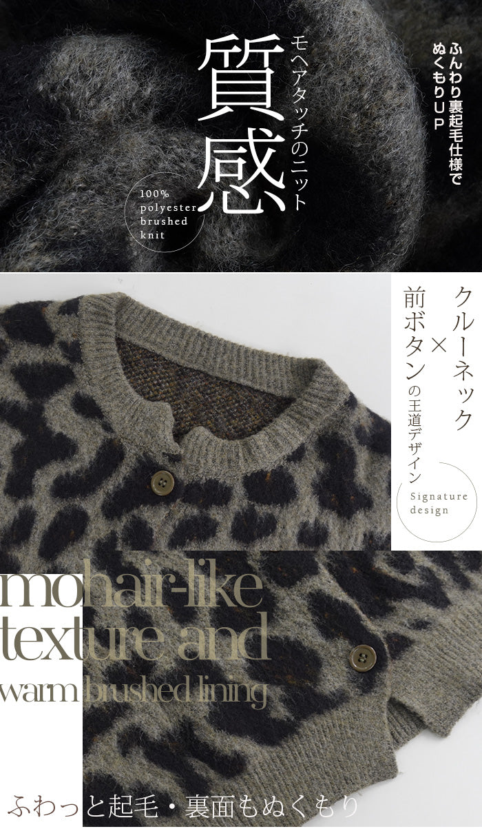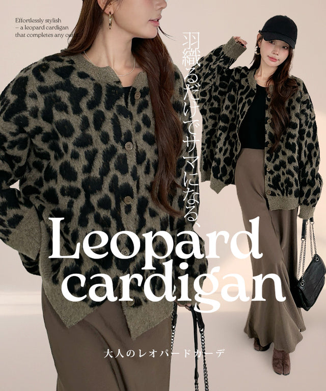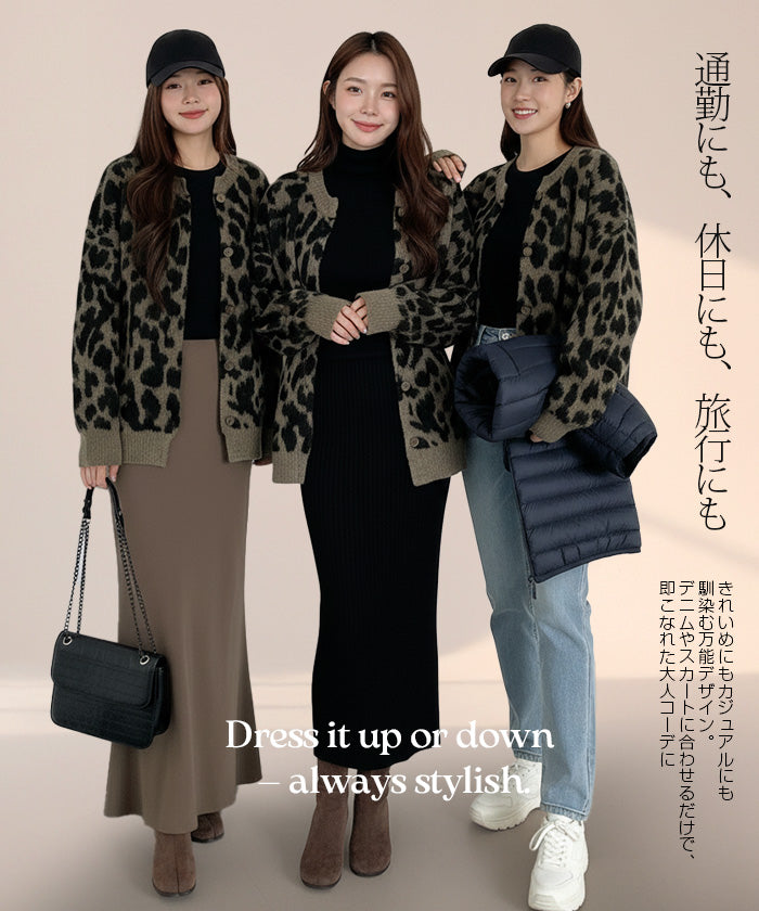 今年の注目は、“大人が着こなすレオパード”。 カーキブラウン×ブラックの落ち着いたトーンが、 派手すぎず上品にまとまる大人のアニマル柄カーディガンです。 ふわふわとした起毛感のあるモヘアタッチ素材で、 見た目にも着心地にもぬくもりを感じる一枚。 軽く羽織れて暖かく、秋冬のデイリーコーデに活躍します。 163cmモデル着用でヒップが隠れる安心丈(着丈65cm) 、 ドロップショルダーのゆるっと感が絶妙なオーバーサイズシルエット。 通勤にも休日にも使える“きれいめカジュアル”の新定番です。 【素材感・着心地】 柔らかいモヘアタッチの起毛感でふわっとした肌ざわり デイリーに使える実用派素材 【シルエット・サイズ感】 ゆるっと抜け感のあるオーバーサイズ 袖口と裾のリブでバランスよく引き締め 体型をさりげなくカバーし、どんなボトムにも合わせやすい ヒップラインまで覆う65cm丈で安心感あり 【着回し&コーデ提案】 通勤:黒パンツに合わせて“きれいめ辛口”に 休日:キャップ×デニムでラフな大人カジュアル 旅行:軽くてシワになりにくく、防寒にも◎ スカートやワンピとも好相性、1枚で旬コーデ完成 |