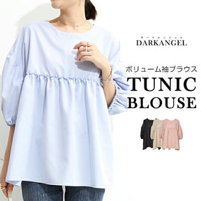[関連ワード] ブラウス レディース カジュアル パフ袖 パフスリーブ チュニック ペプラム チュニックブラウス プルオーバー ゴム ギャザー 夏 春 秋 七分袖 五分袖 体型カバー シャツ 二の腕カバー 高発色 ゆったり 大きいサイズ【 ボリューム袖ペプラムチュニックブラウス 】 カリス darkangel Dark Angel DARK ANGEL