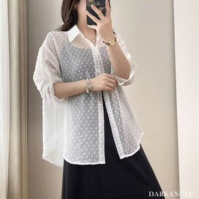 [関連ワード] 商品関連:夏の羽織りアイテム 春の新作 トップス シアーシャツ ドットシャツ シアー シャツ オーバーサイズ 透け感 シャツ コーディネートレディース 20代 30代 40代 50代 おしゃれ お洒落 オシャレ かわいい 可愛い カワイイ ダークエンジェル だーくえんじぇる darkangel Dark Angel DARK ANGEL 生地関連:ポリエステル 100% カラー展開: ホワイト ブラック ピンク サイズ展開:Mサイズ Lサイズ XLサイズ