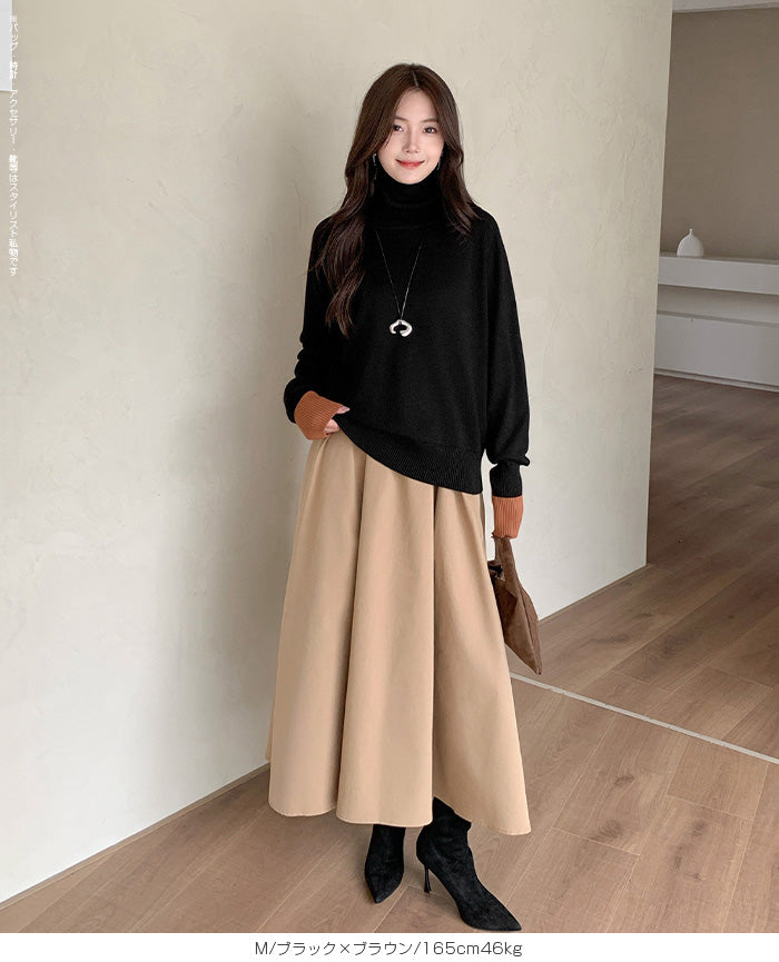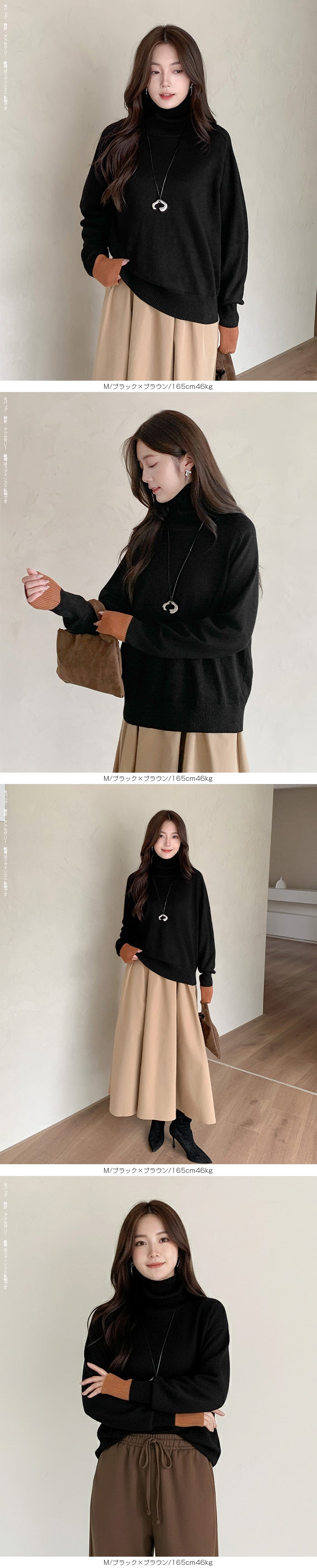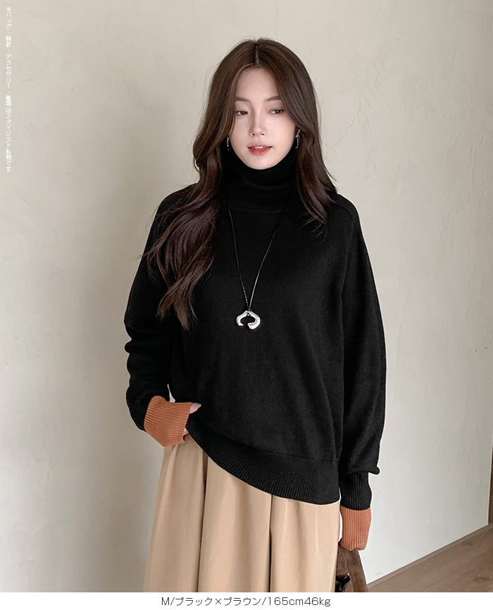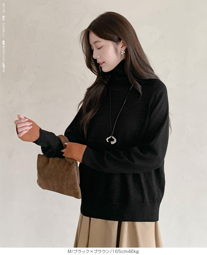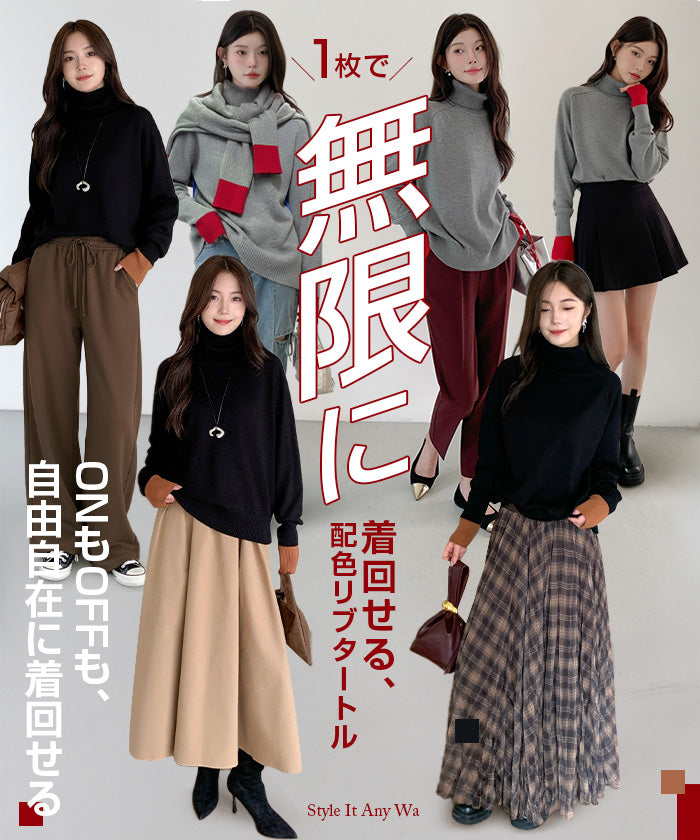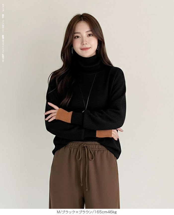 袖口の配色リブがアクセントになったタートルネックニット。 シンプルながらも小さなポイントでおしゃれ見えし、 大人カジュアルからきれいめまで幅広く対応。 秋冬の寒い季節に暖かく、 春先まで長く愛用できる万能トップスです。 【素材感・着心地】 ・柔らかな肌触りでチクチクしにくいニット素材 ・伸縮性があり着心地ラクラク ・厚すぎず軽やかでロングシーズン活躍 【シルエット・サイズ感】 ・程よいゆったり感で体型カバーにも◎ ・首元をすっきり包み込むタートルネックデザイン ・腰回りを隠してバランス良く見える丈感 【着回し&コーデ提案】 ・デニムと合わせて大人カジュアルに ・ロングスカートと合わせてフェミニンスタイルに ・テーパードパンツやジャケットと合わせてオフィスカジュアルにも◎ ・肩掛けコーデでこなれ感を演出 |