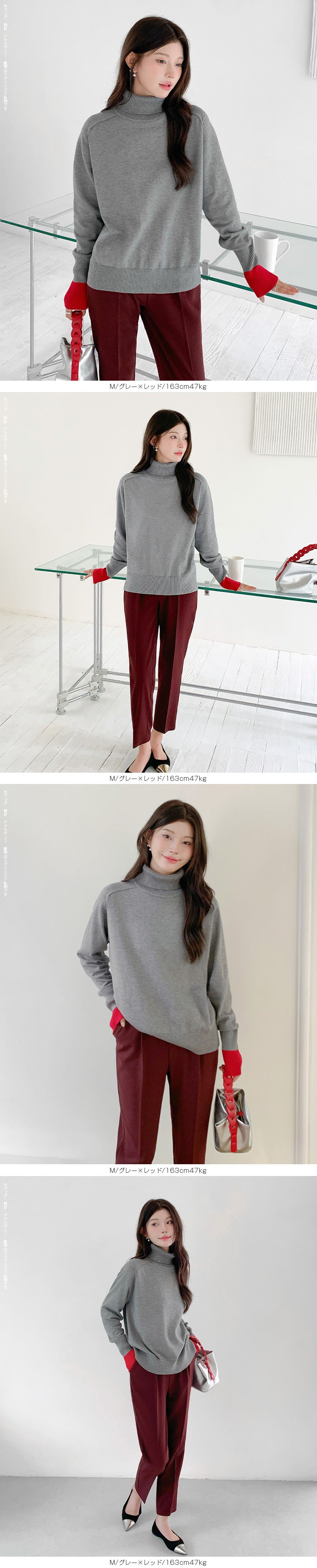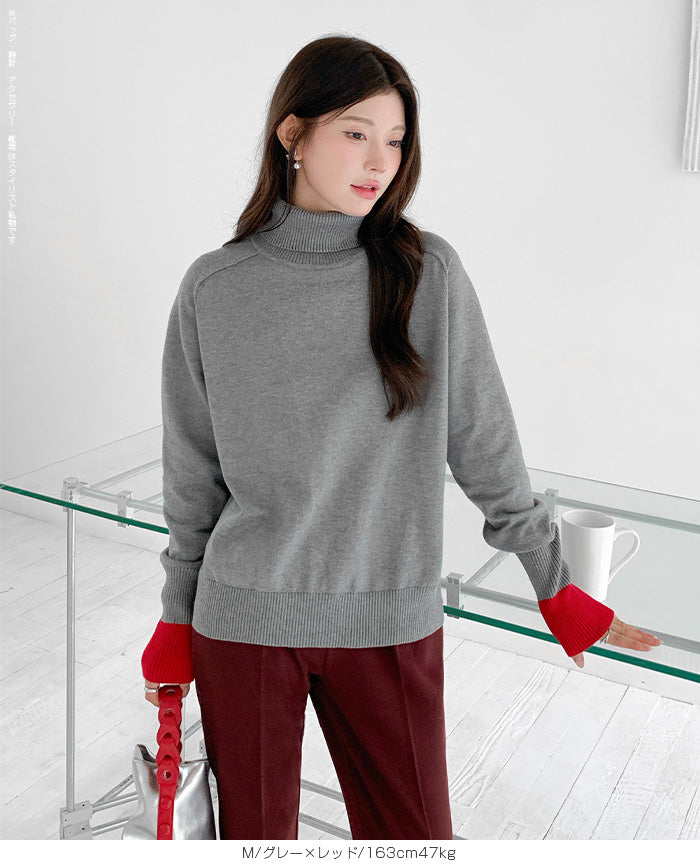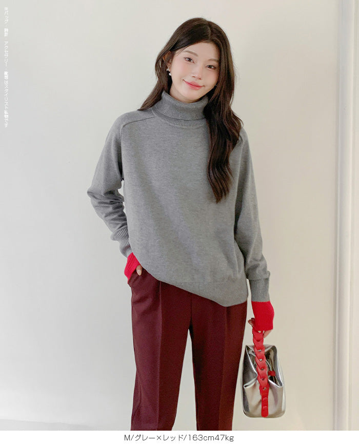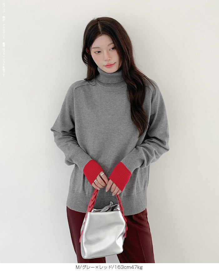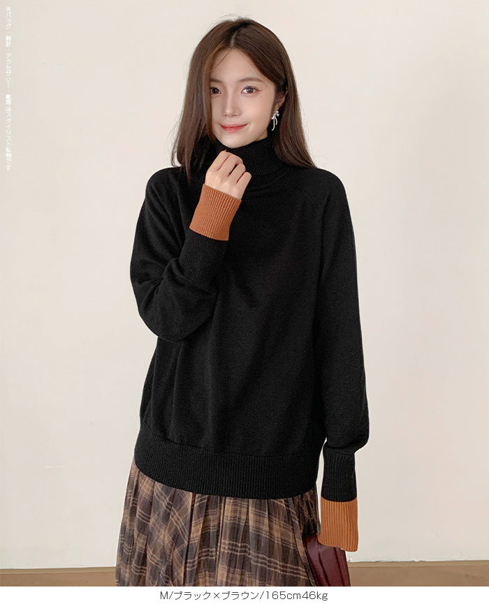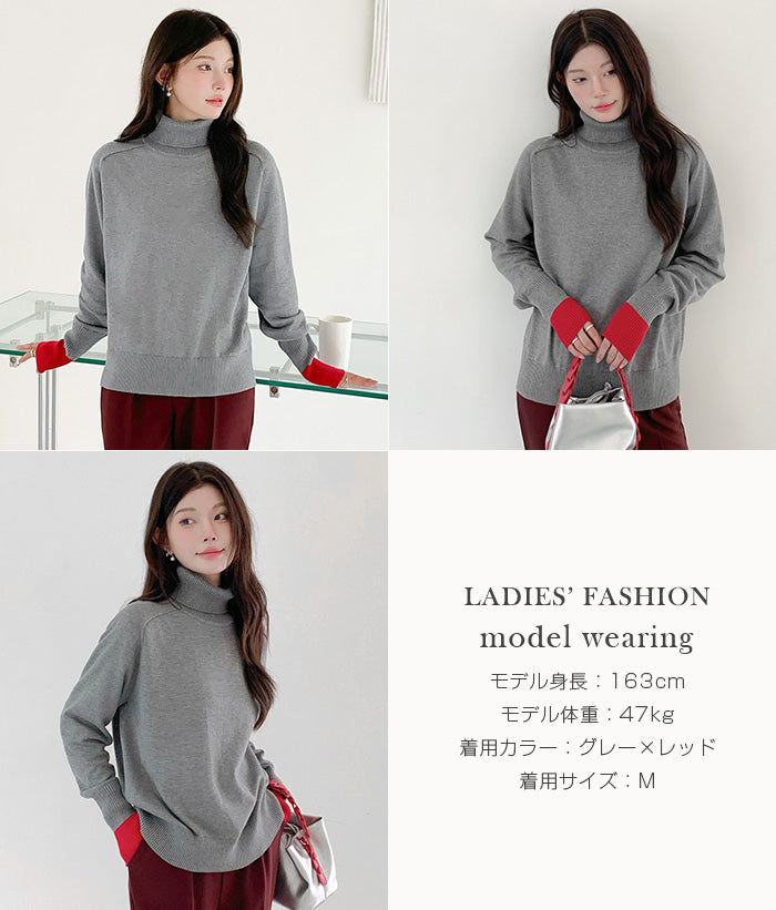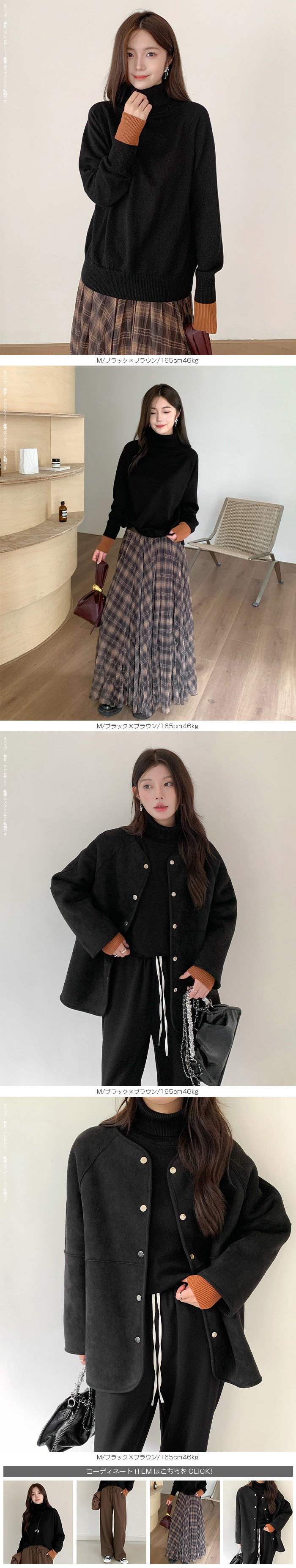 袖口の配色リブがアクセントになったタートルネックニット。 シンプルながらも小さなポイントでおしゃれ見えし、 大人カジュアルからきれいめまで幅広く対応。 秋冬の寒い季節に暖かく、 春先まで長く愛用できる万能トップスです。 【素材感・着心地】 ・柔らかな肌触りでチクチクしにくいニット素材 ・伸縮性があり着心地ラクラク ・厚すぎず軽やかでロングシーズン活躍 【シルエット・サイズ感】 ・程よいゆったり感で体型カバーにも◎ ・首元をすっきり包み込むタートルネックデザイン ・腰回りを隠してバランス良く見える丈感 【着回し&コーデ提案】 ・デニムと合わせて大人カジュアルに ・ロングスカートと合わせてフェミニンスタイルに ・テーパードパンツやジャケットと合わせてオフィスカジュアルにも◎ ・肩掛けコーデでこなれ感を演出 |