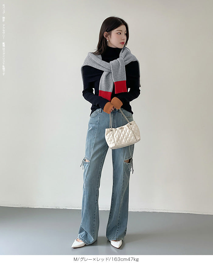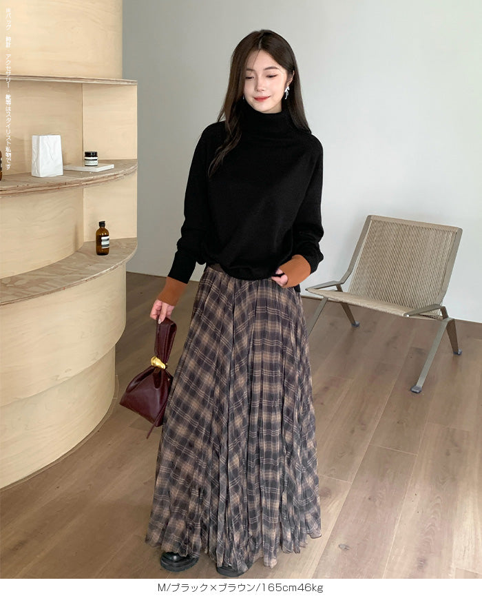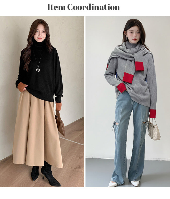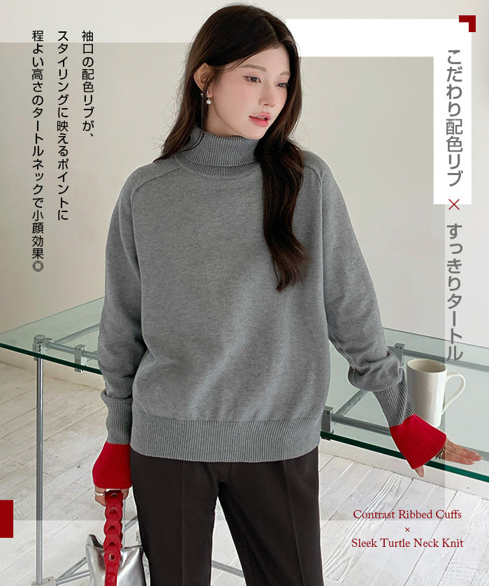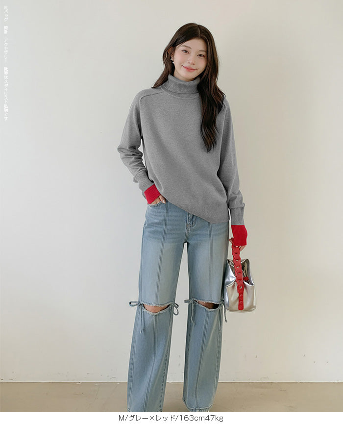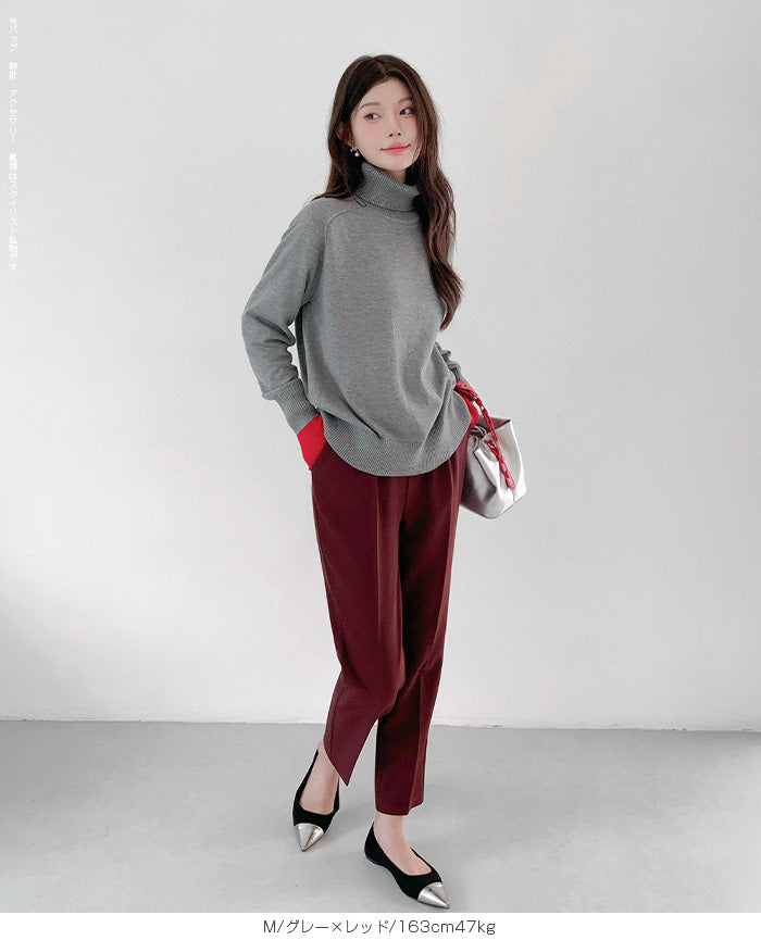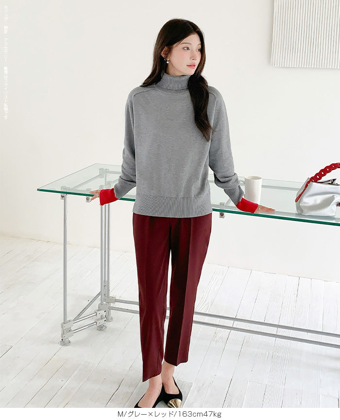 袖口の配色リブがアクセントになったタートルネックニット。 シンプルながらも小さなポイントでおしゃれ見えし、 大人カジュアルからきれいめまで幅広く対応。 秋冬の寒い季節に暖かく、 春先まで長く愛用できる万能トップスです。 【素材感・着心地】 ・柔らかな肌触りでチクチクしにくいニット素材 ・伸縮性があり着心地ラクラク ・厚すぎず軽やかでロングシーズン活躍 【シルエット・サイズ感】 ・程よいゆったり感で体型カバーにも◎ ・首元をすっきり包み込むタートルネックデザイン ・腰回りを隠してバランス良く見える丈感 【着回し&コーデ提案】 ・デニムと合わせて大人カジュアルに ・ロングスカートと合わせてフェミニンスタイルに ・テーパードパンツやジャケットと合わせてオフィスカジュアルにも◎ ・肩掛けコーデでこなれ感を演出 |