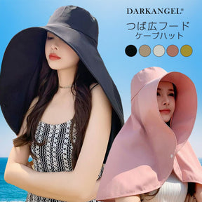 | 【つば広フード ケープハット】 顔全体を覆うような大きなつばと、首元までカバーするケープ型デザイン。 首元まで覆うケープ仕様で、紫外線だけでなく風やホコリもしっかりガード。 軽量で折りたたみ可能、持ち運びにも便利。 スナップボタンで形を変更でき、デコルテまで覆うことができます。 後ろ開口設計で髪を外に出せる仕様、ポニーテールでも着用でき、 帽子内側には頭周りのサイズ調節用のリボン付きです。 |