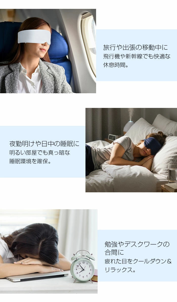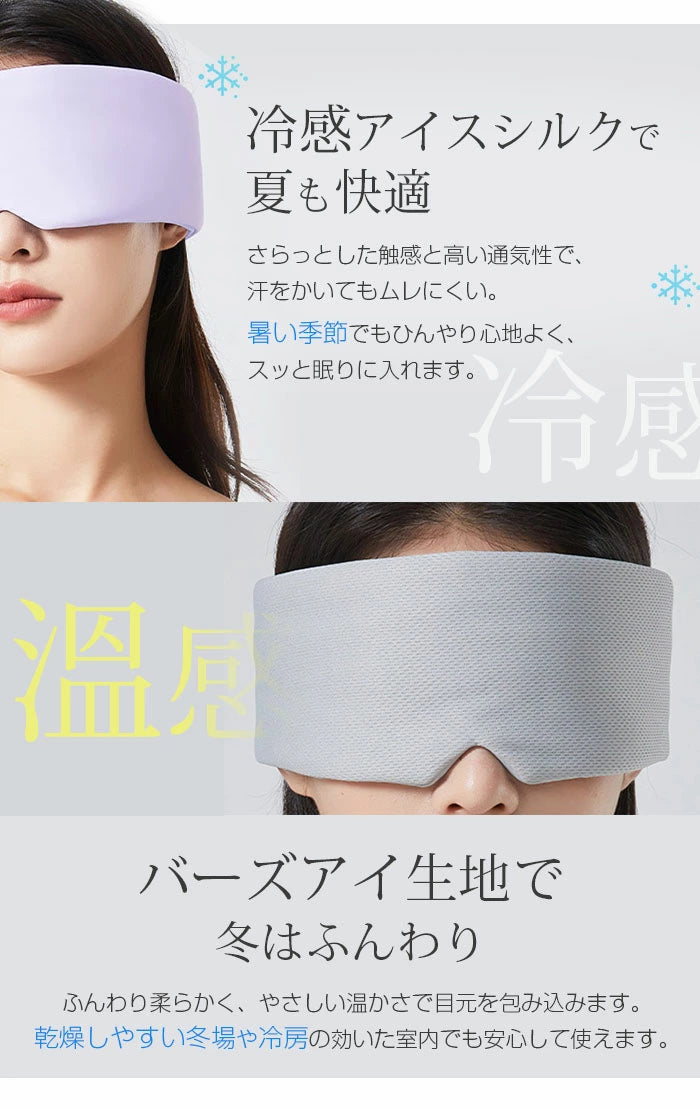 【 アイマスク 睡眠 遮光 シルクタッチ コンパクト 】 シルクのようになめらかな肌触りを実現する、接触冷感レーヨン×バーズアイ生地を使用したアイマスク。 ふわとろ素材でやさしく包み込み、就寝・仮眠・旅行・飛行機など、あらゆるシーンで快適な睡眠をサポートします。 かわいいデザインで男女兼用、大きめサイズで耳まで覆い、安眠・快眠グッズとして人気です。 両面リバーシブル仕様で、冷感面は夏やクールダウンに、温感面は冬やリラックスタイムに活躍。 温冷どちらも選べるから、季節を問わず一年中使えるアイマスクです。 遮光性抜群の立体設計で鼻までしっかりフィットし、光を完全にブロック。 昼寝や夜勤明けの睡眠も、ぐっすり眠れる環境をつくります。 サイズ調整可能なマジックテープ式でフリーサイズ対応。 就寝用・トラベル用のスリープアイマスクとしても実用的で、疲れ目ケアやリラックス用アイピローとしてもおすすめ。 繰り返し使える洗濯可能タイプだから、衛生的に長くご利用いただけます。 安眠・快眠を求める方にぴったりの遮光アイマスク。 睡眠美容をサポートするかわいい快眠グッズとして、プレゼントにも最適です。 |