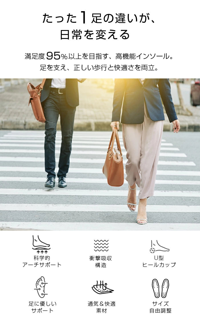 【 疲れ軽減アーチサポートインソール 】 立ち仕事や長距離ウォーク、スポーツやゴルフ・サッカー・バスケなど幅広く活躍する中敷き。 薄型でも厚底でも使える設計で、足裏・土踏まずをしっかり支え、 偏平足・浮き指・足底筋膜炎・モートン病対策にも効果的です。 衝撃吸収エアクッション搭載+3Dゲルが歩行時の負担を軽減。 かかと部分は厚めのクッションで外側重心矯正・内側重心サポートを両立。 骨盤や姿勢矯正、O脚・X脚・XO脚などの歩き方補正にも対応し、 ワークマン仕様の立ち仕事用やリフラックス対策にもおすすめです。 表面には滑り止め加工を採用し、靴ずれ防止・靴中敷きの安定感を向上。 スポーツシューズ、スニーカー、革靴、健康サンダルなど多用途にフィット。 男女兼用で、大人の男性・女性どちらにも快適にご使用いただけます。 通気性に優れたメッシュ設計で蒸れを防ぎ、防臭効果も期待。 サイズ調整はご家庭のハサミで簡単にカット可能。 外反母趾・内反小趾のサポートから、ダイエットや姿勢改善まで、 「歩くだけで健康を支える」多機能インソールです。 ※足と靴の形状によりフィット感は異なります。 靴に敷いてから微調整することをおすすめいたします。 |
