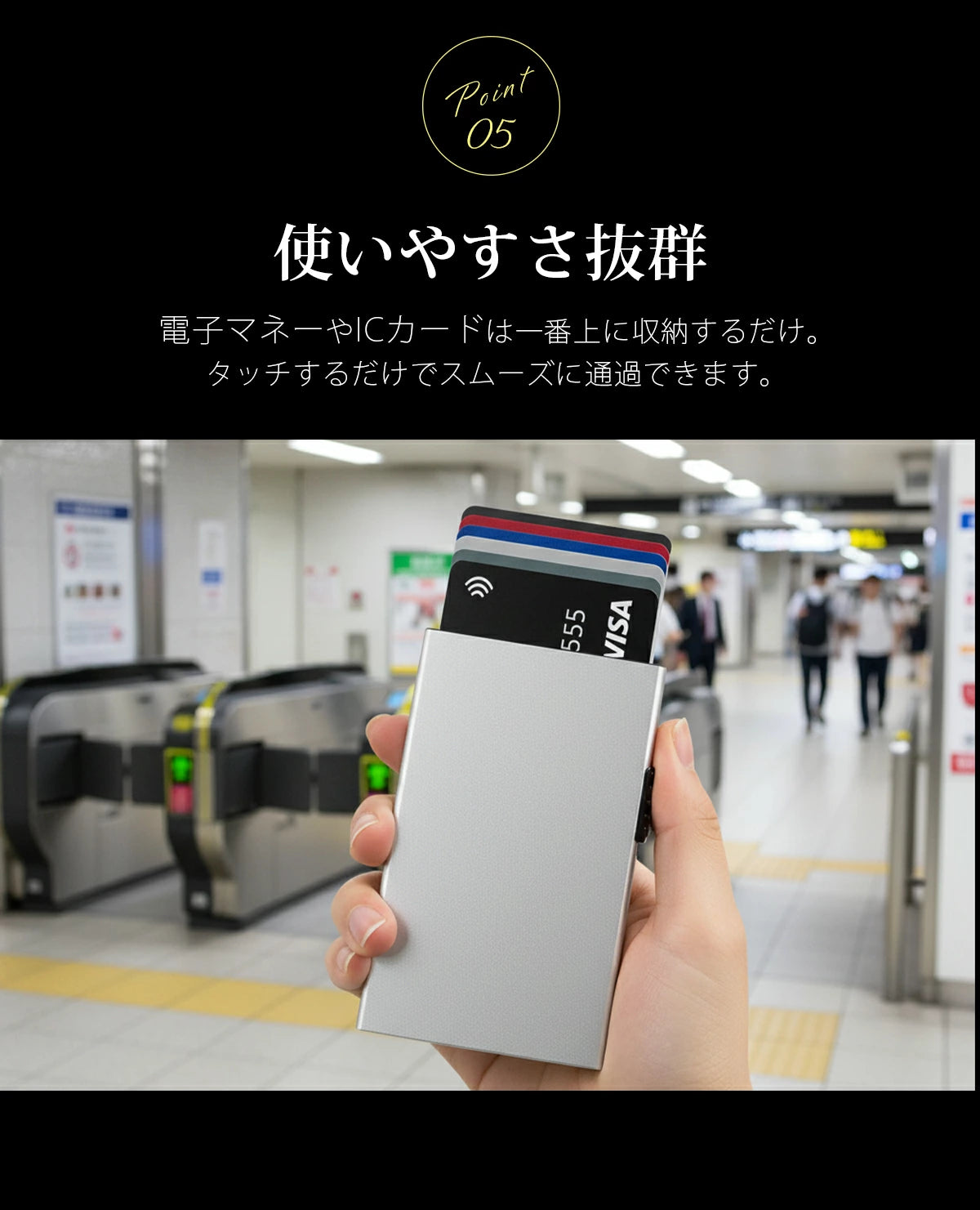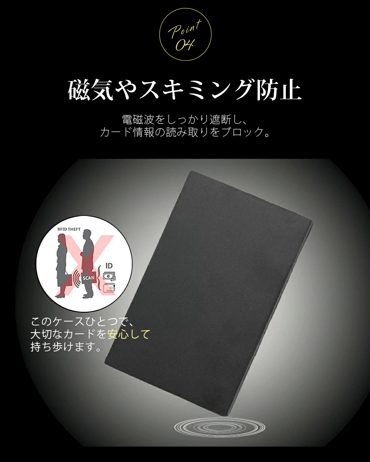 【 カードケース スライド式】 クレジットカード、ICカード、IDカード、マイナンバーカードなど、 大切なカードをスマートに収納できる薄型スリム設計のカードケース。 RFID搭載でスキミング防止機能付き、磁気干渉からもしっかりガードします。 スライド式のワンタッチ構造で、必要なカードを片手でサッと取り出せる便利設計。 段差でカードが整列し、探す手間なくスマートにお会計ができます。 厚さわずか1cmの超薄型ボディでポケットにもすっきり収まり、 スーツやバッグのシルエットを崩さずに持ち歩けます。 軽量アルミ素材を使用し、強度と軽さを両立。 磁気不良やスキミング被害を防ぐRFIDブロック構造を採用し、 クレジットカード・キャッシュカード・銀行カード・診察券・保険証など、 あらゆるカード情報を安全に保護します。 メンズ・レディース問わず使えるシンプルなデザインで、 ビジネスシーンからプライベートまで幅広く活躍。 大容量タイプは最大6枚〜8枚まで収納可能、 マネークリップ付きタイプならお札もまとめて持ち運びできます。 マイナンバーカードや交通系ICカードもぴったり入り、 キャッシュレス時代の必需アイテムとしておすすめ。 高級感ある質感と豊富なカラーバリエーションで、 ギフトにも最適なクレジットカードケースです。 磁気干渉防止構造でカードの劣化を防ぎ、長く清潔に使用可能。 RFIDスキミング防止・薄型・軽量・大容量、 機能性とスタイルを兼ね備えた次世代ウォレット。 |