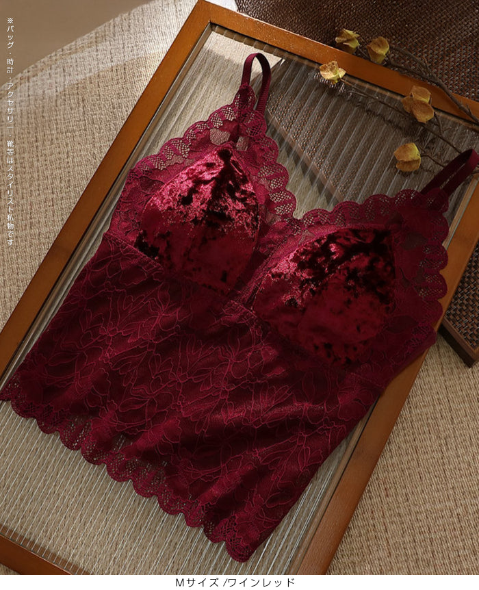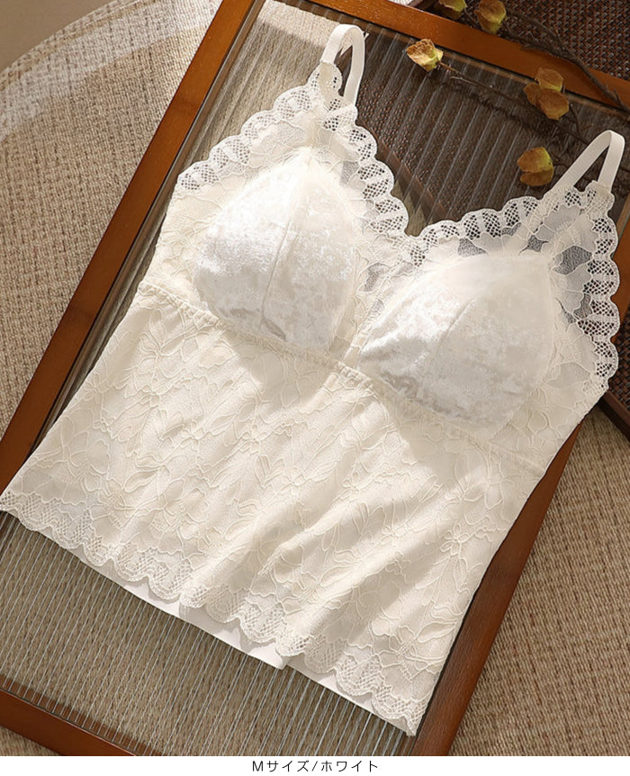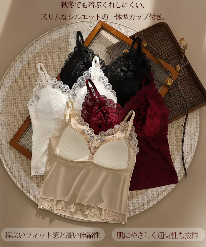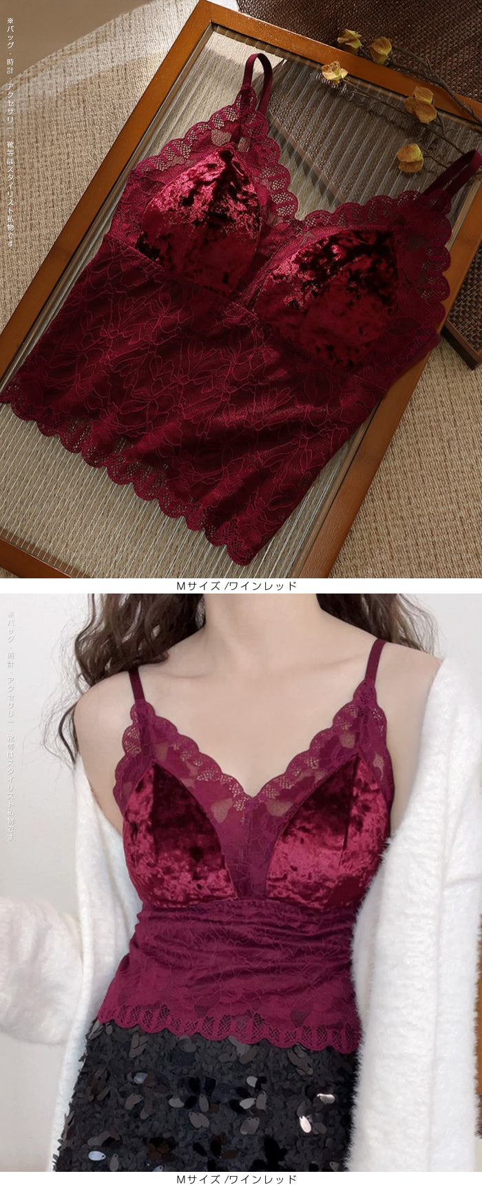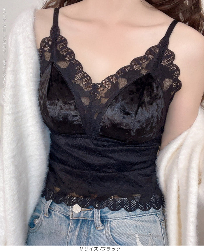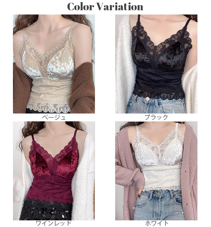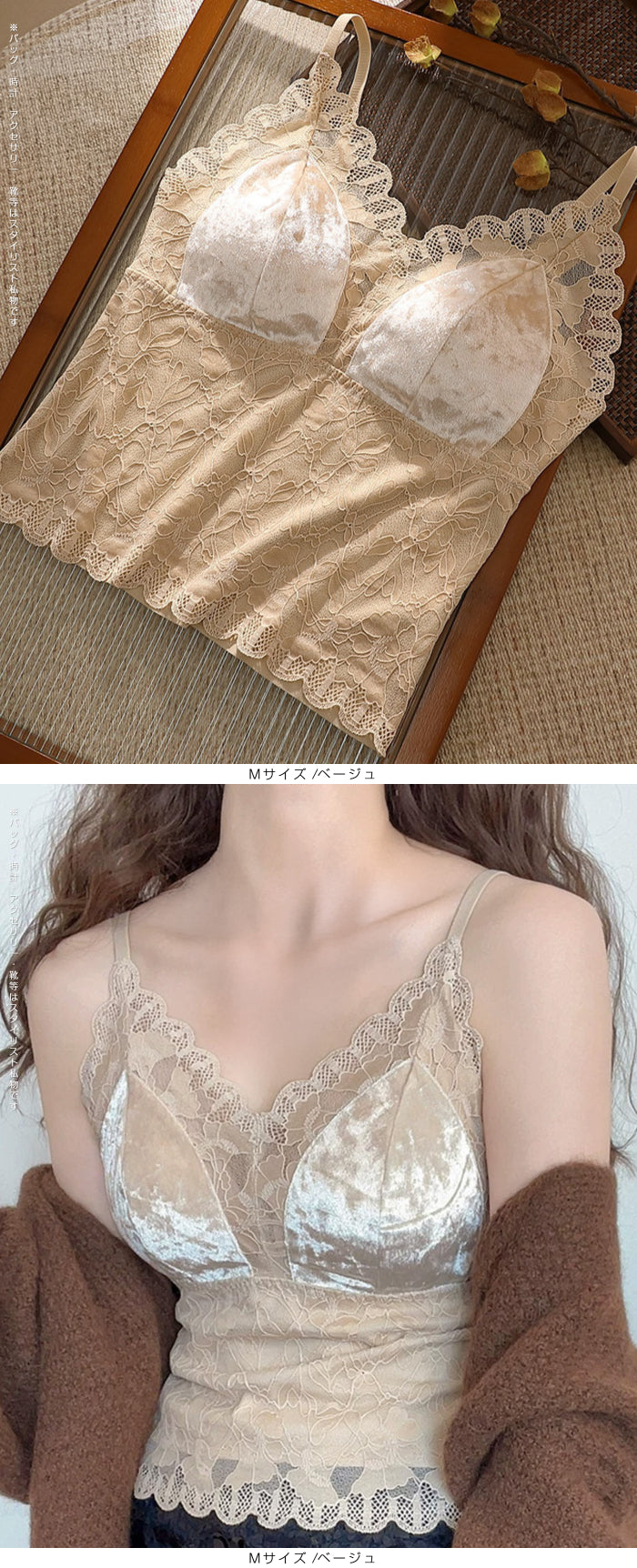 あったかベロア×レース キャミ <br> 柔らかくてあたたかいベロア素材にレースをあしらったキャミソール。<br> 素材:レース: ナイロン84.5%、ポリウレタン15.5%<br> |