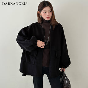 上品な起毛タッチのウール調素材を使用した、 顔周りをすっきり見せるノーカラーコート。 軽やかでハリがあり、見た目はメルトンのようにきれいめ。 丸みのあるボリュームスリーブが気になる二の腕を自然にカバー。 ヒップまで隠れるやや長め丈とゆったり設計で、 体型カバーにも最適です。 便利なフラップポケット、 さっと羽織れる前開きスナップでデイリーに活躍。 通勤のきれいめからデニムのカジュアルまで、 秋冬のレディースアウターとして幅広く使える一枚。 《商品ポイント》 ウール調起毛:メルトン風の上品な見え感。軽くて扱いやすい合繊ベース。 ノーカラー×ラウンドネック:マフラーやタートルに重ねやすく顔周りがすっきり。 ボリュームスリーブ:立体感で華奢見え&二の腕カバー。 体型カバー設計:前後差ヘムとゆったり身幅で腰・ヒップまで包み込む。 大きめポケット:スマホ・手袋が収まる実用サイズ。 前開きスナップ:着脱が簡単、羽織るだけでサマになる。 《デザイン・シルエット》 コクーン寄りのゆったりAラインで女性らしい丸みを演出。 後ろがやや長い前後差ヘムで脚長見え。 余計な装飾を省いたミニマルデザインなのでオンオフ両対応。 《コーディネート提案》 通勤きれいめ:タートルニット+テーパードパンツ+ローファー。ノーカラーでストールも巻きやすい。 大人カジュアル:ボーダーT+デニム+スニーカー。袖ボリュームがアクセント。 フェミニン:リブワンピ+ロングブーツでIラインを強調して細見え。 防寒レイヤード:薄手ダウンベストを仕込んで軽暖に。 《サイズ・カラーバリエーション》 サイズ:M/L カラー:ブラック/チャコール/ブラウン 《素材・機能性》 ・素材:ポリエステル100% ・透け感:なし ・伸縮性:なし ・厚み:厚め |