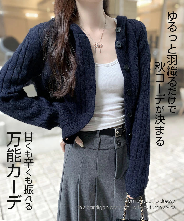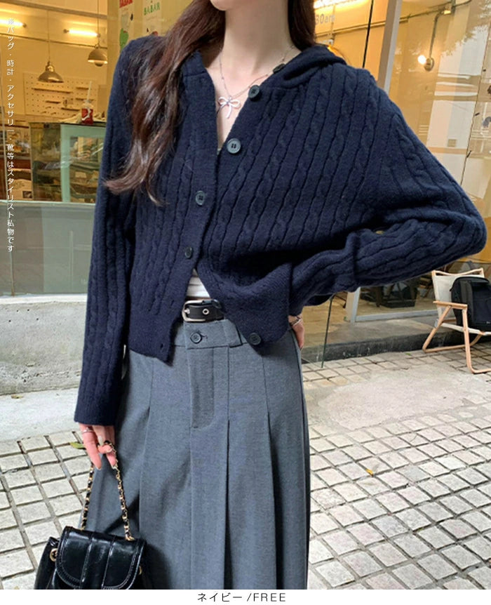 【 ケーブル編みフーディーカーディガン 】 季節の変わり目にぴったりな、 ケーブル編みデザインのフーディーカーディガン。 程よい厚みで軽やかに羽織れるのに、見た目も暖かみたっぷり。 ボタンを閉じてトップスとしても、 開けてライトアウターとしても使える万能アイテム。 裾と袖口はリブ仕様でシルエットをすっきりと引き締めてくれます。 フード付きで程よくカジュアルな印象に仕上げました。 《商品ポイント》 表情豊かなケーブル編みデザイン 程よいゆとりのリラックスシルエット 首元を守るフード付きで防寒性UP ボタン付きで羽織り・トップスどちらでも◎ 袖口&裾はリブ仕様でメリハリのある印象 《デザイン・シルエット》 クラシックなケーブルニットを、 フード付きでこなれ感たっぷりに仕上げたデザイン。 ヒップに少しかかる丈感で、 パンツにもスカートにも合わせやすく、 バランスの良いシルエットが魅力。 前立ての太めリブと黒ボタンが程よいアクセントになり、 カジュアルながらも大人っぽく仕上がります。 《コーディネート提案》 カジュアルに:デニム×ロゴTに羽織ってラフな休日スタイル 通勤風に:ワイドパンツ×ローファーで大人きれいめに スカート合わせで:ロングスカートと合わせればフェミニンな印象に フードを活かして:キャップ+スニーカーでストリートMIXコーデも◎ 《サイズ・カラーバリエーション》 サイズ:FREEサイズ カラー:ワインレッド ネイビー グレー ベージュ 《素材・機能性》 ・素材:ポリエステル100% ・透け感:ほとんど透けない ・伸縮性:あり ・厚み:厚手 |