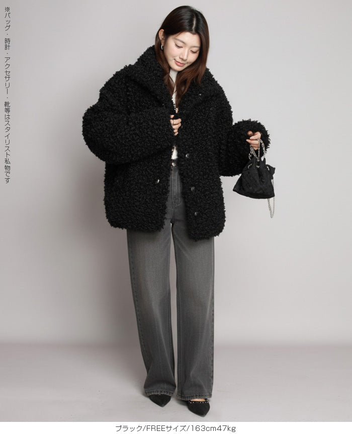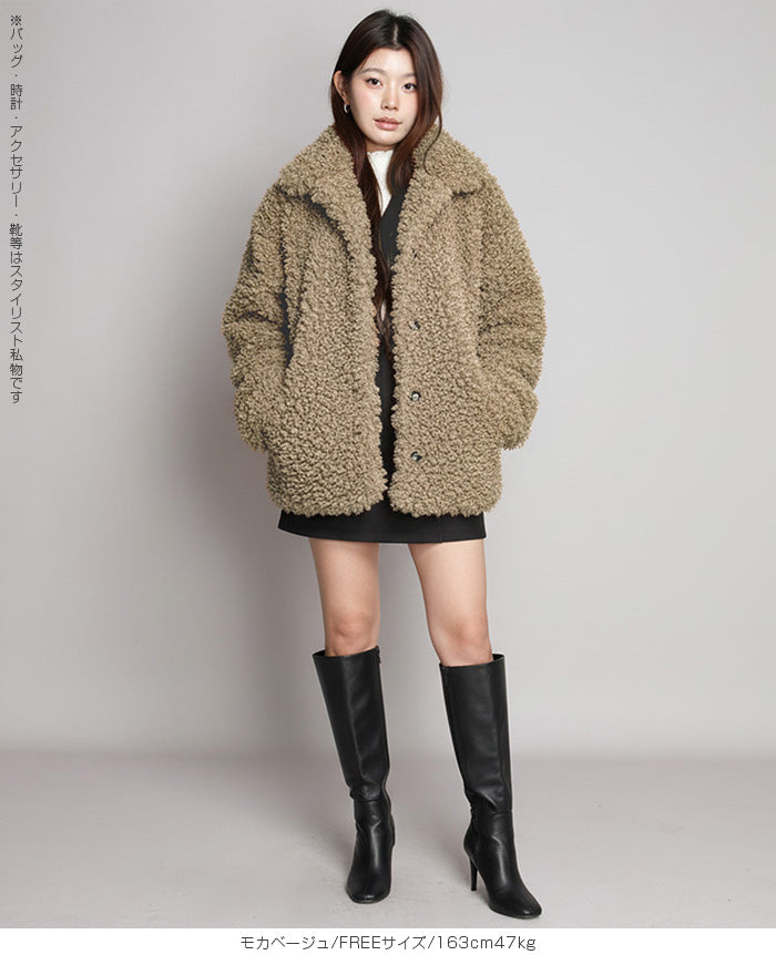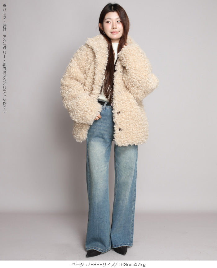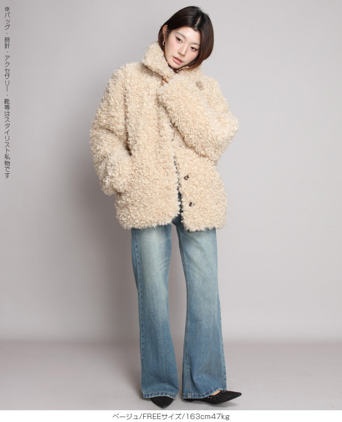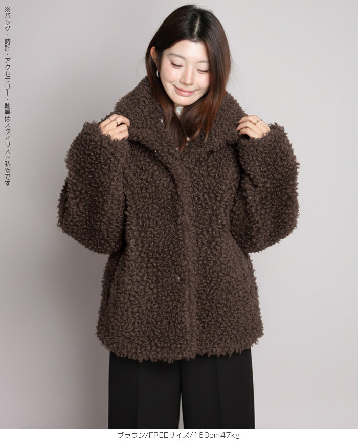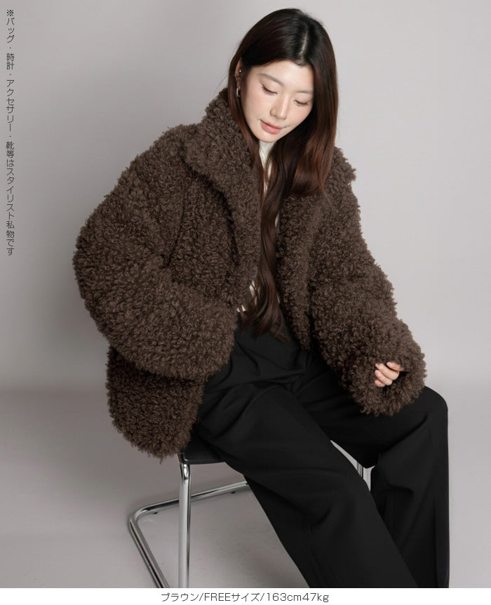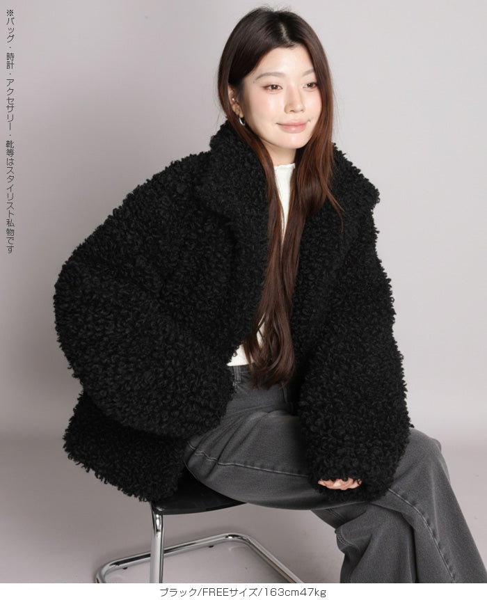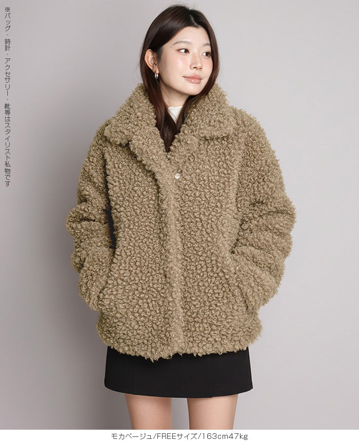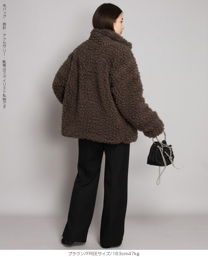 【プードルファーブルゾン】 まるでプードルのようにふわふわ・くるんとした毛並みが可愛い、季節感たっぷりのショート丈ファーブルゾン。 軽い着心地ながらしっかり暖かく、秋冬のデイリーからお出かけまで幅広く活躍。立ち襟としても使える衿元と大きめボタンで、ほんのりモードな印象をプラスしました。 丸みのあるシルエットが女性らしさを引き立て、厚手ニットも楽にレイヤードできる快適な着心地。羽織るだけで旬のコーデに仕上がる大人の愛されアウターです。 《商品ポイント》 プードル調のくるんとした毛並みが可愛い 軽いのにしっかり暖かい防寒性 立ち襟にもなる衿で小顔見せ 丸みのある女性らしいシルエット 厚手ニットも重ねやすいゆったり設計 どんなコーデにも合わせやすいショート丈 《デザイン・シルエット》 やわらかなプードルファーを贅沢に使用し、存在感のある立体的な毛並みが魅力。 ゆったりした身幅×ドロップショルダーで抜け感を演出しつつ、コンパクトな着丈で全体のバランスが整うシルエット。 丸みのあるフォルムが女性らしさをプラスし、スタンドカラーや大きめボタンが大人っぽいモード感を添えます。 《コーディネート提案》 スラックス×ショートブーツ:きれいめ大人コーデ ロングスカート:女性らしさを引き立てる上品スタイル デニム合わせ:デイリーに使える王道カジュアル 細身ボトム:メリハリのあるすっきりシルエット ワンピースの上に羽織る:フェミニンで大人可愛い雰囲気に 羽織るだけで旬コーデが完成する万能アウターです。 《サイズ・カラーバリエーション》 サイズ:フリーサイズ カラー:モカベージュ/ベージュ/ブラウン/ブラック 《素材・機能性》 表地:フェイクファー(プードルファー) 裏地:あり 伸縮性:なし 光沢感:なし ポケット:あり 洗濯:ドライクリーニング推奨 軽量なのに暖かい保温性素材 |