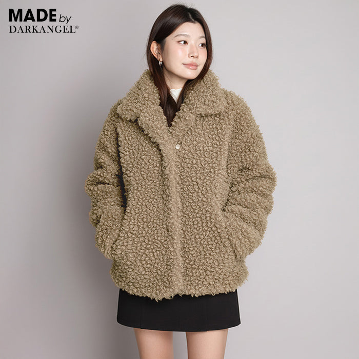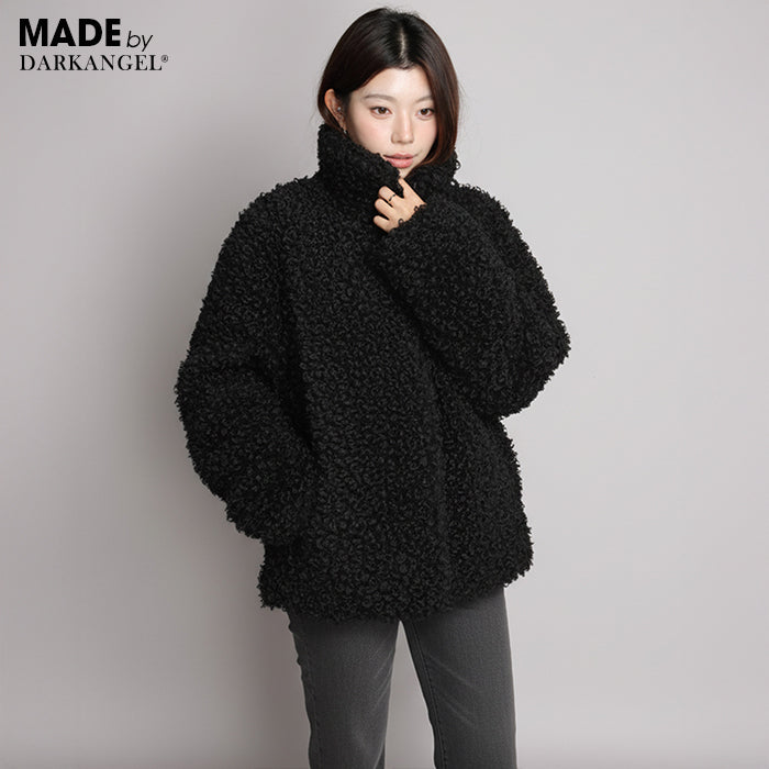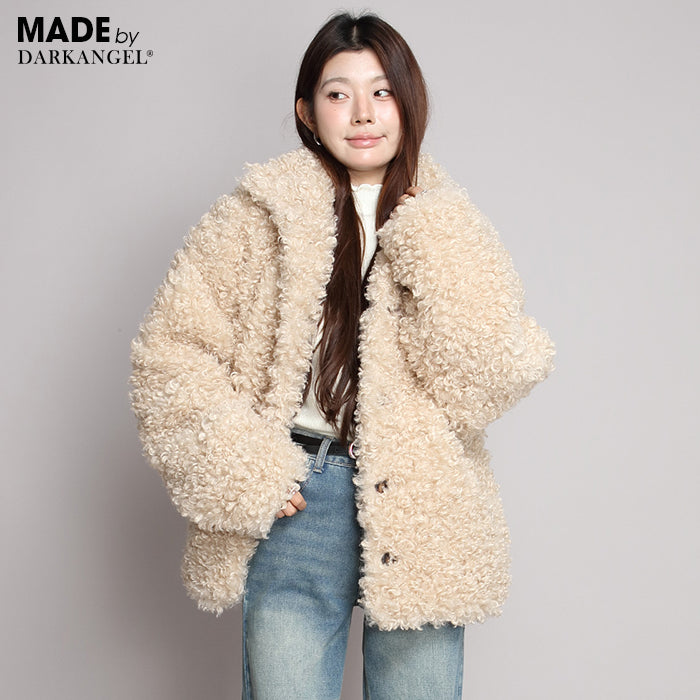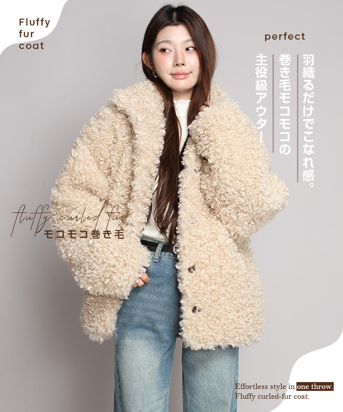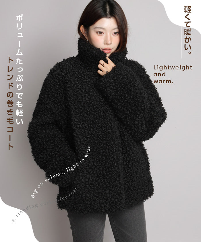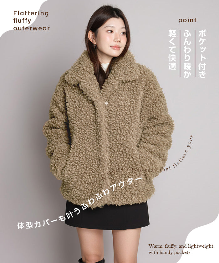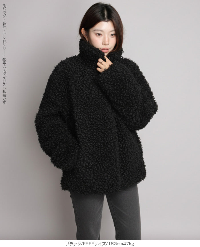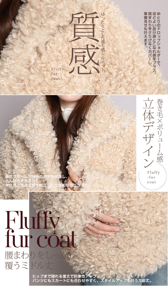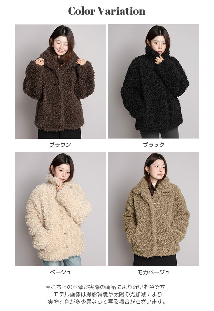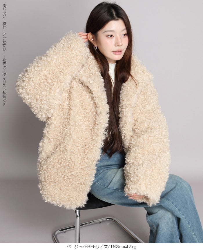 【プードルファーブルゾン】 まるでプードルのようにふわふわ・くるんとした毛並みが可愛い、季節感たっぷりのショート丈ファーブルゾン。 軽い着心地ながらしっかり暖かく、秋冬のデイリーからお出かけまで幅広く活躍。立ち襟としても使える衿元と大きめボタンで、ほんのりモードな印象をプラスしました。 丸みのあるシルエットが女性らしさを引き立て、厚手ニットも楽にレイヤードできる快適な着心地。羽織るだけで旬のコーデに仕上がる大人の愛されアウターです。 《商品ポイント》 プードル調のくるんとした毛並みが可愛い 軽いのにしっかり暖かい防寒性 立ち襟にもなる衿で小顔見せ 丸みのある女性らしいシルエット 厚手ニットも重ねやすいゆったり設計 どんなコーデにも合わせやすいショート丈 《デザイン・シルエット》 やわらかなプードルファーを贅沢に使用し、存在感のある立体的な毛並みが魅力。 ゆったりした身幅×ドロップショルダーで抜け感を演出しつつ、コンパクトな着丈で全体のバランスが整うシルエット。 丸みのあるフォルムが女性らしさをプラスし、スタンドカラーや大きめボタンが大人っぽいモード感を添えます。 《コーディネート提案》 スラックス×ショートブーツ:きれいめ大人コーデ ロングスカート:女性らしさを引き立てる上品スタイル デニム合わせ:デイリーに使える王道カジュアル 細身ボトム:メリハリのあるすっきりシルエット ワンピースの上に羽織る:フェミニンで大人可愛い雰囲気に 羽織るだけで旬コーデが完成する万能アウターです。 《サイズ・カラーバリエーション》 サイズ:フリーサイズ カラー:モカベージュ/ベージュ/ブラウン/ブラック 《素材・機能性》 表地:フェイクファー(プードルファー) 裏地:あり 伸縮性:なし 光沢感:なし ポケット:あり 洗濯:ドライクリーニング推奨 軽量なのに暖かい保温性素材 |