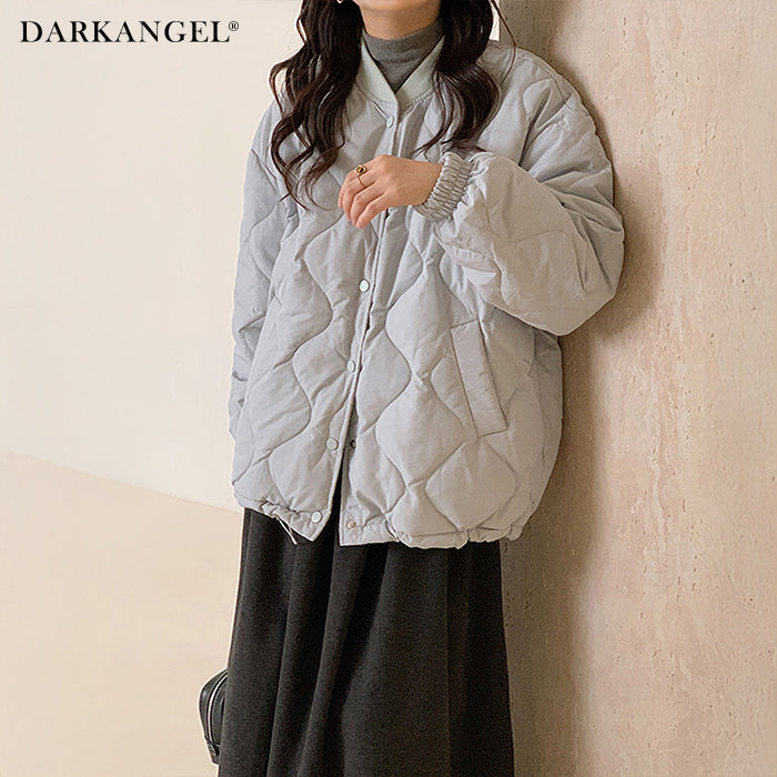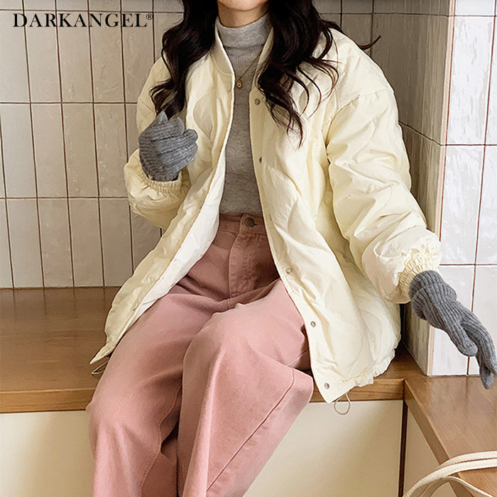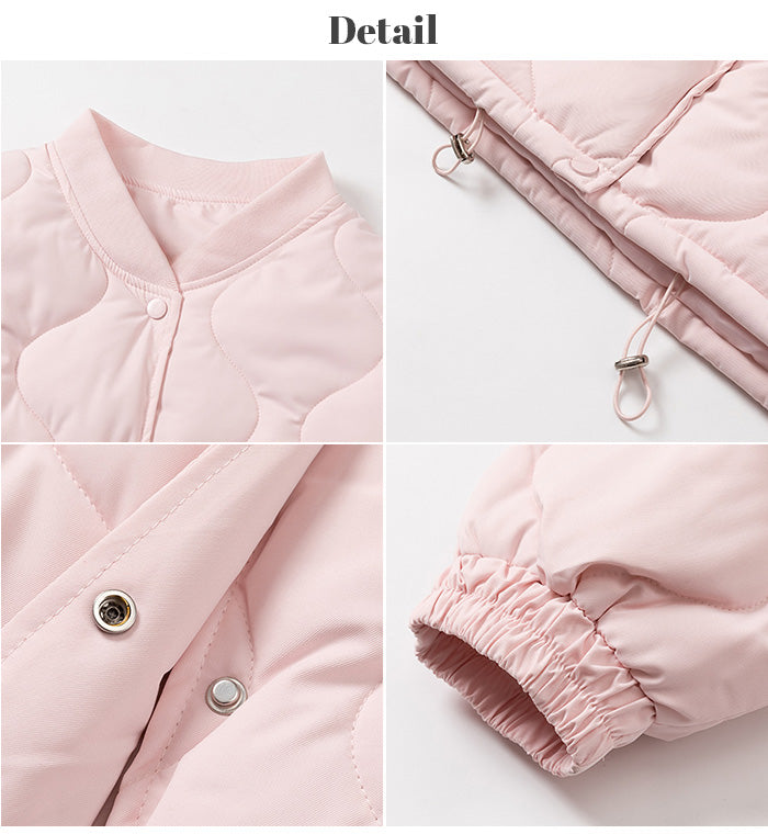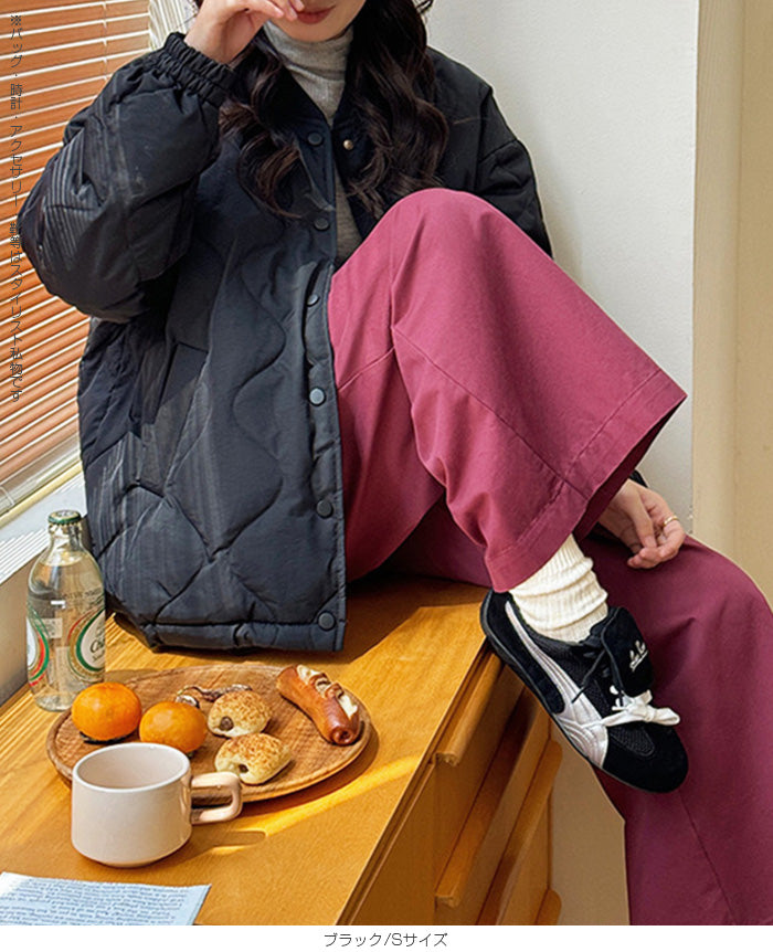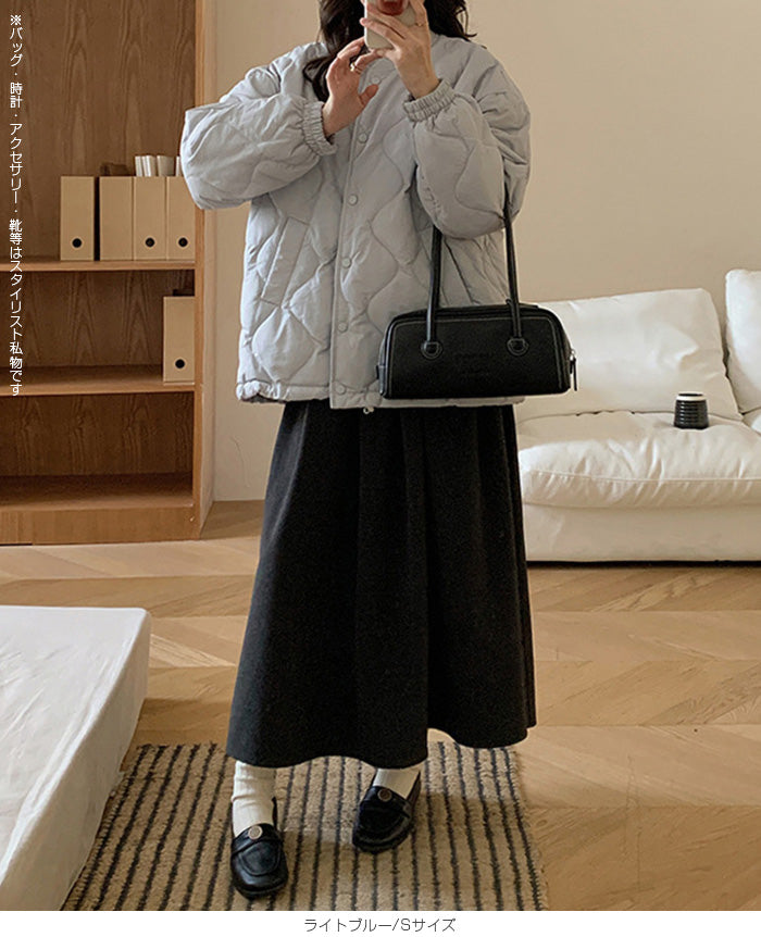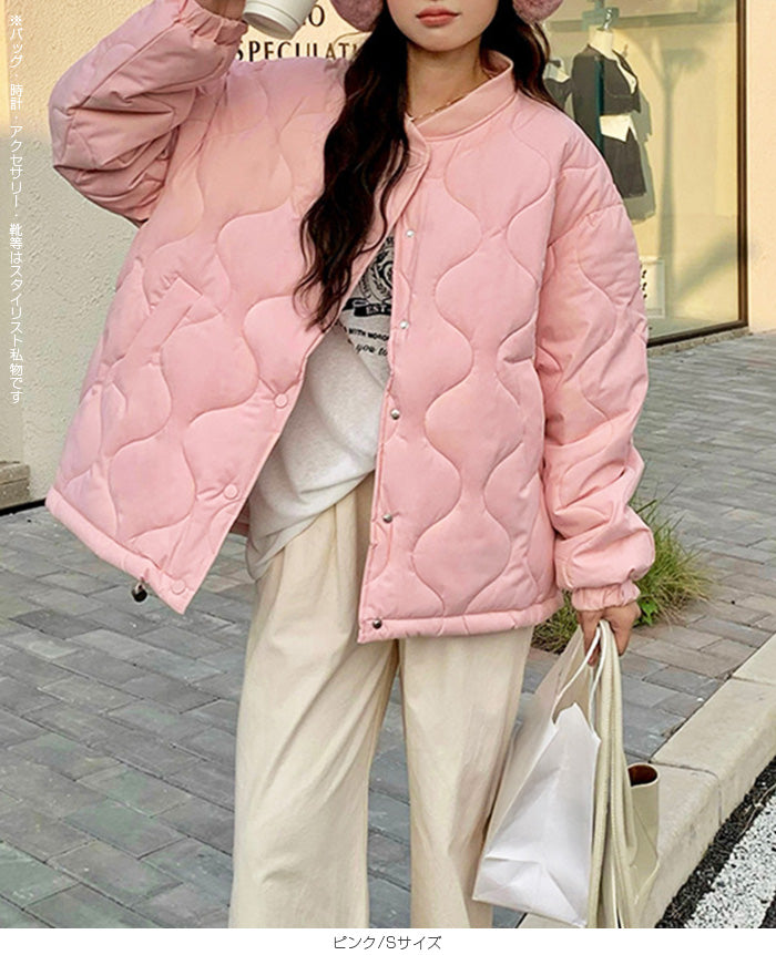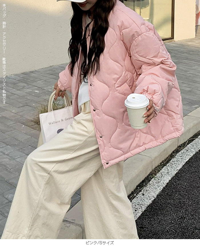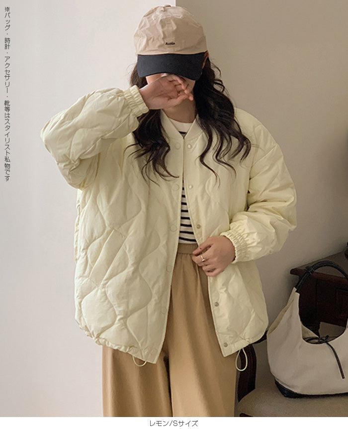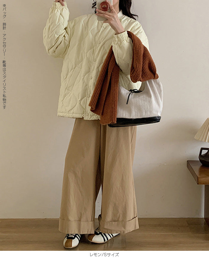 【ドロストノーカラーキルティングジャケット】 防寒とおしゃれを両立できる、ドロスト付きノーカラーキルティングジャケット。 裾のドロストと袖口ゴムで風を通しにくく、マフラーやフードと合わせてもバランスが取りやすいすっきりノーカラーデザイン。 ゆったりめのシルエットで着心地も快適。 パンツにもスカートにも合わせやすく、幅広いテイストにマッチする1枚です。 《商品ポイント》 ・裾ドロストで防寒&シルエット調整が可能 ・ノーカラーでマフラーやタートルネックとも相性◎ ・袖口ゴムで冷気の侵入をブロック ・前開きはスナップボタンで脱ぎ着しやすい ・カジュアル〜甘めまでコーデを選ばない万能デザイン 《デザイン・シルエット》 ・体を包むようなゆったりとしたサイジングで腰回りまでしっかり防寒 ・丸みのあるコクーン風シルエットがやさしい印象に ・裾のドローストリングを絞るとシルエットの変化も楽しめる ・大人可愛い印象のキルティングステッチ 《コーディネート提案》 ・フレアスカートでガーリーに、デニムやジョガーパンツでカジュアルに ・首元がすっきりしているためマフラーやフード付きトップスも合わせやすい ・ミニボトム×ロングソックスと合わせて韓国っぽコーデにも 《サイズ・カラーバリエーション》 ・サイズ展開:S / M / L / XL ・カラー展開:ブラック / アイボリー / ピンク / ライトブルー / レモン / ラベンダー 《素材・機能性》 ・表地:ポリエステル100% ・裏地:あり ・生地の厚さ:厚め ・硬さ:ややハリあり ・透け感:なし ・伸縮性:なし ・保温性:高く、防寒アウターとして活躍 |