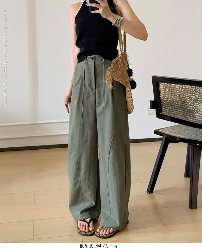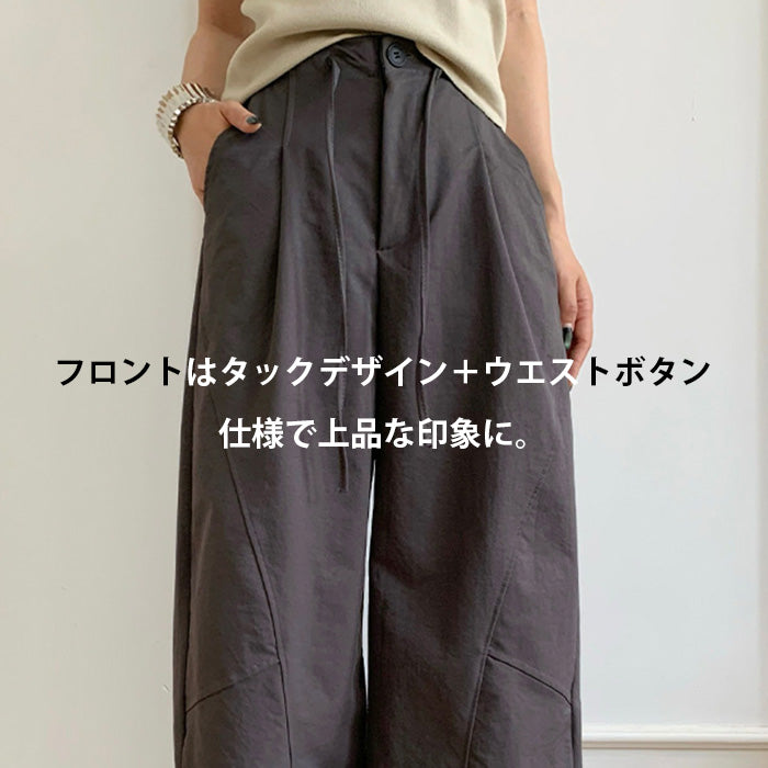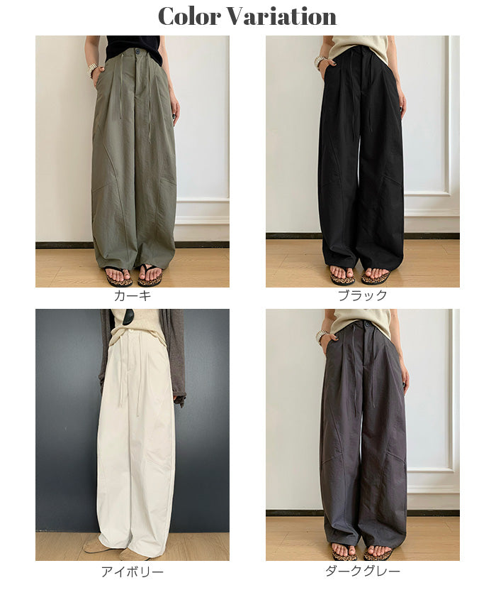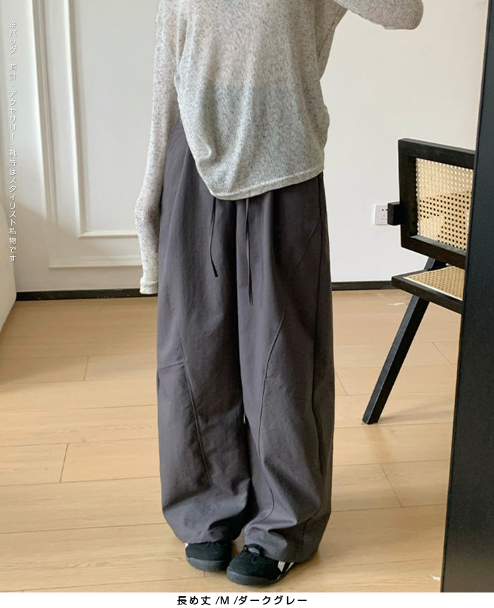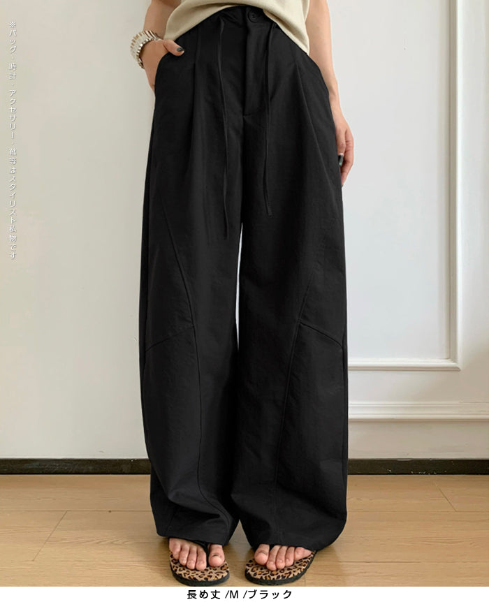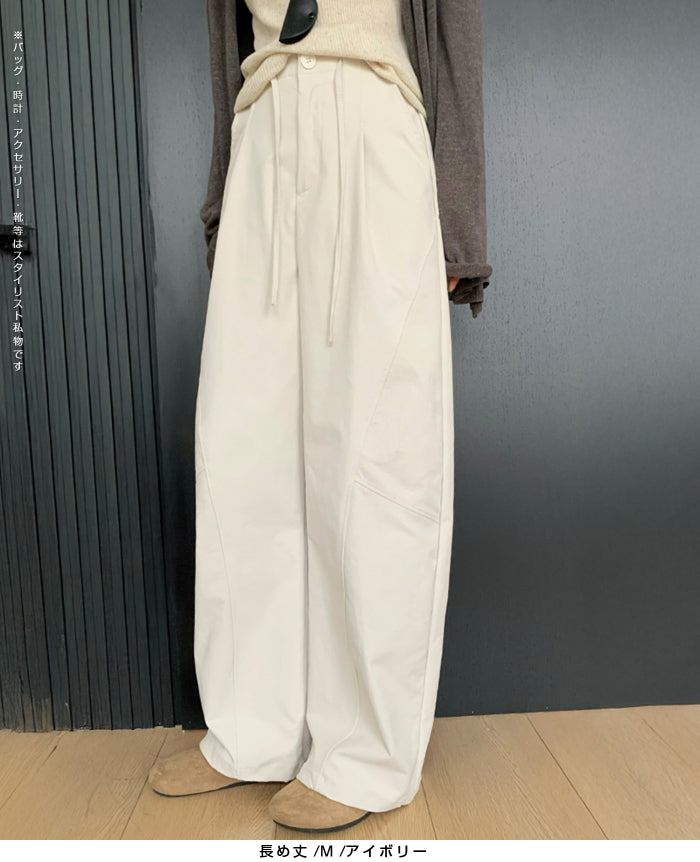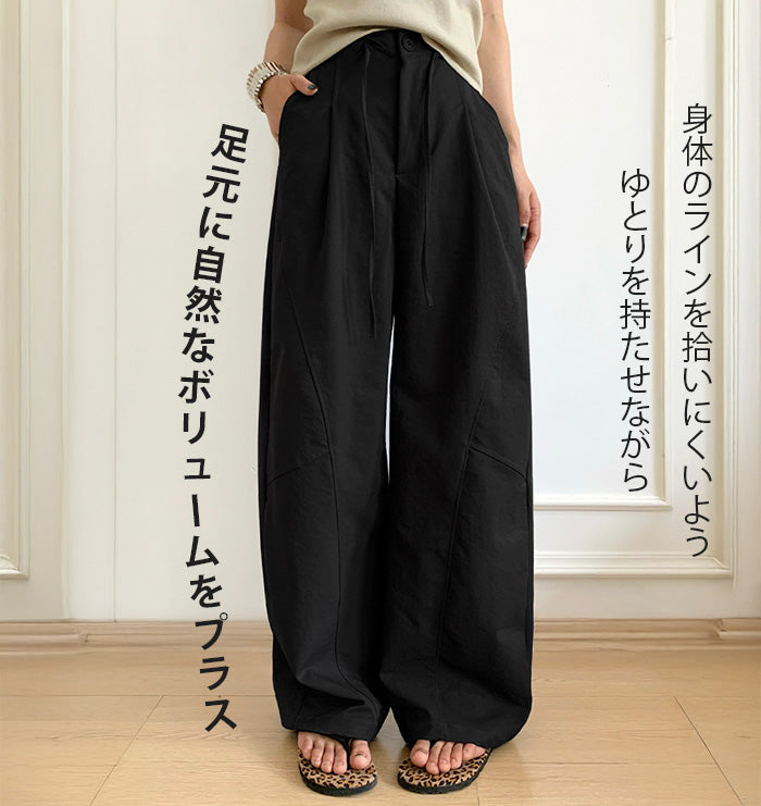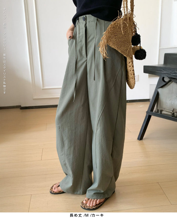 コクーンフォルムの丸みを帯びたシルエットが、 足元に抜け感を与えながらもトレンド感ある仕上がりに。 パネルラインの切り替えが視覚的なアクセントになり、 シンプルなトップスと合わせるだけで、 こなれた雰囲気が完成。 フロントはタックデザイン+ウエストボタン仕様で上品な印象に。 さらっとした軽めの生地で、 シーズンレスに活躍するのも嬉しいポイント。 《商品ポイント》 立体パターンで動きのあるラインを演出 前開きボタン&タック仕様で品よく仕上げ パネル切り替えがスタイリッシュな印象に 両サイドポケット付きで実用性も◎ ベーシックカラー展開で着回し自在 《デザイン・シルエット》 カーブライン構造:身体のラインを拾いにくいゆとりを持たせながら、 足元に自然なボリュームをプラス。 ウエストデザイン:ウエストはゴムなしで、前ボタンと内紐でサイズ調整可。 《コーディネート提案》 春夏:タンクトップやTシャツ、サンダル合わせで抜け感のあるリラックスコーデに。 秋冬:リブニットやジャケットと合わせて、シックな大人カジュアルに。 《サイズ・カラーバリエーション》 サイズ:M/L(普通丈/長め丈) カラー:ブラック/アイボリー/ダークグレー/カーキ 《素材・機能性》 ・素材:ポリエステル100% ・透け感:なし ・伸縮性:なし ・厚み:普通 |
