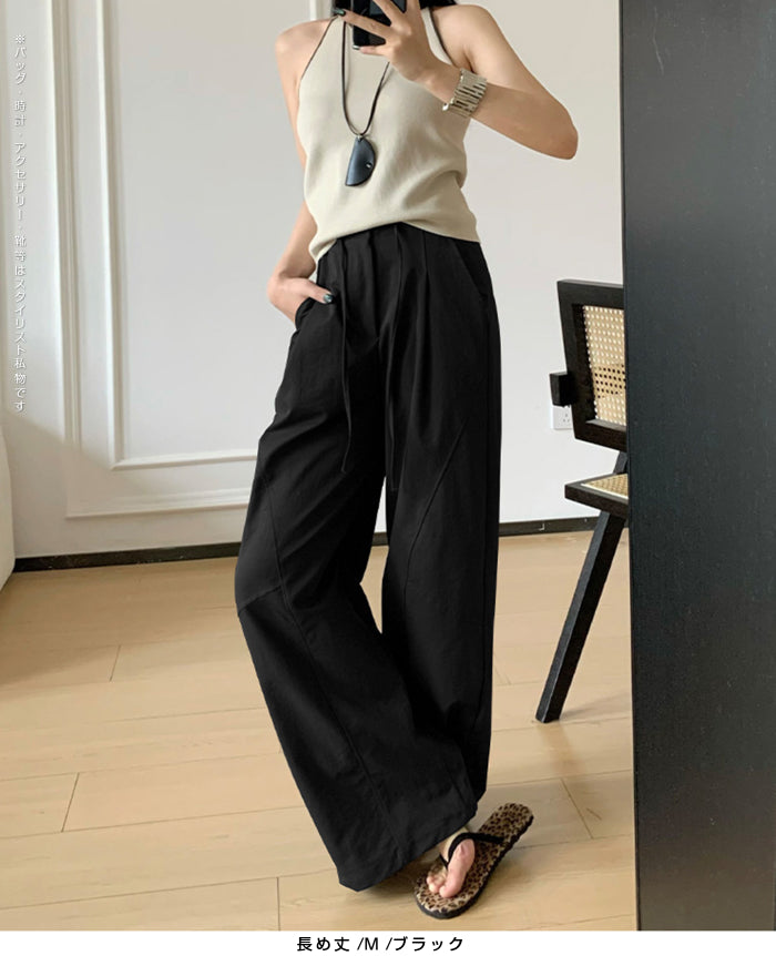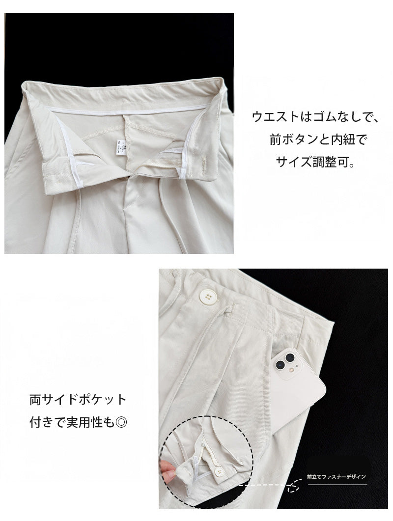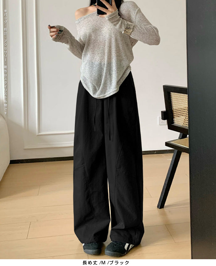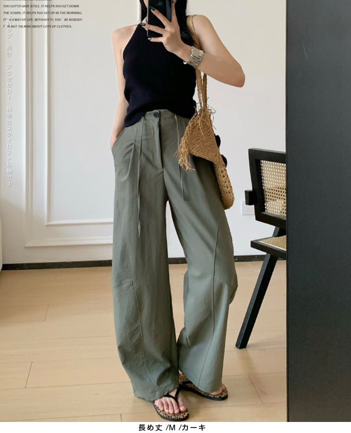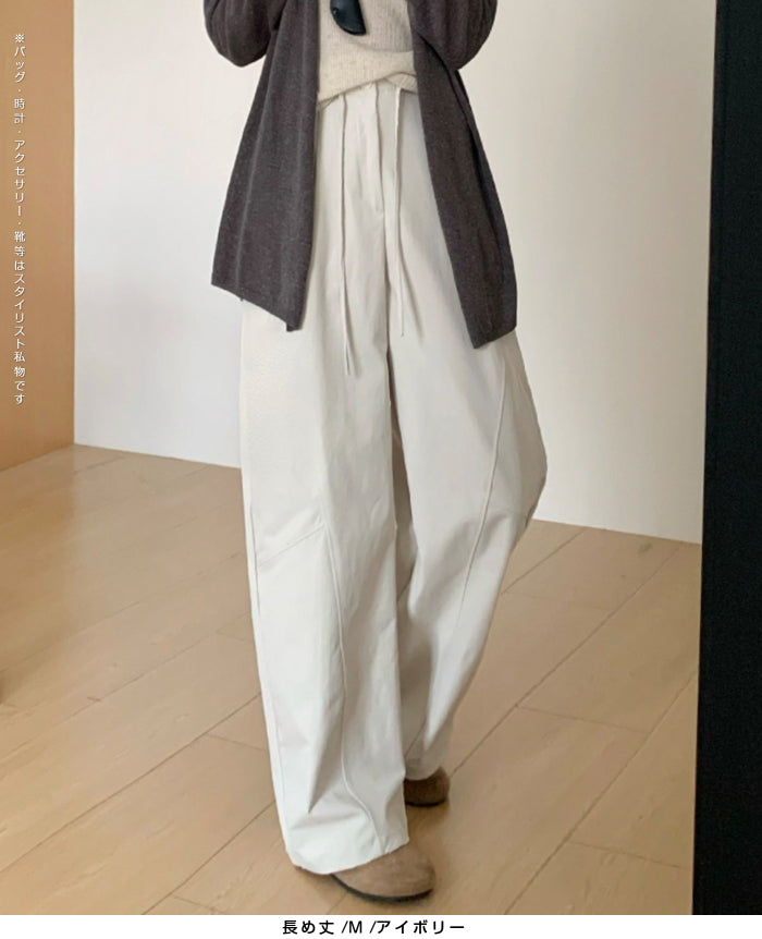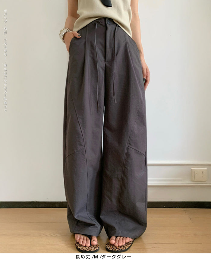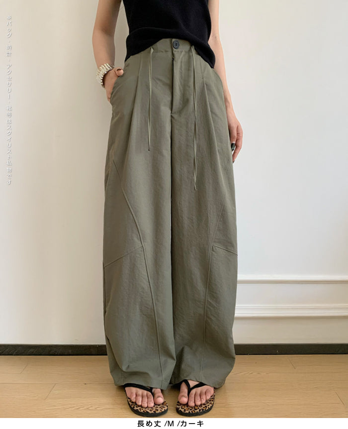 コクーンフォルムの丸みを帯びたシルエットが、 足元に抜け感を与えながらもトレンド感ある仕上がりに。 パネルラインの切り替えが視覚的なアクセントになり、 シンプルなトップスと合わせるだけで、 こなれた雰囲気が完成。 フロントはタックデザイン+ウエストボタン仕様で上品な印象に。 さらっとした軽めの生地で、 シーズンレスに活躍するのも嬉しいポイント。 《商品ポイント》 立体パターンで動きのあるラインを演出 前開きボタン&タック仕様で品よく仕上げ パネル切り替えがスタイリッシュな印象に 両サイドポケット付きで実用性も◎ ベーシックカラー展開で着回し自在 《デザイン・シルエット》 カーブライン構造:身体のラインを拾いにくいゆとりを持たせながら、 足元に自然なボリュームをプラス。 ウエストデザイン:ウエストはゴムなしで、前ボタンと内紐でサイズ調整可。 《コーディネート提案》 春夏:タンクトップやTシャツ、サンダル合わせで抜け感のあるリラックスコーデに。 秋冬:リブニットやジャケットと合わせて、シックな大人カジュアルに。 《サイズ・カラーバリエーション》 サイズ:M/L(普通丈/長め丈) カラー:ブラック/アイボリー/ダークグレー/カーキ 《素材・機能性》 ・素材:ポリエステル100% ・透け感:なし ・伸縮性:なし ・厚み:普通 |