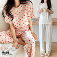 【 ハートルームウェア上下セット 】 ふわっと柔らか、 着心地バツグンな半袖ルームウェア! リブ調の生地に、 総柄の大人可愛いデザインが魅力です。 おうち時間をリラックスして過ごすのに最適なゆったりシルエット。 春夏にぴったりな、 楽ちん&おしゃれが叶う一枚です? |