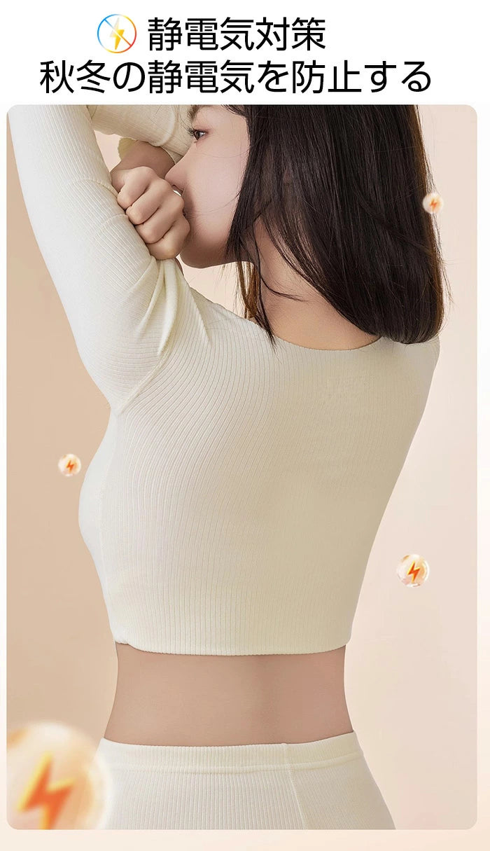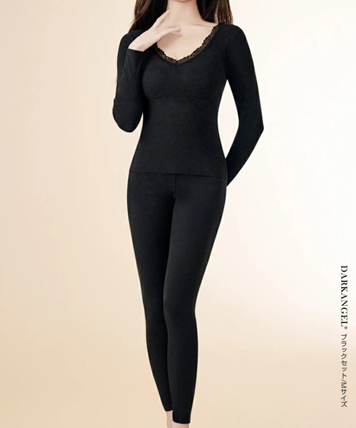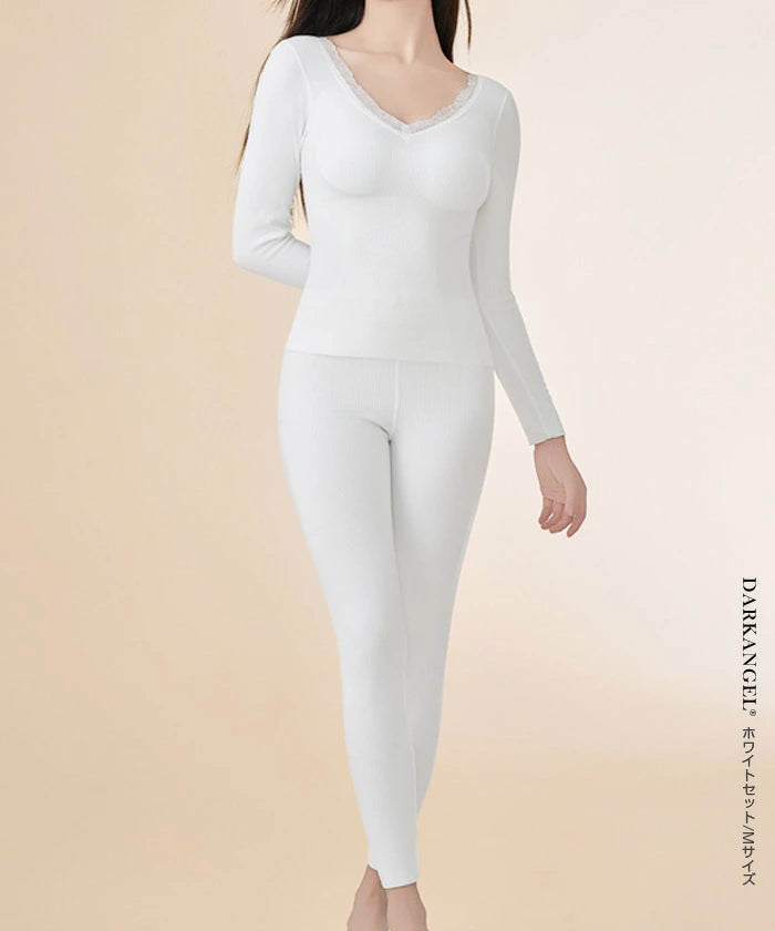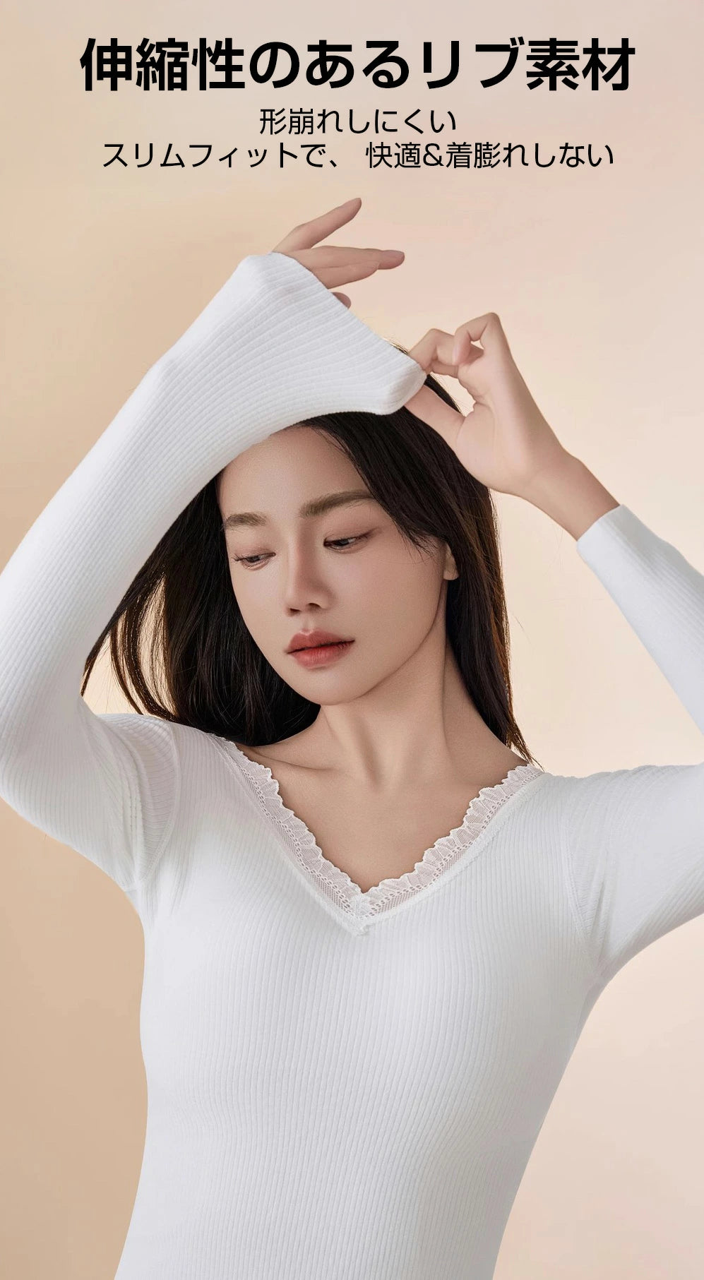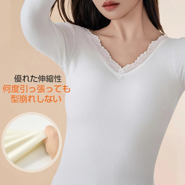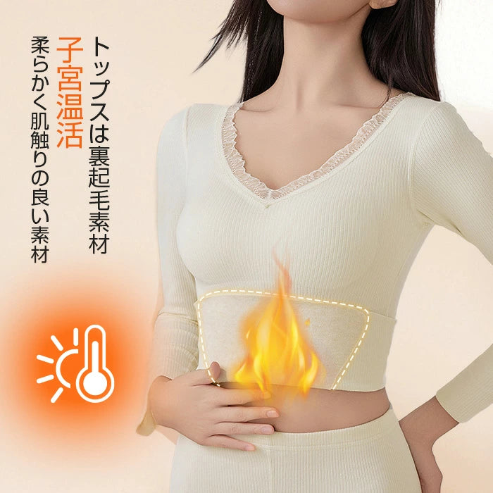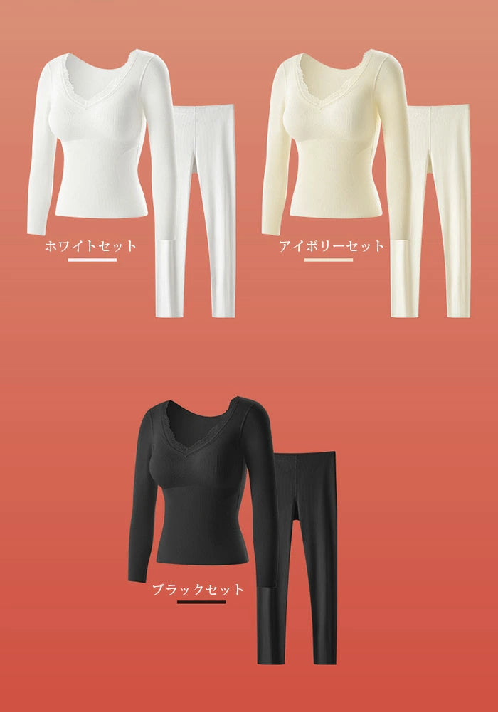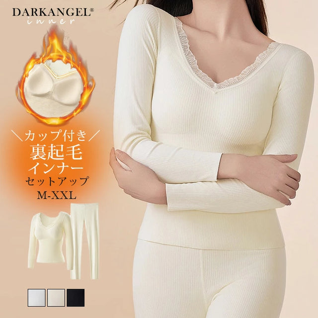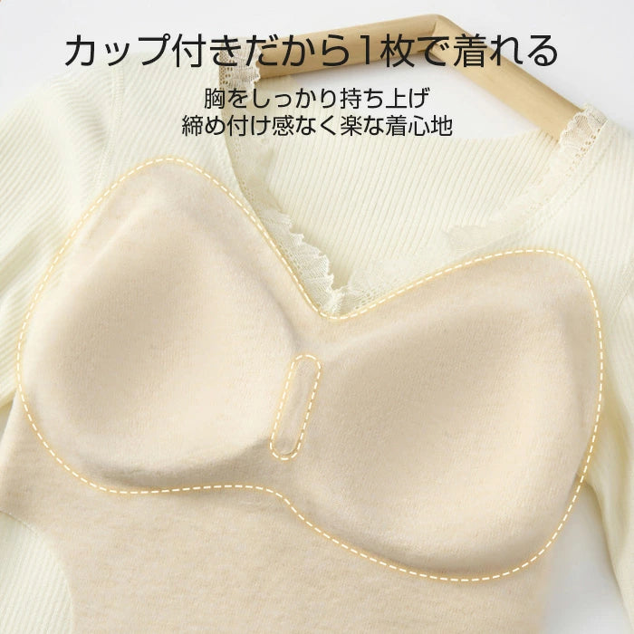 【カップ付き裏起毛インナーセットアップ 】 カップ付き・あったかインナー カシミヤ&シルク素材で 秋冬の乾燥肌を守りつつ、暖かさをキープ。 セクシーなレースVネックで首元を美しく演出! 一体型カップで胸をしっかりサポートして垂れを防ぎ、 洗濯機で洗ってもズレない。 |