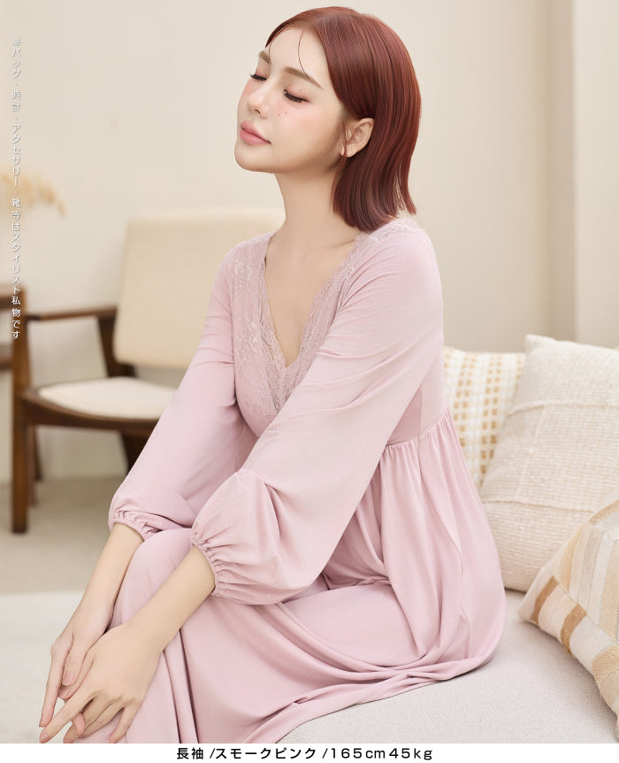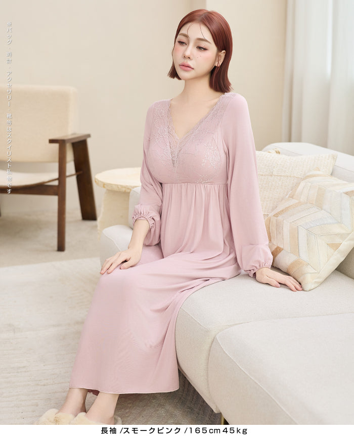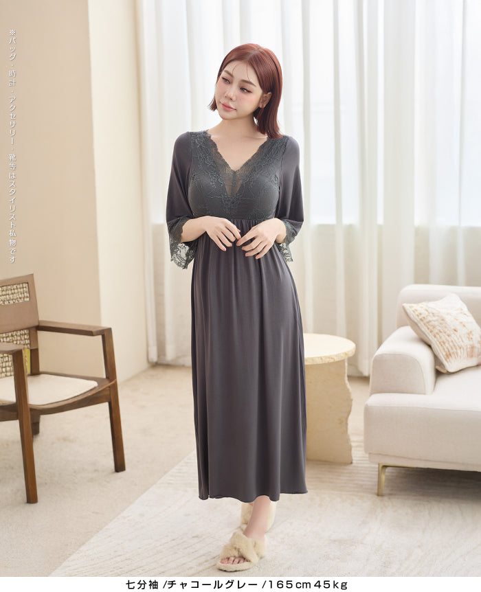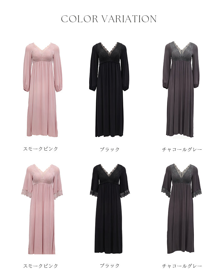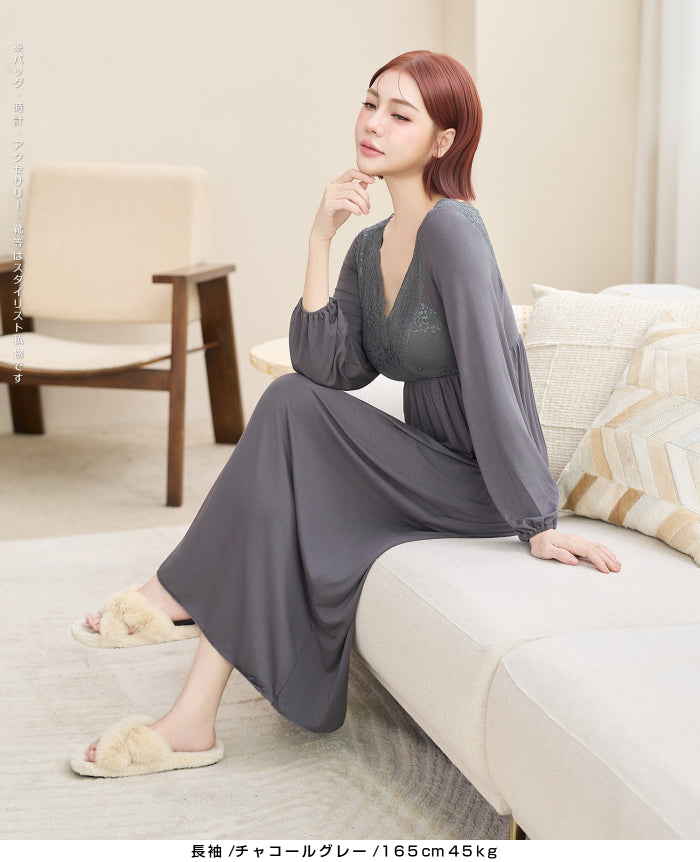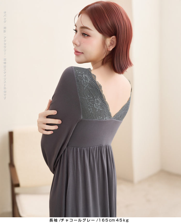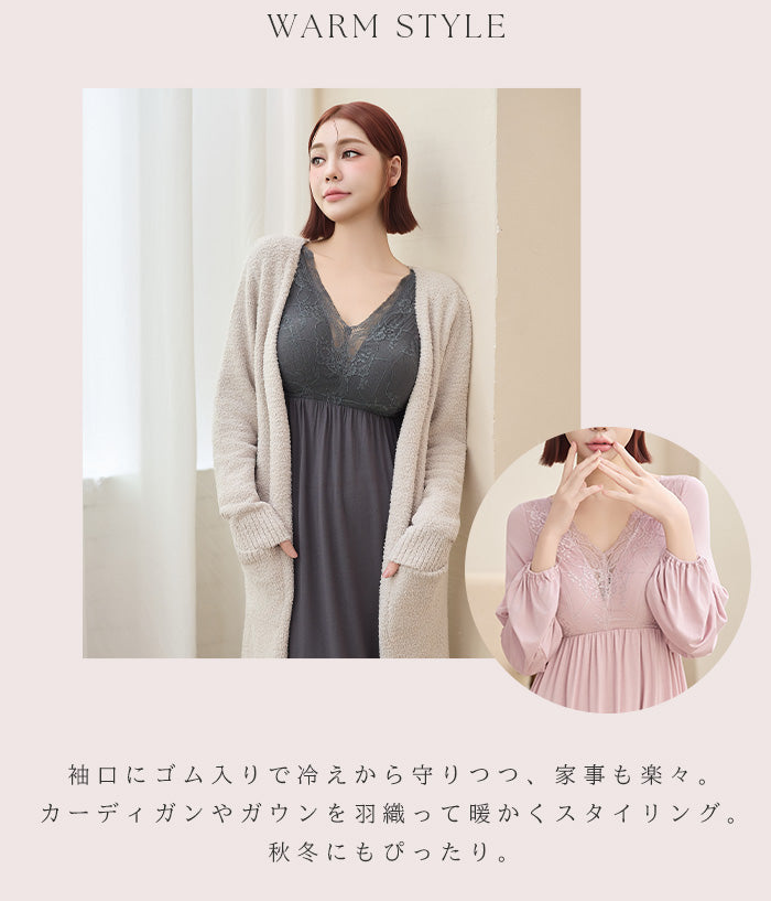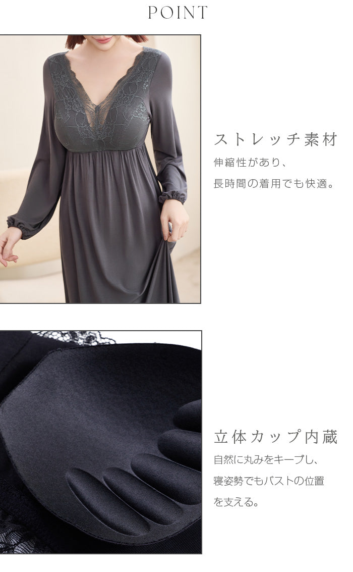 毎日のナイトタイムを特別にしてくれる 【ナイトブラ一体型ワンピース】が登場。 胸元を優しく支えるカップ付き仕様で、 寝ている間も美しいバストラインをキープ。 昼夜問わず快適に着られるルームウェアとしても大活躍します。 選べるデザインは2タイプ。 長袖タイプ:袖口にゴム入りで実用性◎オールシーズン着用頂けます。 七分袖タイプ:袖口に上品なレースをあしらい、暑い季節にも涼やかでフェミニン。 前後Vネックで顔周りをすっきり見せ、 大人フェミニンな雰囲気を演出。 ロング丈シルエットが自然な落ち感を生み、 体型カバーも叶います。 柔らかなストレッチ素材を採用し、 快適な着心地が続きます。 旅行や宿泊時にも持ち運びしやすく、 ギフトにもおすすめの一着です。 《商品ポイント》 カップ付きで寝ながら自然にバストをサポート。 長袖/七分袖の2タイプ展開でオールシーズン対応。 前後Vネックデザインで上品&大人の女性らしさを演出。 マキシ丈で体型カバーも叶う。 快適素材で長時間の着用も心地よい。 《デザイン・シルエット》 胸元には華やかなレースを施し、 女性らしさを引き立てるデザイン。 ストンと落ちるシルエットでリラックス感がありつつも、 すっきりとしたラインを演出。 長袖は実用性を重視したシンプルな仕上がり、 七分袖はレース袖で華やかな印象をプラス。 《コーディネート提案》 秋冬:長袖タイプにカーディガンやガウンを羽織ってさらに暖かく。 春夏:七分袖タイプを一枚でさらりと着て涼しく快適に。 旅行や宿泊:持ち運びやすく、ホテルでも快適なルームウェアとして活躍。 ギフト:母の日や誕生日など、プレゼントにもおすすめ。 《サイズ・カラーバリエーション》 サイズ:65M/65L/70M/70L/75M/75L タイプ:七分袖/長袖 カラー:スモークピンク/ブラック/チャコールグレー 《素材・機能性》 ・素材:本体:レーヨン90%、ポリウレタン10% レース:ナイロン90%、ポリウレタン10% ・透け感:なし ・伸縮性:あり(優しくフィット) ・厚み:薄手 |