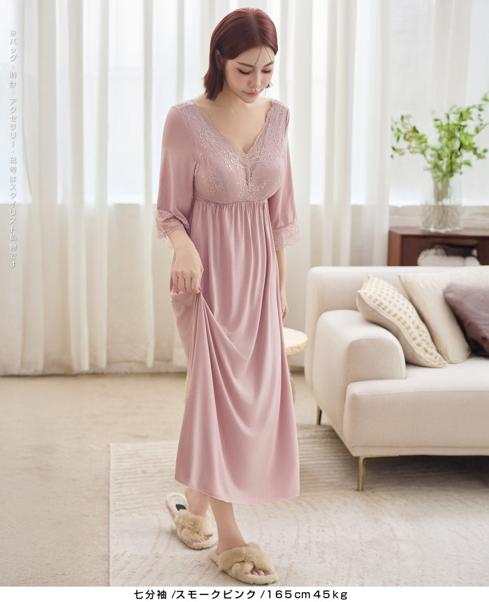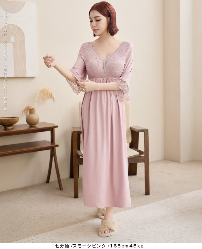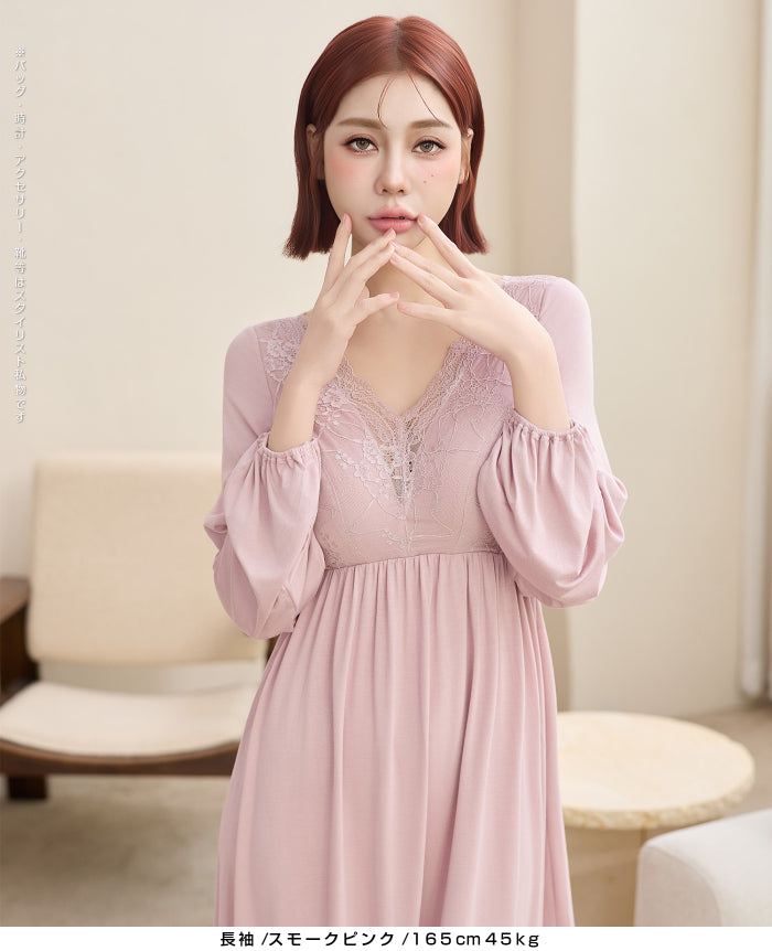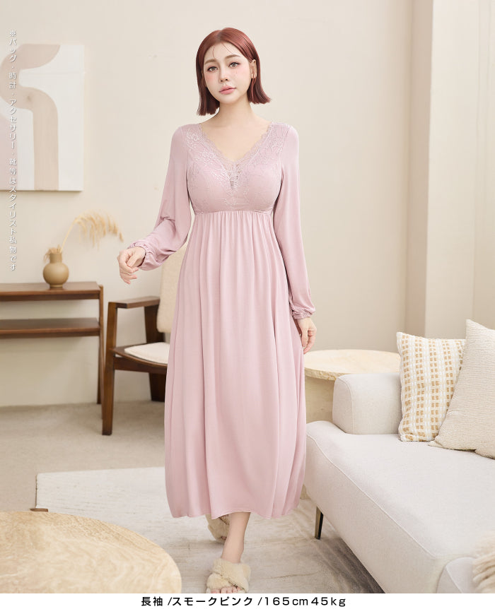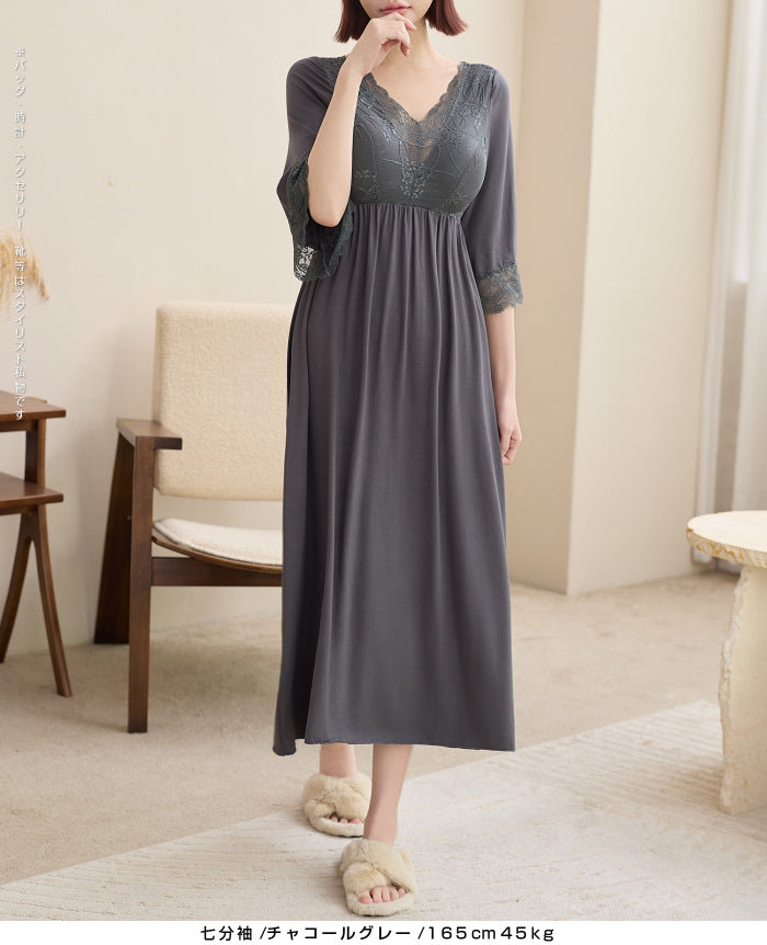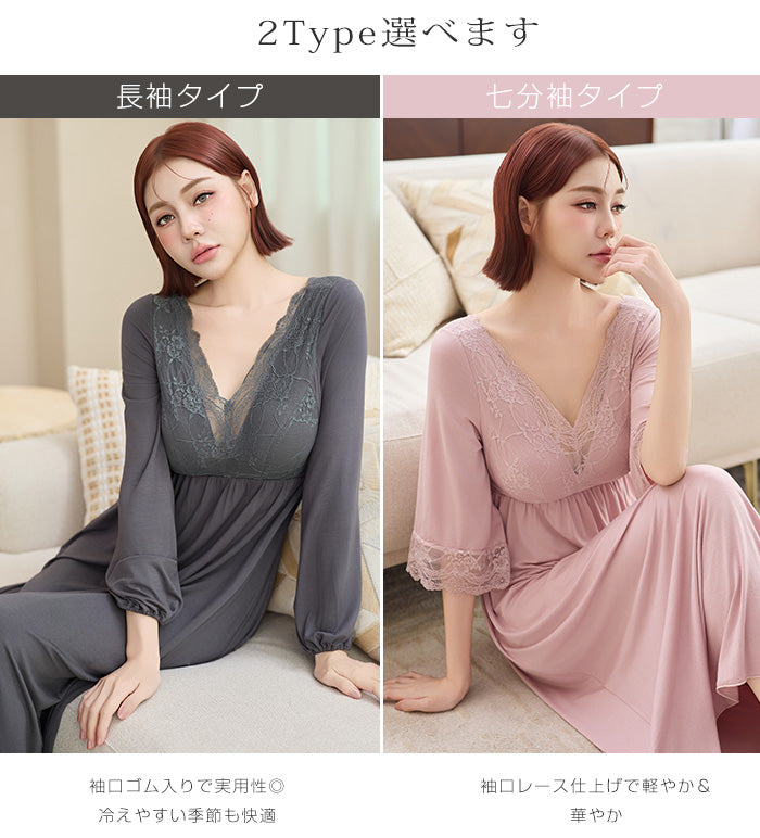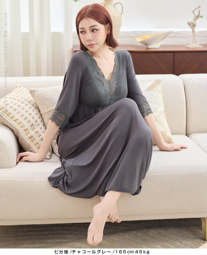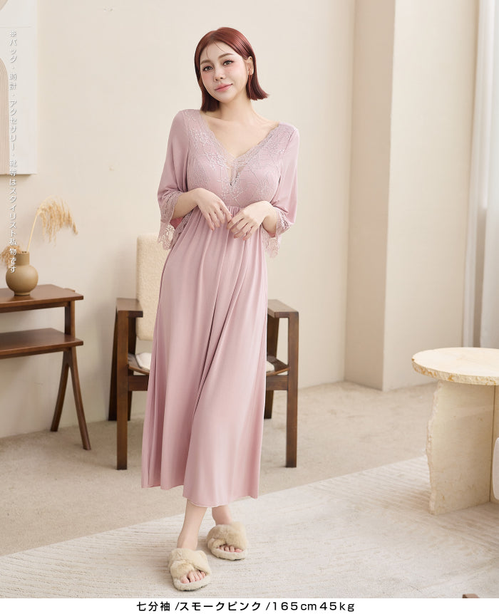 毎日のナイトタイムを特別にしてくれる 【ナイトブラ一体型ワンピース】が登場。 胸元を優しく支えるカップ付き仕様で、 寝ている間も美しいバストラインをキープ。 昼夜問わず快適に着られるルームウェアとしても大活躍します。 選べるデザインは2タイプ。 長袖タイプ:袖口にゴム入りで実用性◎オールシーズン着用頂けます。 七分袖タイプ:袖口に上品なレースをあしらい、暑い季節にも涼やかでフェミニン。 前後Vネックで顔周りをすっきり見せ、 大人フェミニンな雰囲気を演出。 ロング丈シルエットが自然な落ち感を生み、 体型カバーも叶います。 柔らかなストレッチ素材を採用し、 快適な着心地が続きます。 旅行や宿泊時にも持ち運びしやすく、 ギフトにもおすすめの一着です。 《商品ポイント》 カップ付きで寝ながら自然にバストをサポート。 長袖/七分袖の2タイプ展開でオールシーズン対応。 前後Vネックデザインで上品&大人の女性らしさを演出。 マキシ丈で体型カバーも叶う。 快適素材で長時間の着用も心地よい。 《デザイン・シルエット》 胸元には華やかなレースを施し、 女性らしさを引き立てるデザイン。 ストンと落ちるシルエットでリラックス感がありつつも、 すっきりとしたラインを演出。 長袖は実用性を重視したシンプルな仕上がり、 七分袖はレース袖で華やかな印象をプラス。 《コーディネート提案》 秋冬:長袖タイプにカーディガンやガウンを羽織ってさらに暖かく。 春夏:七分袖タイプを一枚でさらりと着て涼しく快適に。 旅行や宿泊:持ち運びやすく、ホテルでも快適なルームウェアとして活躍。 ギフト:母の日や誕生日など、プレゼントにもおすすめ。 《サイズ・カラーバリエーション》 サイズ:65M/65L/70M/70L/75M/75L タイプ:七分袖/長袖 カラー:スモークピンク/ブラック/チャコールグレー 《素材・機能性》 ・素材:本体:レーヨン90%、ポリウレタン10% レース:ナイロン90%、ポリウレタン10% ・透け感:なし ・伸縮性:あり(優しくフィット) ・厚み:薄手 |
