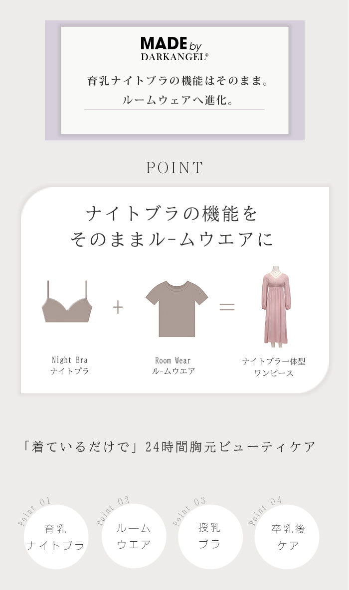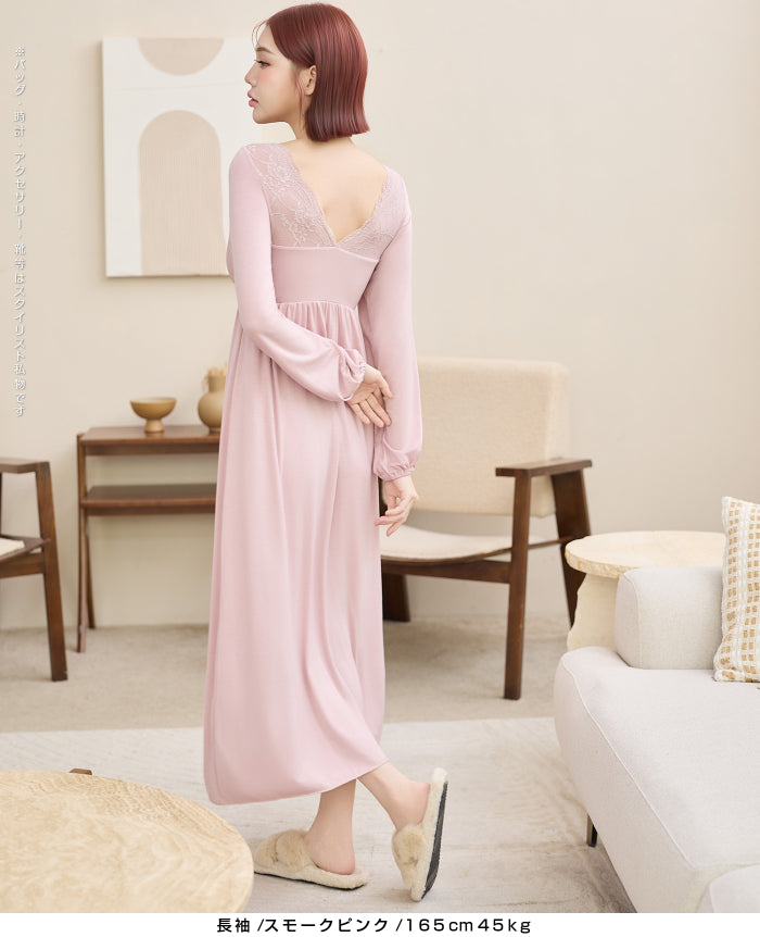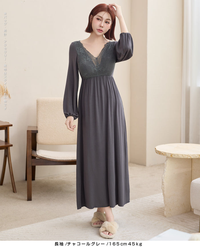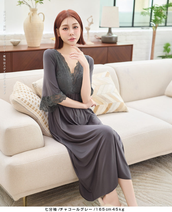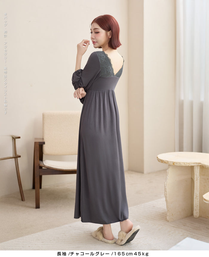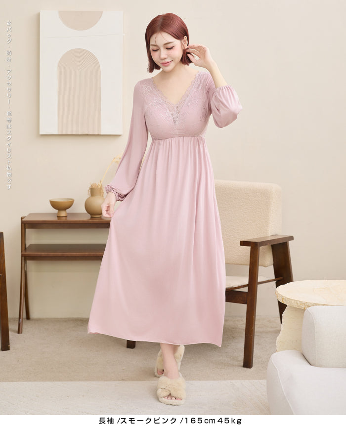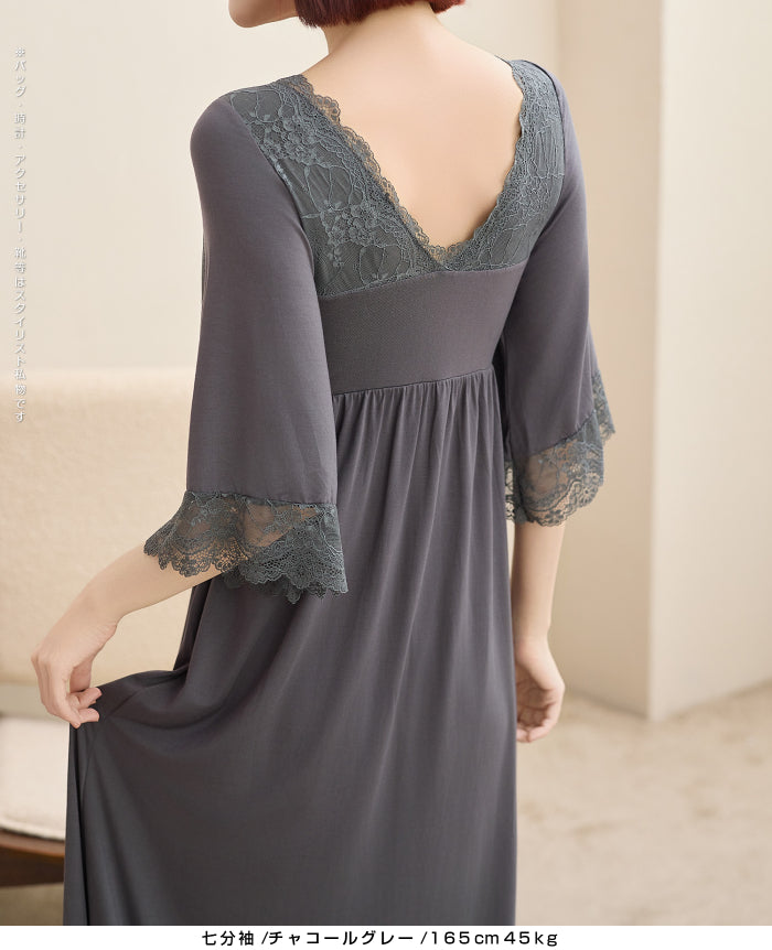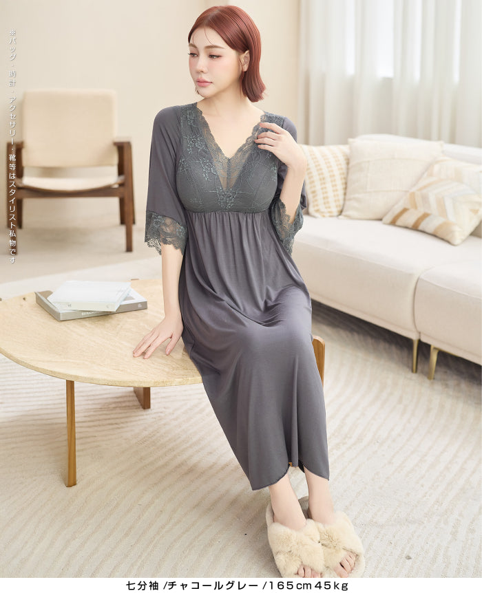 毎日のナイトタイムを特別にしてくれる 【ナイトブラ一体型ワンピース】が登場。 胸元を優しく支えるカップ付き仕様で、 寝ている間も美しいバストラインをキープ。 昼夜問わず快適に着られるルームウェアとしても大活躍します。 選べるデザインは2タイプ。 長袖タイプ:袖口にゴム入りで実用性◎オールシーズン着用頂けます。 七分袖タイプ:袖口に上品なレースをあしらい、暑い季節にも涼やかでフェミニン。 前後Vネックで顔周りをすっきり見せ、 大人フェミニンな雰囲気を演出。 ロング丈シルエットが自然な落ち感を生み、 体型カバーも叶います。 柔らかなストレッチ素材を採用し、 快適な着心地が続きます。 旅行や宿泊時にも持ち運びしやすく、 ギフトにもおすすめの一着です。 《商品ポイント》 カップ付きで寝ながら自然にバストをサポート。 長袖/七分袖の2タイプ展開でオールシーズン対応。 前後Vネックデザインで上品&大人の女性らしさを演出。 マキシ丈で体型カバーも叶う。 快適素材で長時間の着用も心地よい。 《デザイン・シルエット》 胸元には華やかなレースを施し、 女性らしさを引き立てるデザイン。 ストンと落ちるシルエットでリラックス感がありつつも、 すっきりとしたラインを演出。 長袖は実用性を重視したシンプルな仕上がり、 七分袖はレース袖で華やかな印象をプラス。 《コーディネート提案》 秋冬:長袖タイプにカーディガンやガウンを羽織ってさらに暖かく。 春夏:七分袖タイプを一枚でさらりと着て涼しく快適に。 旅行や宿泊:持ち運びやすく、ホテルでも快適なルームウェアとして活躍。 ギフト:母の日や誕生日など、プレゼントにもおすすめ。 《サイズ・カラーバリエーション》 サイズ:65M/65L/70M/70L/75M/75L タイプ:七分袖/長袖 カラー:スモークピンク/ブラック/チャコールグレー 《素材・機能性》 ・素材:本体:レーヨン90%、ポリウレタン10% レース:ナイロン90%、ポリウレタン10% ・透け感:なし ・伸縮性:あり(優しくフィット) ・厚み:薄手 |