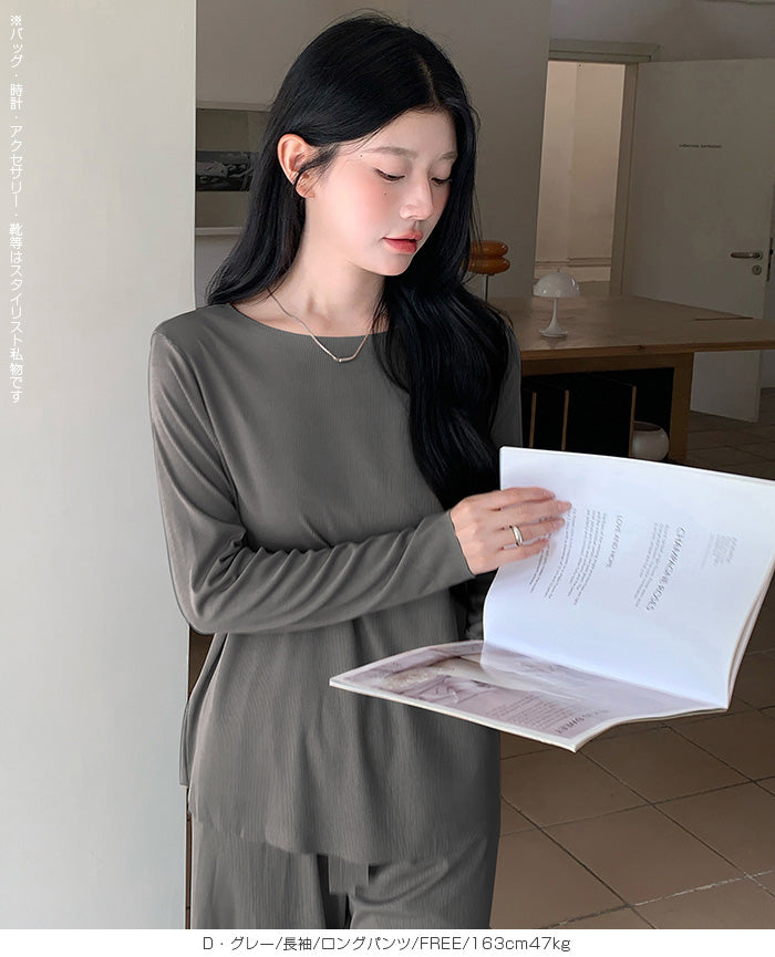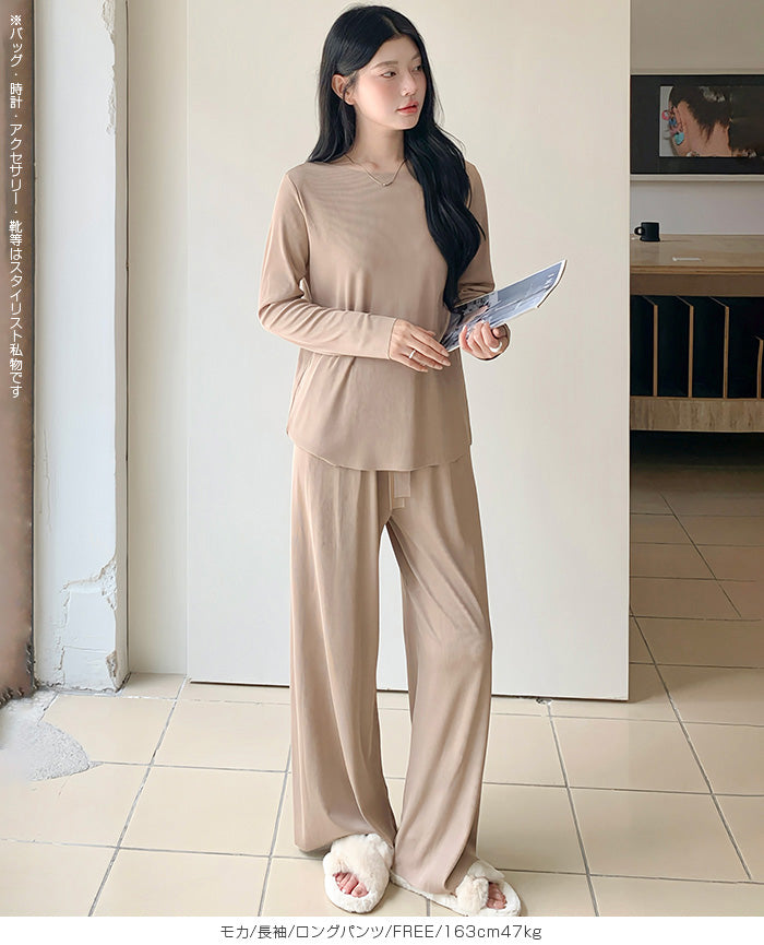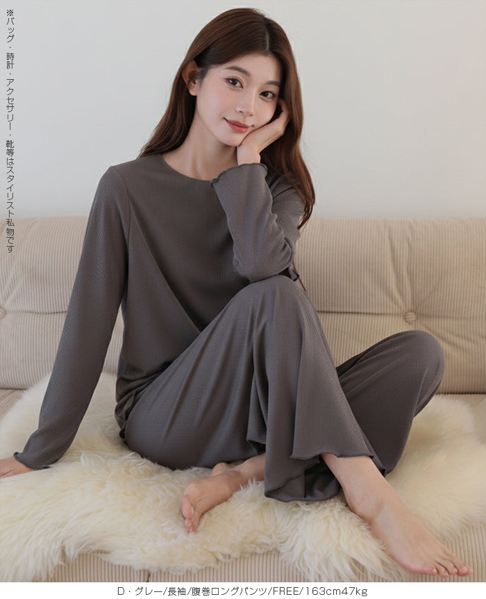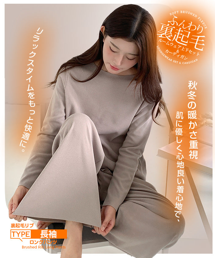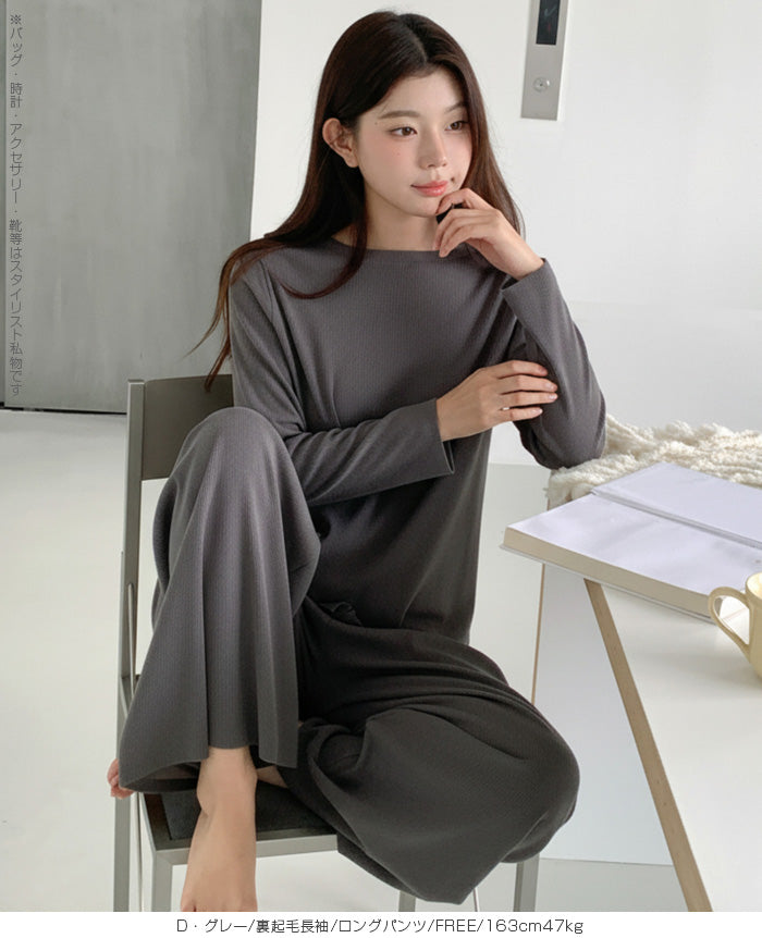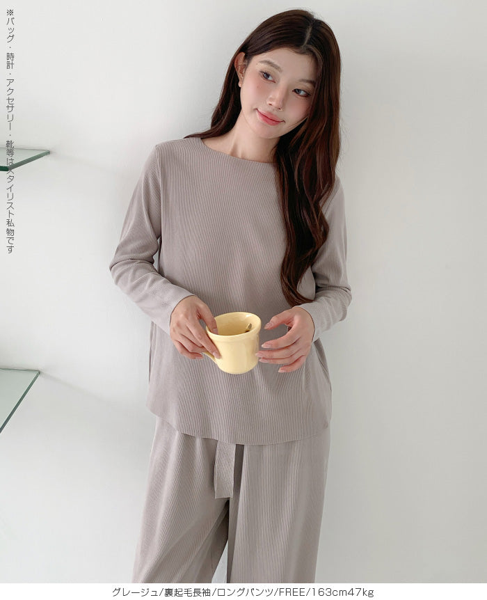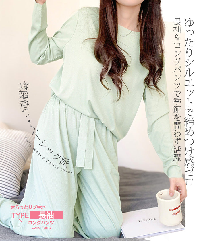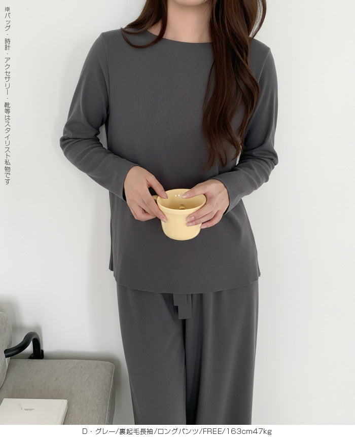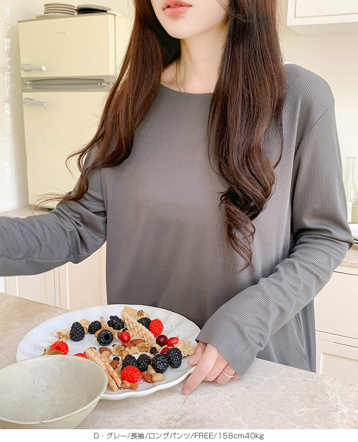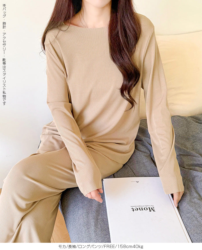 【 ルームウェア上下セット 】 “きれい見え”と"快適さ"を両立したリブ素材のルームウェア上下セット。 人気の長袖トップス×ロングパンツに、 秋冬にうれしい裏微起毛タイプが新登場。 肌側がほんのり起毛で暖かく、 表面の縦リブがすっきり見えを演出します。 パンツはウエストゴムでラクな穿き心地、 ワイドシルエットが体型を拾わず上品。 ラインナップは 【1. 裏起毛長袖ロングパンツ上下セット/2. 通常リブ長袖ロングパンツ上下セット/3. 通常リブカーディガン単品】の選べる3タイプ。 在宅ワークやリラックスタイム、 近所への外出にも使えるアイテムです。 《商品ポイント》 秋冬リブ裏微起毛タイプ追加:ふんわり保温で肌あたりやさしい。 選べる3タイプ:裏起毛セット/通常リブセット/通常リブカーディガン単品。 ウエストゴムのロングパンツ:締め付けにくく着脱ラク。 ワイドシルエット:脚のラインを拾わず体型カバー。 リブ素材×無地:縦見え効果でスッキリ、着回し自由。 お手入れ簡単:デイリーに洗えて乾きやすい。 《デザイン・シルエット》 長袖トップス:シンプルなネックラインで顔周りすっきり。 程よいゆとりのストレート身幅でインでもアウトでも様になる丈感。 パンツはフルレングスのワイドで、ルームでも外でもバランス◎。 無地ワントーンだから上下セットでも単品でもコーデしやすい。 《コーディネート提案》 ワンマイル:セット+コート×スニーカーで“外着見え”。 おうちリラックス:裏起毛セット+もこもこスリッパで冬もあったか。 《サイズ・カラーバリエーション》 サイズ:裏起毛長袖ロングパンツFREE/ 長袖ロングパンツFREE/ショートカーデFREE/ロングカーデFREE カラー:モカ/グレージュ/D・グレー/ライトグレー/ブラック/ピンク/グリーン |