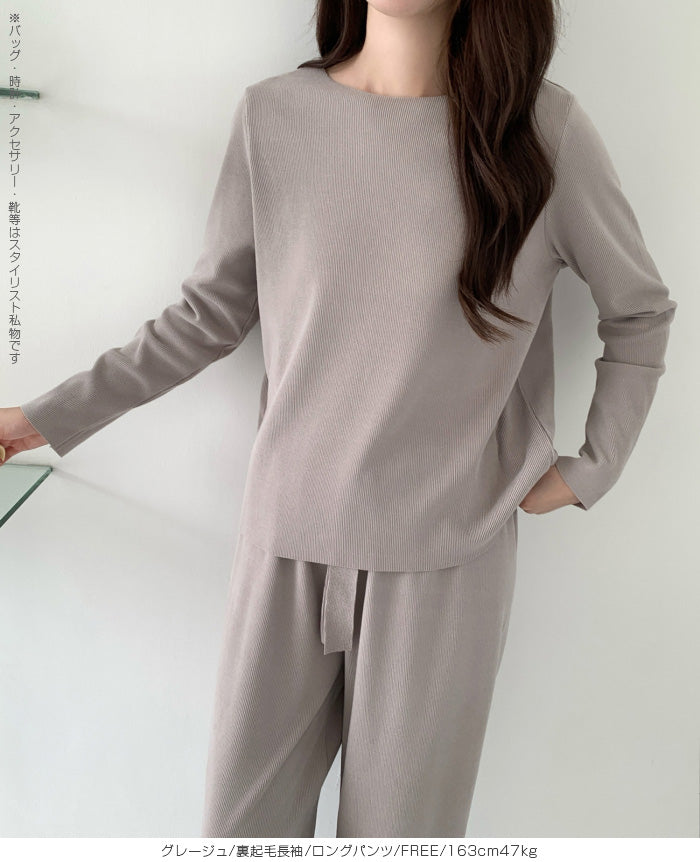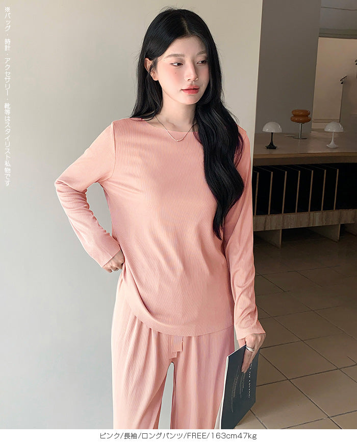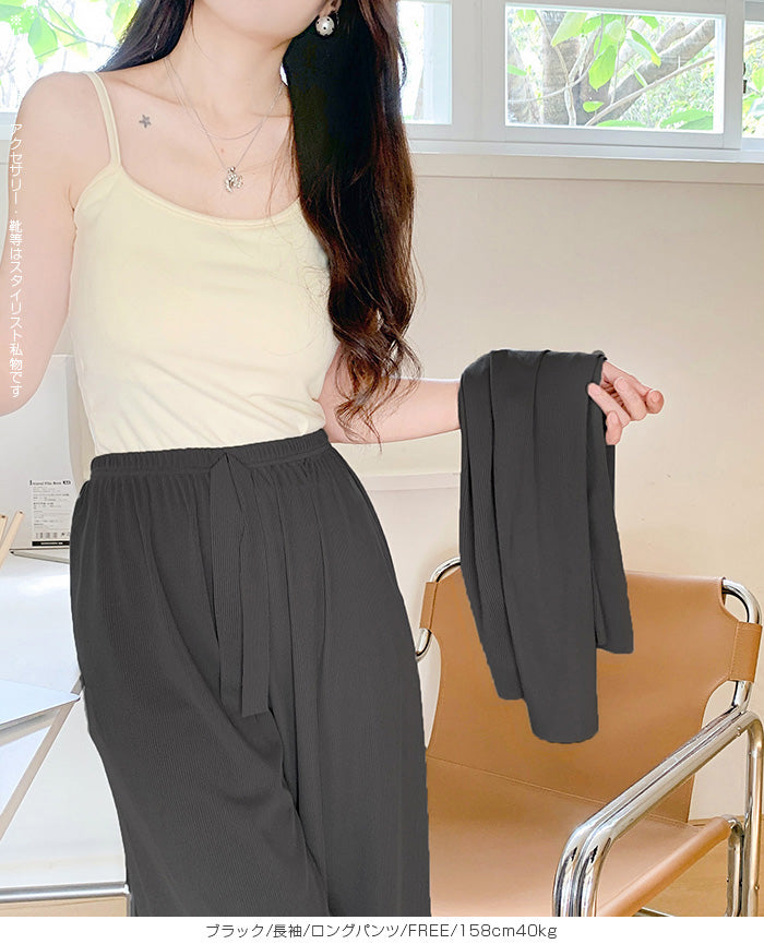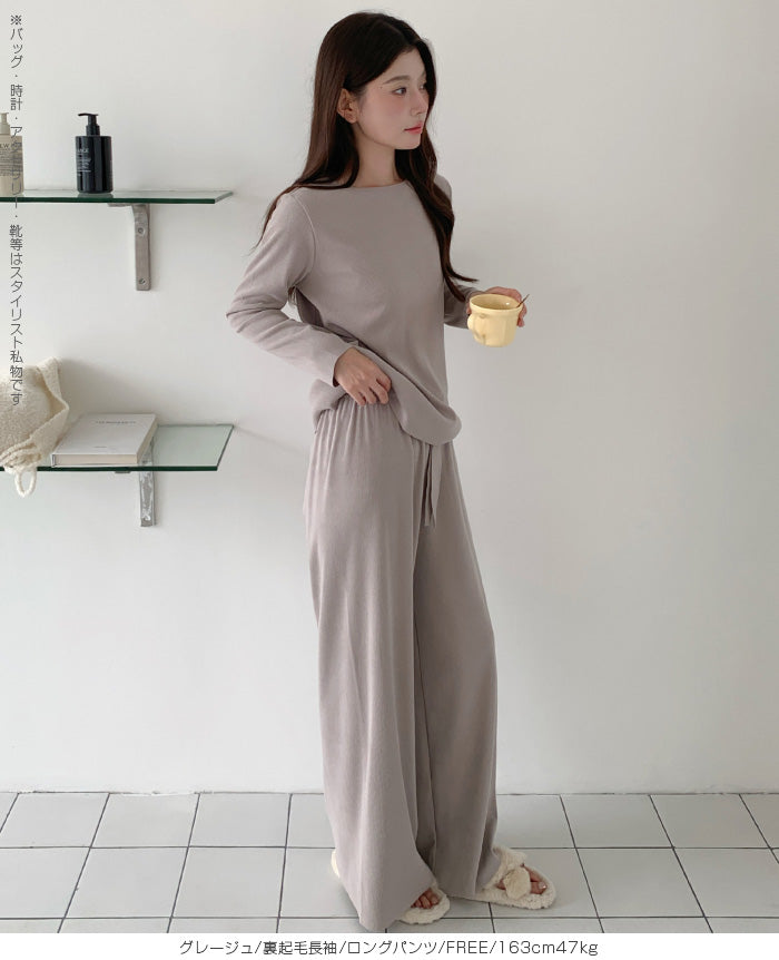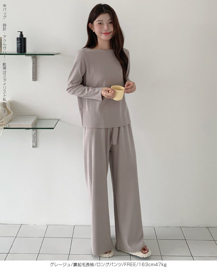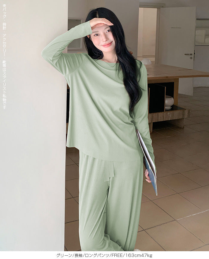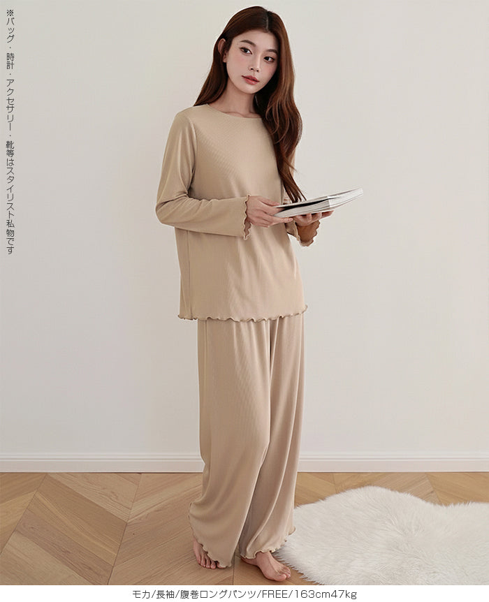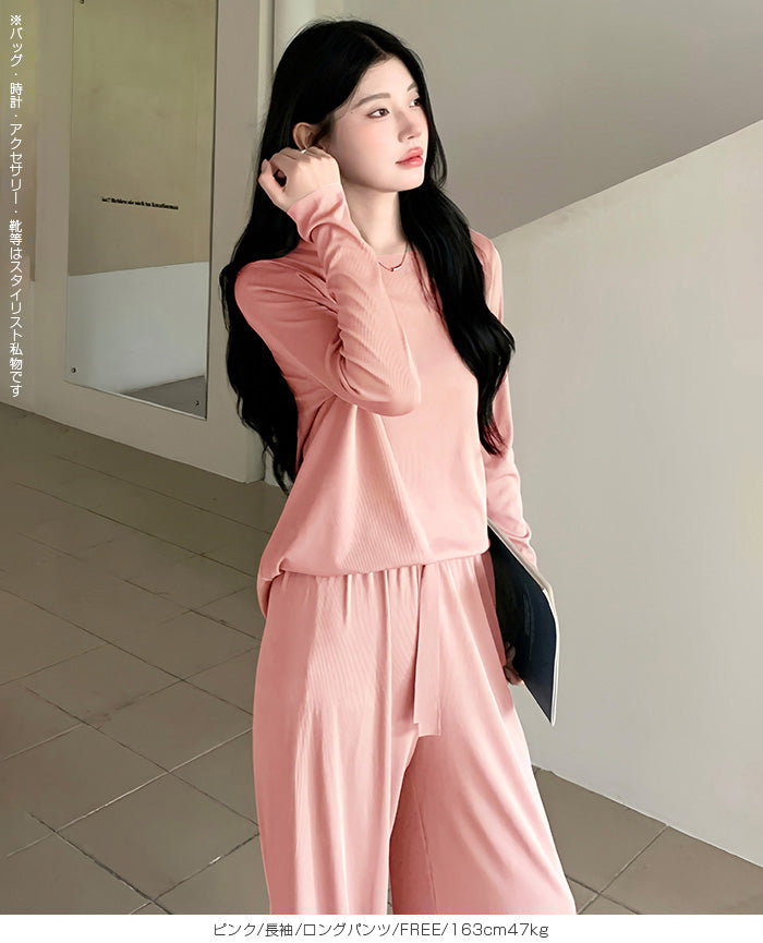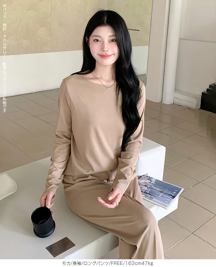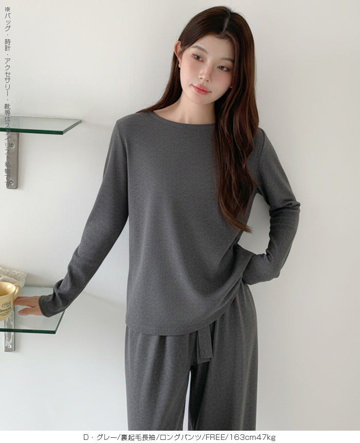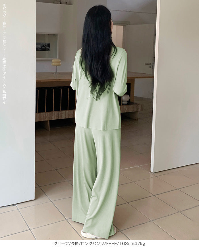 【 ルームウェア上下セット 】 “きれい見え”と"快適さ"を両立したリブ素材のルームウェア上下セット。 人気の長袖トップス×ロングパンツに、 秋冬にうれしい裏微起毛タイプが新登場。 肌側がほんのり起毛で暖かく、 表面の縦リブがすっきり見えを演出します。 パンツはウエストゴムでラクな穿き心地、 ワイドシルエットが体型を拾わず上品。 ラインナップは 【1. 裏起毛長袖ロングパンツ上下セット/2. 通常リブ長袖ロングパンツ上下セット/3. 通常リブカーディガン単品】の選べる3タイプ。 在宅ワークやリラックスタイム、 近所への外出にも使えるアイテムです。 《商品ポイント》 秋冬リブ裏微起毛タイプ追加:ふんわり保温で肌あたりやさしい。 選べる3タイプ:裏起毛セット/通常リブセット/通常リブカーディガン単品。 ウエストゴムのロングパンツ:締め付けにくく着脱ラク。 ワイドシルエット:脚のラインを拾わず体型カバー。 リブ素材×無地:縦見え効果でスッキリ、着回し自由。 お手入れ簡単:デイリーに洗えて乾きやすい。 《デザイン・シルエット》 長袖トップス:シンプルなネックラインで顔周りすっきり。 程よいゆとりのストレート身幅でインでもアウトでも様になる丈感。 パンツはフルレングスのワイドで、ルームでも外でもバランス◎。 無地ワントーンだから上下セットでも単品でもコーデしやすい。 《コーディネート提案》 ワンマイル:セット+コート×スニーカーで“外着見え”。 おうちリラックス:裏起毛セット+もこもこスリッパで冬もあったか。 《サイズ・カラーバリエーション》 サイズ:裏起毛長袖ロングパンツFREE/ 長袖ロングパンツFREE/ショートカーデFREE/ロングカーデFREE カラー:モカ/グレージュ/D・グレー/ライトグレー/ブラック/ピンク/グリーン |