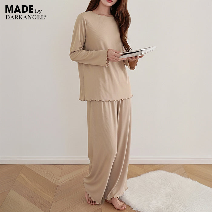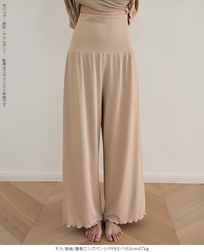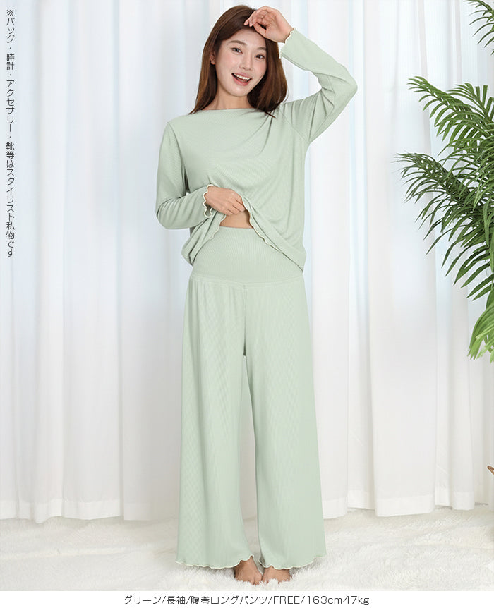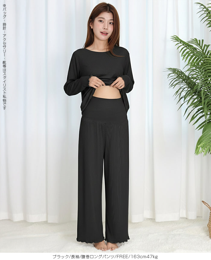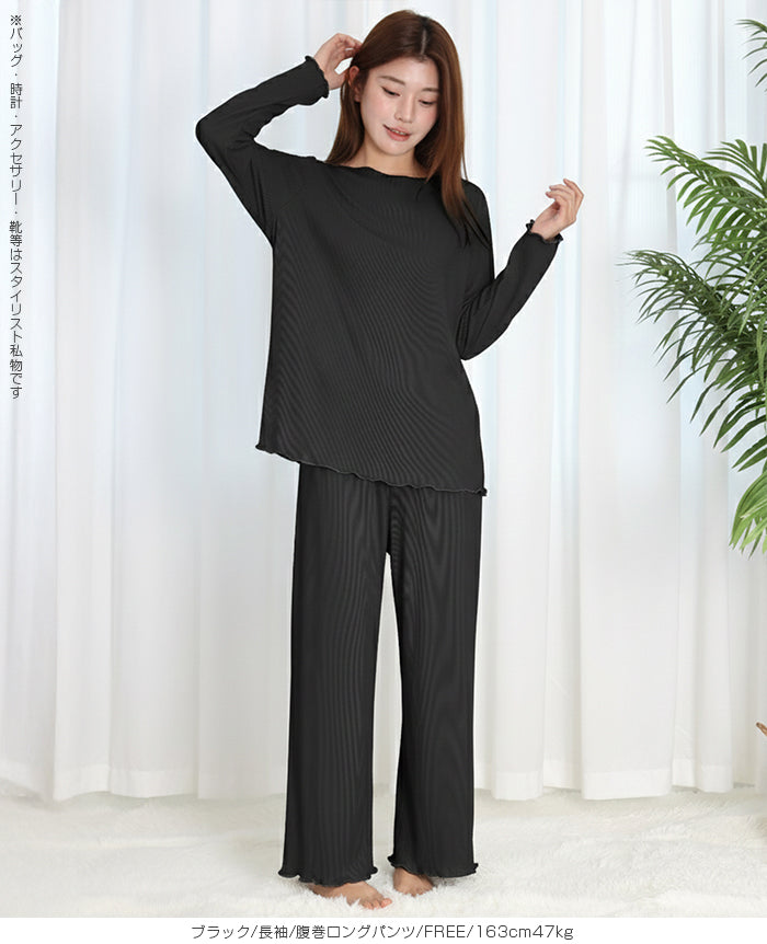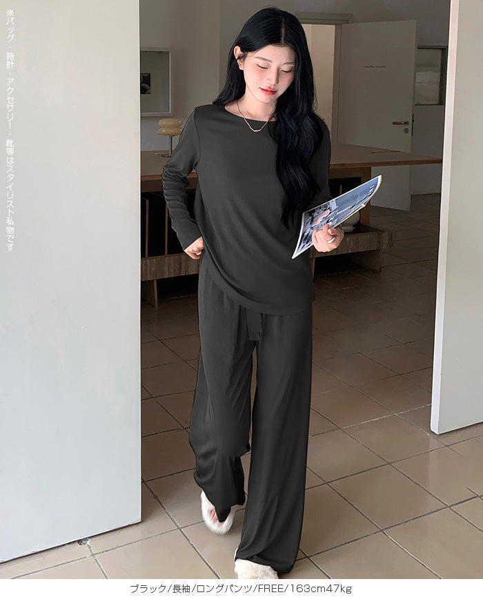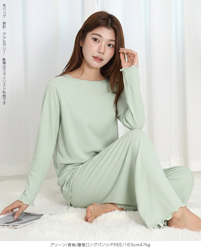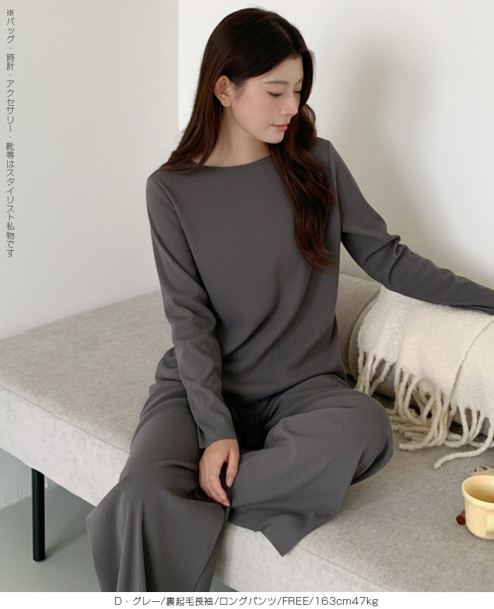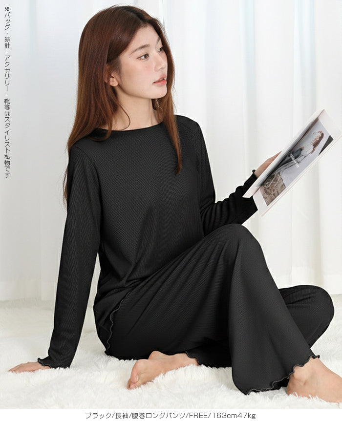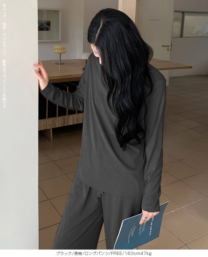 【 ルームウェア上下セット 】 “きれい見え”と"快適さ"を両立したリブ素材のルームウェア上下セット。 人気の長袖トップス×ロングパンツに、 秋冬にうれしい裏微起毛タイプが新登場。 肌側がほんのり起毛で暖かく、 表面の縦リブがすっきり見えを演出します。 パンツはウエストゴムでラクな穿き心地、 ワイドシルエットが体型を拾わず上品。 ラインナップは 【1. 裏起毛長袖ロングパンツ上下セット/2. 通常リブ長袖ロングパンツ上下セット/3. 通常リブカーディガン単品】の選べる3タイプ。 在宅ワークやリラックスタイム、 近所への外出にも使えるアイテムです。 《商品ポイント》 秋冬リブ裏微起毛タイプ追加:ふんわり保温で肌あたりやさしい。 選べる3タイプ:裏起毛セット/通常リブセット/通常リブカーディガン単品。 ウエストゴムのロングパンツ:締め付けにくく着脱ラク。 ワイドシルエット:脚のラインを拾わず体型カバー。 リブ素材×無地:縦見え効果でスッキリ、着回し自由。 お手入れ簡単:デイリーに洗えて乾きやすい。 《デザイン・シルエット》 長袖トップス:シンプルなネックラインで顔周りすっきり。 程よいゆとりのストレート身幅でインでもアウトでも様になる丈感。 パンツはフルレングスのワイドで、ルームでも外でもバランス◎。 無地ワントーンだから上下セットでも単品でもコーデしやすい。 《コーディネート提案》 ワンマイル:セット+コート×スニーカーで“外着見え”。 おうちリラックス:裏起毛セット+もこもこスリッパで冬もあったか。 《サイズ・カラーバリエーション》 サイズ:裏起毛長袖ロングパンツFREE/ 長袖ロングパンツFREE/ショートカーデFREE/ロングカーデFREE カラー:モカ/グレージュ/D・グレー/ライトグレー/ブラック/ピンク/グリーン |